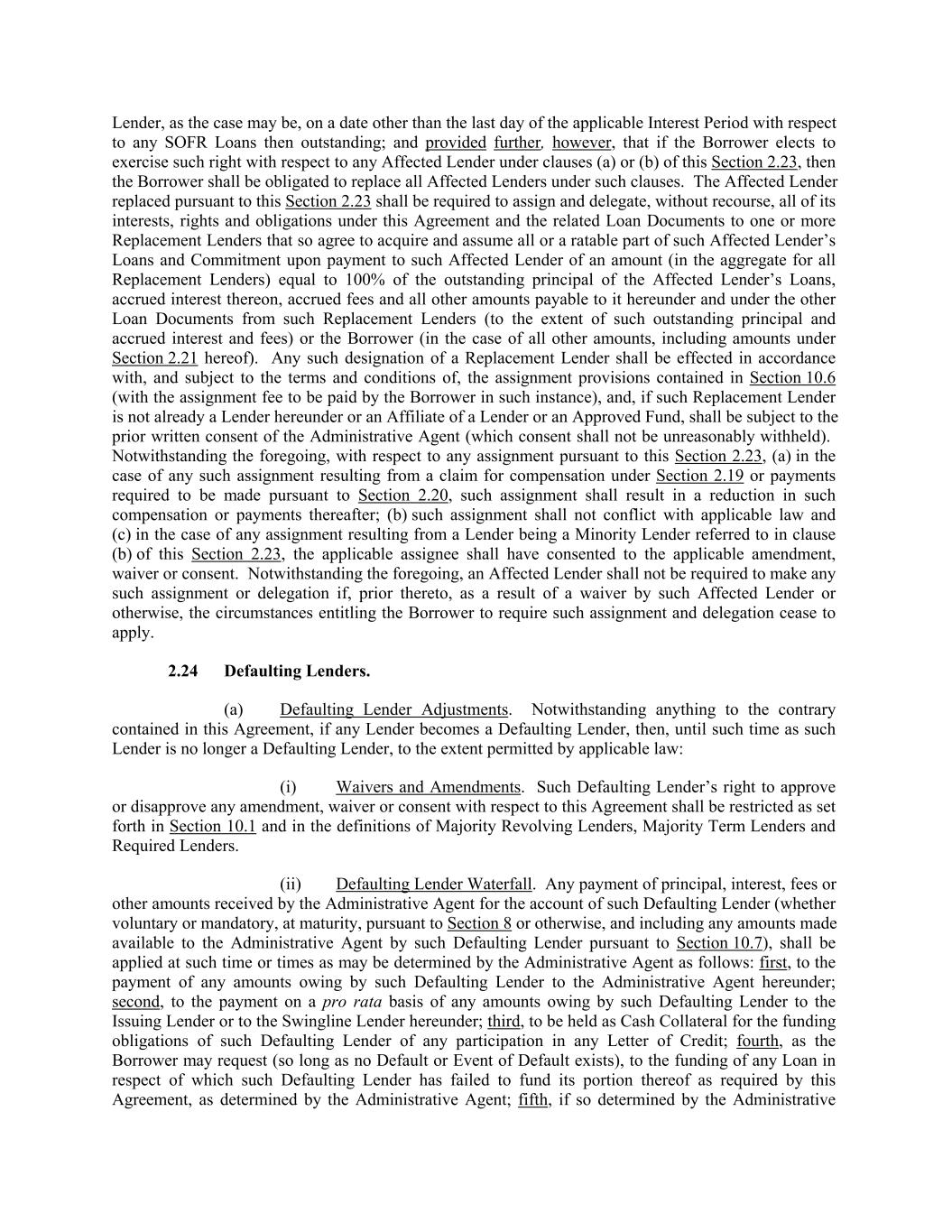 Lender, as the case may be, on a date other than the last day of the applicable Interest Period with respect to any SOFR Loans then outstanding; and provided further, however, that if the Borrower elects to exercise such right with respect to any Affected Lender under clauses (a) or (b) of this Section 2.23, then the Borrower shall be obligated to replace all Affected Lenders under such clauses. The Affected Lender replaced pursuant to this Section 2.23 shall be required to assign and delegate, without recourse, all of its interests, rights and obligations under this Agreement and the related Loan Documents to one or more Replacement Lenders that so agree to acquire and assume all or a ratable part of such Affected Lender’s Loans and Commitment upon payment to such Affected Lender of an amount (in the aggregate for all Replacement Lenders) equal to 100% of the outstanding principal of the Affected Lender’s Loans, accrued interest thereon, accrued fees and all other amounts payable to it hereunder and under the other Loan Documents from such Replacement Lenders (to the extent of such outstanding principal and accrued interest and fees) or the Borrower (in the case of all other amounts, including amounts under Section 2.21 hereof). Any such designation of a Replacement Lender shall be effected in accordance with, and subject to the terms and conditions of, the assignment provisions contained in Section 10.6 (with the assignment fee to be paid by the Borrower in such instance), and, if such Replacement Lender is not already a Lender hereunder or an Affiliate of a Lender or an Approved Fund, shall be subject to the prior written consent of the Administrative Agent (which consent shall not be unreasonably withheld). Notwithstanding the foregoing, with respect to any assignment pursuant to this Section 2.23, (a) in the case of any such assignment resulting from a claim for compensation under Section 2.19 or payments required to be made pursuant to Section 2.20, such assignment shall result in a reduction in such compensation or payments thereafter; (b) such assignment shall not conflict with applicable law and (c) in the case of any assignment resulting from a Lender being a Minority Lender referred to in clause (b) of this Section 2.23, the applicable assignee shall have consented to the applicable amendment, waiver or consent. Notwithstanding the foregoing, an Affected Lender shall not be required to make any such assignment or delegation if, prior thereto, as a result of a waiver by such Affected Lender or otherwise, the circumstances entitling the Borrower to require such assignment and delegation cease to apply. 2.24 Defaulting Lenders. (a) Defaulting Lender Adjustments. Notwithstanding anything to the contrary contained in this Agreement, if any Lender becomes a Defaulting Lender, then, until such time as such Lender is no longer a Defaulting Lender, to the extent permitted by applicable law: (i) Waivers and Amendments. Such Defaulting Lender’s right to approve or disapprove any amendment, waiver or consent with respect to this Agreement shall be restricted as set forth in Section 10.1 and in the definitions of Majority Revolving Lenders, Majority Term Lenders and Required Lenders. (ii) Defaulting Lender Waterfall. Any payment of principal, interest, fees or other amounts received by the Administrative Agent for the account of such Defaulting Lender (whether voluntary or mandatory, at maturity, pursuant to Section 8 or otherwise, and including any amounts made available to the Administrative Agent by such Defaulting Lender pursuant to Section 10.7), shall be applied at such time or times as may be determined by the Administrative Agent as follows: first, to the payment of any amounts owing by such Defaulting Lender to the Administrative Agent hereunder; second, to the payment on a pro rata basis of any amounts owing by such Defaulting Lender to the Issuing Lender or to the Swingline Lender hereunder; third, to be held as Cash Collateral for the funding obligations of such Defaulting Lender of any participation in any Letter of Credit; fourth, as the Borrower may request (so long as no Default or Event of Default exists), to the funding of any Loan in respect of which such Defaulting Lender has failed to fund its portion thereof as required by this Agreement, as determined by the Administrative Agent; fifth, if so determined by the Administrative