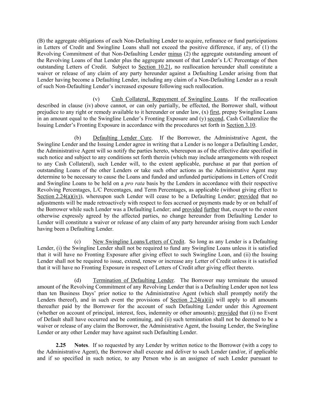 (B) the aggregate obligations of each Non-Defaulting Lender to acquire, refinance or fund participations in Letters of Credit and Swingline Loans shall not exceed the positive difference, if any, of (1) the Revolving Commitment of that Non-Defaulting Lender minus (2) the aggregate outstanding amount of the Revolving Loans of that Lender plus the aggregate amount of that Lender’s L/C Percentage of then outstanding Letters of Credit. Subject to Section 10.21, no reallocation hereunder shall constitute a waiver or release of any claim of any party hereunder against a Defaulting Lender arising from that Lender having become a Defaulting Lender, including any claim of a Non-Defaulting Lender as a result of such Non-Defaulting Lender’s increased exposure following such reallocation. (v) Cash Collateral, Repayment of Swingline Loans. If the reallocation described in clause (iv) above cannot, or can only partially, be effected, the Borrower shall, without prejudice to any right or remedy available to it hereunder or under law, (x) first, prepay Swingline Loans in an amount equal to the Swingline Lender’s Fronting Exposure and (y) second, Cash Collateralize the Issuing Lender’s Fronting Exposure in accordance with the procedures set forth in Section 3.10. (b) Defaulting Lender Cure. If the Borrower, the Administrative Agent, the Swingline Lender and the Issuing Lender agree in writing that a Lender is no longer a Defaulting Lender, the Administrative Agent will so notify the parties hereto, whereupon as of the effective date specified in such notice and subject to any conditions set forth therein (which may include arrangements with respect to any Cash Collateral), such Lender will, to the extent applicable, purchase at par that portion of outstanding Loans of the other Lenders or take such other actions as the Administrative Agent may determine to be necessary to cause the Loans and funded and unfunded participations in Letters of Credit and Swingline Loans to be held on a pro rata basis by the Lenders in accordance with their respective Revolving Percentages, L/C Percentages, and Term Percentages, as applicable (without giving effect to Section 2.24(a)(iv)), whereupon such Lender will cease to be a Defaulting Lender; provided that no adjustments will be made retroactively with respect to fees accrued or payments made by or on behalf of the Borrower while such Lender was a Defaulting Lender; and provided further that, except to the extent otherwise expressly agreed by the affected parties, no change hereunder from Defaulting Lender to Lender will constitute a waiver or release of any claim of any party hereunder arising from such Lender having been a Defaulting Lender. (c) New Swingline Loans/Letters of Credit. So long as any Lender is a Defaulting Lender, (i) the Swingline Lender shall not be required to fund any Swingline Loans unless it is satisfied that it will have no Fronting Exposure after giving effect to such Swingline Loan, and (ii) the Issuing Lender shall not be required to issue, extend, renew or increase any Letter of Credit unless it is satisfied that it will have no Fronting Exposure in respect of Letters of Credit after giving effect thereto. (d) Termination of Defaulting Lender. The Borrower may terminate the unused amount of the Revolving Commitment of any Revolving Lender that is a Defaulting Lender upon not less than ten Business Days’ prior notice to the Administrative Agent (which shall promptly notify the Lenders thereof), and in such event the provisions of Section 2.24(a)(ii) will apply to all amounts thereafter paid by the Borrower for the account of such Defaulting Lender under this Agreement (whether on account of principal, interest, fees, indemnity or other amounts); provided that (i) no Event of Default shall have occurred and be continuing, and (ii) such termination shall not be deemed to be a waiver or release of any claim the Borrower, the Administrative Agent, the Issuing Lender, the Swingline Lender or any other Lender may have against such Defaulting Lender. 2.25 Notes. If so requested by any Lender by written notice to the Borrower (with a copy to the Administrative Agent), the Borrower shall execute and deliver to such Lender (and/or, if applicable and if so specified in such notice, to any Person who is an assignee of such Lender pursuant to