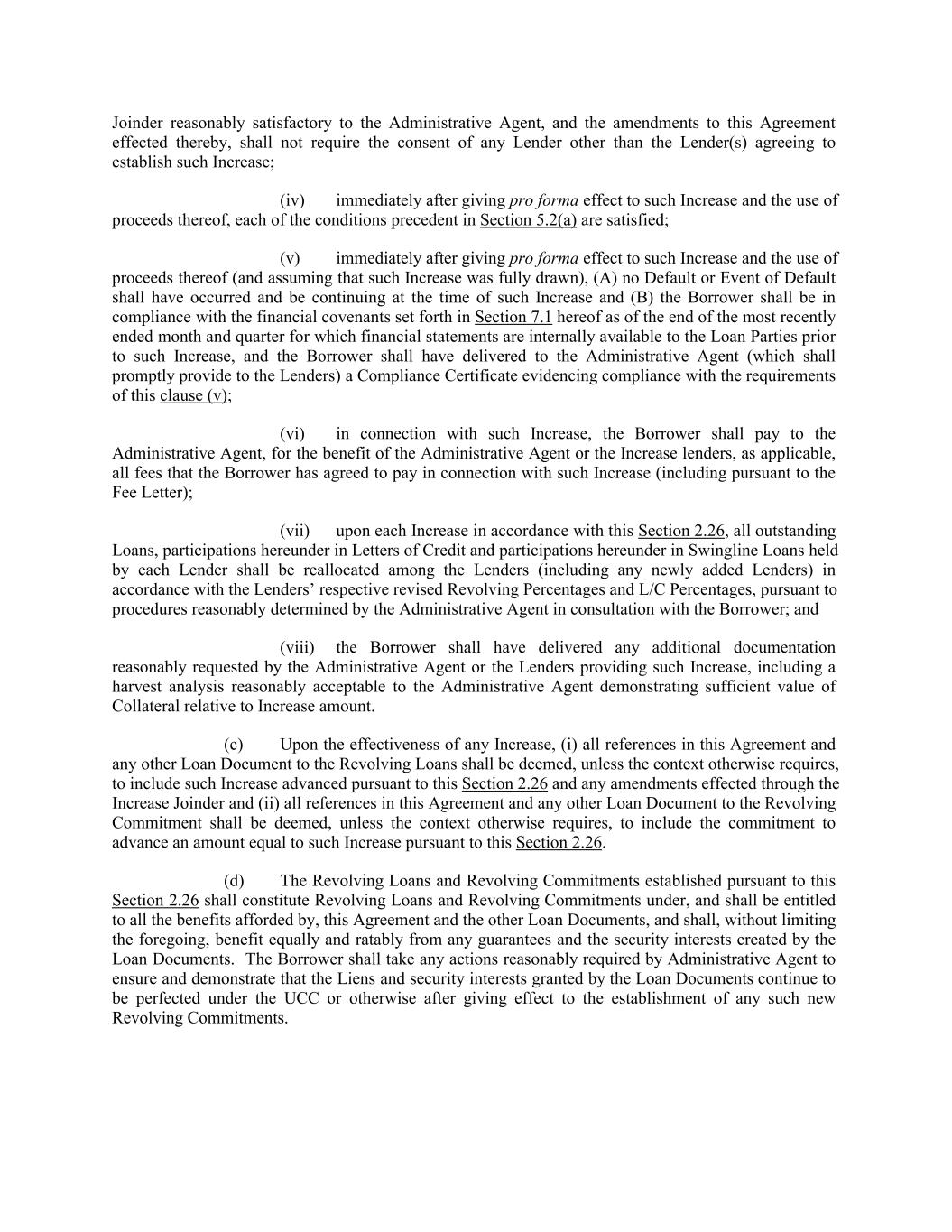 Joinder reasonably satisfactory to the Administrative Agent, and the amendments to this Agreement effected thereby, shall not require the consent of any Lender other than the Lender(s) agreeing to establish such Increase; (iv) immediately after giving pro forma effect to such Increase and the use of proceeds thereof, each of the conditions precedent in Section 5.2(a) are satisfied; (v) immediately after giving pro forma effect to such Increase and the use of proceeds thereof (and assuming that such Increase was fully drawn), (A) no Default or Event of Default shall have occurred and be continuing at the time of such Increase and (B) the Borrower shall be in compliance with the financial covenants set forth in Section 7.1 hereof as of the end of the most recently ended month and quarter for which financial statements are internally available to the Loan Parties prior to such Increase, and the Borrower shall have delivered to the Administrative Agent (which shall promptly provide to the Lenders) a Compliance Certificate evidencing compliance with the requirements of this clause (v); (vi) in connection with such Increase, the Borrower shall pay to the Administrative Agent, for the benefit of the Administrative Agent or the Increase lenders, as applicable, all fees that the Borrower has agreed to pay in connection with such Increase (including pursuant to the Fee Letter); (vii) upon each Increase in accordance with this Section 2.26, all outstanding Loans, participations hereunder in Letters of Credit and participations hereunder in Swingline Loans held by each Lender shall be reallocated among the Lenders (including any newly added Lenders) in accordance with the Lenders’ respective revised Revolving Percentages and L/C Percentages, pursuant to procedures reasonably determined by the Administrative Agent in consultation with the Borrower; and (viii) the Borrower shall have delivered any additional documentation reasonably requested by the Administrative Agent or the Lenders providing such Increase, including a harvest analysis reasonably acceptable to the Administrative Agent demonstrating sufficient value of Collateral relative to Increase amount. (c) Upon the effectiveness of any Increase, (i) all references in this Agreement and any other Loan Document to the Revolving Loans shall be deemed, unless the context otherwise requires, to include such Increase advanced pursuant to this Section 2.26 and any amendments effected through the Increase Joinder and (ii) all references in this Agreement and any other Loan Document to the Revolving Commitment shall be deemed, unless the context otherwise requires, to include the commitment to advance an amount equal to such Increase pursuant to this Section 2.26. (d) The Revolving Loans and Revolving Commitments established pursuant to this Section 2.26 shall constitute Revolving Loans and Revolving Commitments under, and shall be entitled to all the benefits afforded by, this Agreement and the other Loan Documents, and shall, without limiting the foregoing, benefit equally and ratably from any guarantees and the security interests created by the Loan Documents. The Borrower shall take any actions reasonably required by Administrative Agent to ensure and demonstrate that the Liens and security interests granted by the Loan Documents continue to be perfected under the UCC or otherwise after giving effect to the establishment of any such new Revolving Commitments.