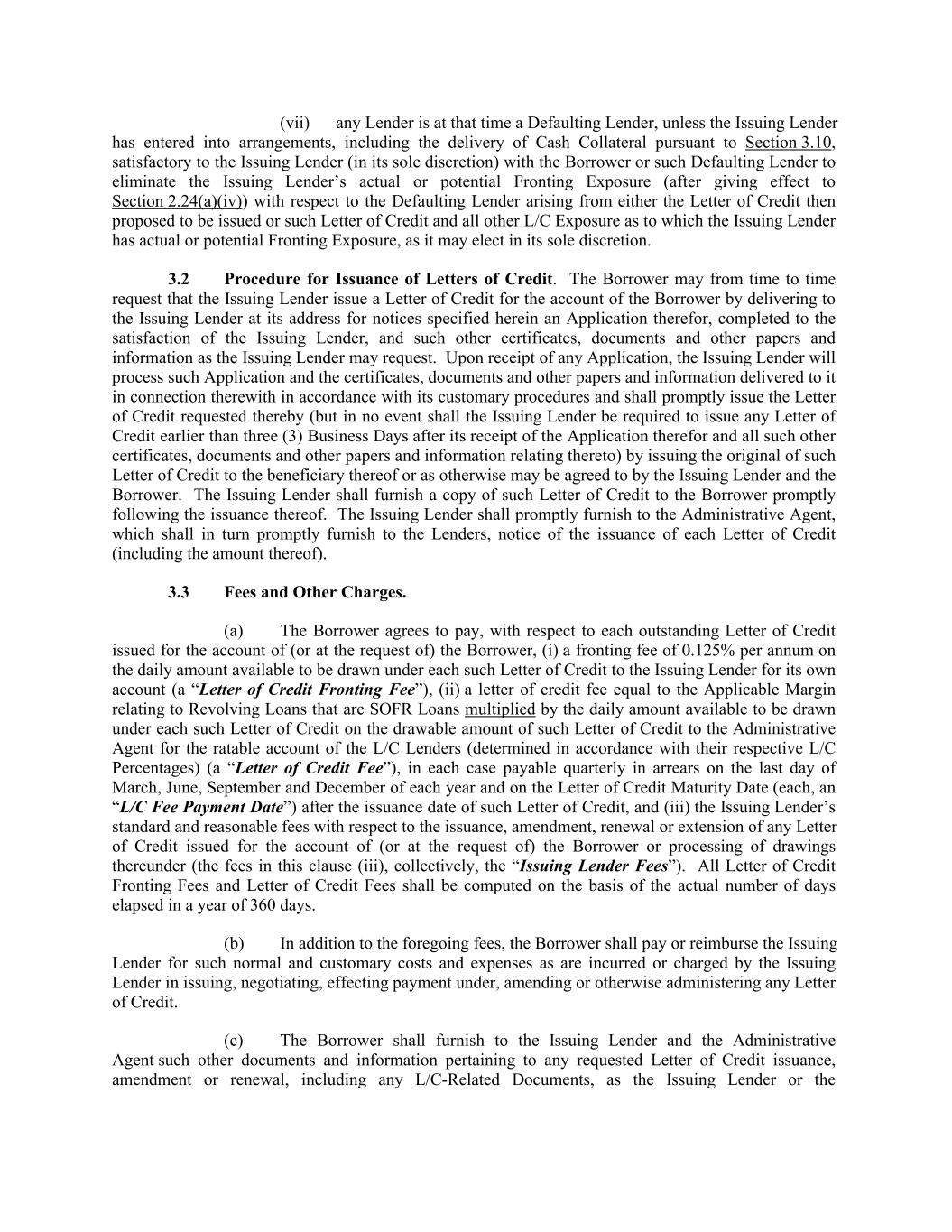 (vii) any Lender is at that time a Defaulting Lender, unless the Issuing Lender has entered into arrangements, including the delivery of Cash Collateral pursuant to Section 3.10, satisfactory to the Issuing Lender (in its sole discretion) with the Borrower or such Defaulting Lender to eliminate the Issuing Lender’s actual or potential Fronting Exposure (after giving effect to Section 2.24(a)(iv)) with respect to the Defaulting Lender arising from either the Letter of Credit then proposed to be issued or such Letter of Credit and all other L/C Exposure as to which the Issuing Lender has actual or potential Fronting Exposure, as it may elect in its sole discretion. 3.2 Procedure for Issuance of Letters of Credit. The Borrower may from time to time request that the Issuing Lender issue a Letter of Credit for the account of the Borrower by delivering to the Issuing Lender at its address for notices specified herein an Application therefor, completed to the satisfaction of the Issuing Lender, and such other certificates, documents and other papers and information as the Issuing Lender may request. Upon receipt of any Application, the Issuing Lender will process such Application and the certificates, documents and other papers and information delivered to it in connection therewith in accordance with its customary procedures and shall promptly issue the Letter of Credit requested thereby (but in no event shall the Issuing Lender be required to issue any Letter of Credit earlier than three (3) Business Days after its receipt of the Application therefor and all such other certificates, documents and other papers and information relating thereto) by issuing the original of such Letter of Credit to the beneficiary thereof or as otherwise may be agreed to by the Issuing Lender and the Borrower. The Issuing Lender shall furnish a copy of such Letter of Credit to the Borrower promptly following the issuance thereof. The Issuing Lender shall promptly furnish to the Administrative Agent, which shall in turn promptly furnish to the Lenders, notice of the issuance of each Letter of Credit (including the amount thereof). 3.3 Fees and Other Charges. (a) The Borrower agrees to pay, with respect to each outstanding Letter of Credit issued for the account of (or at the request of) the Borrower, (i) a fronting fee of 0.125% per annum on the daily amount available to be drawn under each such Letter of Credit to the Issuing Lender for its own account (a “Letter of Credit Fronting Fee”), (ii) a letter of credit fee equal to the Applicable Margin relating to Revolving Loans that are SOFR Loans multiplied by the daily amount available to be drawn under each such Letter of Credit on the drawable amount of such Letter of Credit to the Administrative Agent for the ratable account of the L/C Lenders (determined in accordance with their respective L/C Percentages) (a “Letter of Credit Fee”), in each case payable quarterly in arrears on the last day of March, June, September and December of each year and on the Letter of Credit Maturity Date (each, an “L/C Fee Payment Date”) after the issuance date of such Letter of Credit, and (iii) the Issuing Lender’s standard and reasonable fees with respect to the issuance, amendment, renewal or extension of any Letter of Credit issued for the account of (or at the request of) the Borrower or processing of drawings thereunder (the fees in this clause (iii), collectively, the “Issuing Lender Fees”). All Letter of Credit Fronting Fees and Letter of Credit Fees shall be computed on the basis of the actual number of days elapsed in a year of 360 days. (b) In addition to the foregoing fees, the Borrower shall pay or reimburse the Issuing Lender for such normal and customary costs and expenses as are incurred or charged by the Issuing Lender in issuing, negotiating, effecting payment under, amending or otherwise administering any Letter of Credit. (c) The Borrower shall furnish to the Issuing Lender and the Administrative Agent such other documents and information pertaining to any requested Letter of Credit issuance, amendment or renewal, including any L/C-Related Documents, as the Issuing Lender or the