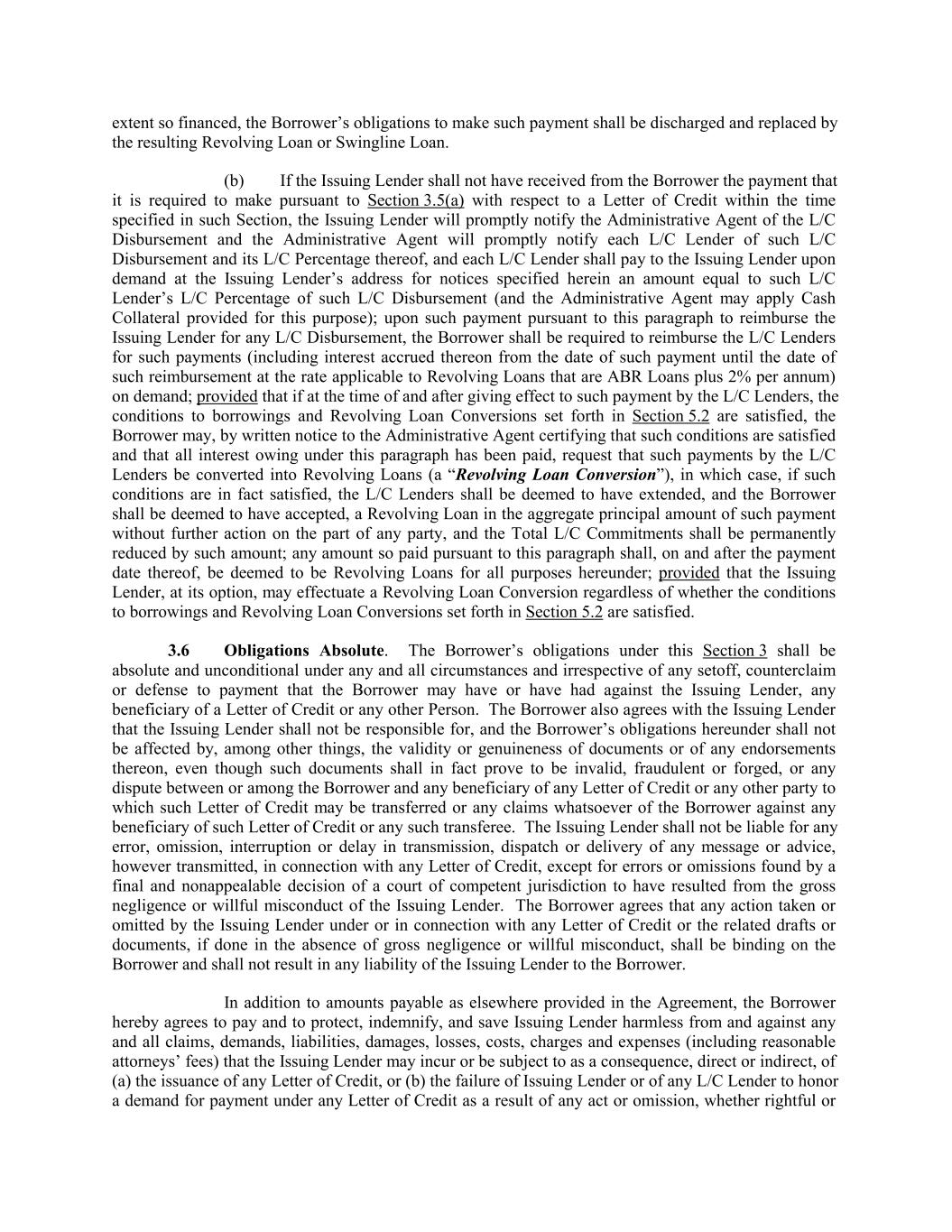 extent so financed, the Borrower’s obligations to make such payment shall be discharged and replaced by the resulting Revolving Loan or Swingline Loan. (b) If the Issuing Lender shall not have received from the Borrower the payment that it is required to make pursuant to Section 3.5(a) with respect to a Letter of Credit within the time specified in such Section, the Issuing Lender will promptly notify the Administrative Agent of the L/C Disbursement and the Administrative Agent will promptly notify each L/C Lender of such L/C Disbursement and its L/C Percentage thereof, and each L/C Lender shall pay to the Issuing Lender upon demand at the Issuing Lender’s address for notices specified herein an amount equal to such L/C Lender’s L/C Percentage of such L/C Disbursement (and the Administrative Agent may apply Cash Collateral provided for this purpose); upon such payment pursuant to this paragraph to reimburse the Issuing Lender for any L/C Disbursement, the Borrower shall be required to reimburse the L/C Lenders for such payments (including interest accrued thereon from the date of such payment until the date of such reimbursement at the rate applicable to Revolving Loans that are ABR Loans plus 2% per annum) on demand; provided that if at the time of and after giving effect to such payment by the L/C Lenders, the conditions to borrowings and Revolving Loan Conversions set forth in Section 5.2 are satisfied, the Borrower may, by written notice to the Administrative Agent certifying that such conditions are satisfied and that all interest owing under this paragraph has been paid, request that such payments by the L/C Lenders be converted into Revolving Loans (a “Revolving Loan Conversion”), in which case, if such conditions are in fact satisfied, the L/C Lenders shall be deemed to have extended, and the Borrower shall be deemed to have accepted, a Revolving Loan in the aggregate principal amount of such payment without further action on the part of any party, and the Total L/C Commitments shall be permanently reduced by such amount; any amount so paid pursuant to this paragraph shall, on and after the payment date thereof, be deemed to be Revolving Loans for all purposes hereunder; provided that the Issuing Lender, at its option, may effectuate a Revolving Loan Conversion regardless of whether the conditions to borrowings and Revolving Loan Conversions set forth in Section 5.2 are satisfied. 3.6 Obligations Absolute. The Borrower’s obligations under this Section 3 shall be absolute and unconditional under any and all circumstances and irrespective of any setoff, counterclaim or defense to payment that the Borrower may have or have had against the Issuing Lender, any beneficiary of a Letter of Credit or any other Person. The Borrower also agrees with the Issuing Lender that the Issuing Lender shall not be responsible for, and the Borrower’s obligations hereunder shall not be affected by, among other things, the validity or genuineness of documents or of any endorsements thereon, even though such documents shall in fact prove to be invalid, fraudulent or forged, or any dispute between or among the Borrower and any beneficiary of any Letter of Credit or any other party to which such Letter of Credit may be transferred or any claims whatsoever of the Borrower against any beneficiary of such Letter of Credit or any such transferee. The Issuing Lender shall not be liable for any error, omission, interruption or delay in transmission, dispatch or delivery of any message or advice, however transmitted, in connection with any Letter of Credit, except for errors or omissions found by a final and nonappealable decision of a court of competent jurisdiction to have resulted from the gross negligence or willful misconduct of the Issuing Lender. The Borrower agrees that any action taken or omitted by the Issuing Lender under or in connection with any Letter of Credit or the related drafts or documents, if done in the absence of gross negligence or willful misconduct, shall be binding on the Borrower and shall not result in any liability of the Issuing Lender to the Borrower. In addition to amounts payable as elsewhere provided in the Agreement, the Borrower hereby agrees to pay and to protect, indemnify, and save Issuing Lender harmless from and against any and all claims, demands, liabilities, damages, losses, costs, charges and expenses (including reasonable attorneys’ fees) that the Issuing Lender may incur or be subject to as a consequence, direct or indirect, of (a) the issuance of any Letter of Credit, or (b) the failure of Issuing Lender or of any L/C Lender to honor a demand for payment under any Letter of Credit as a result of any act or omission, whether rightful or