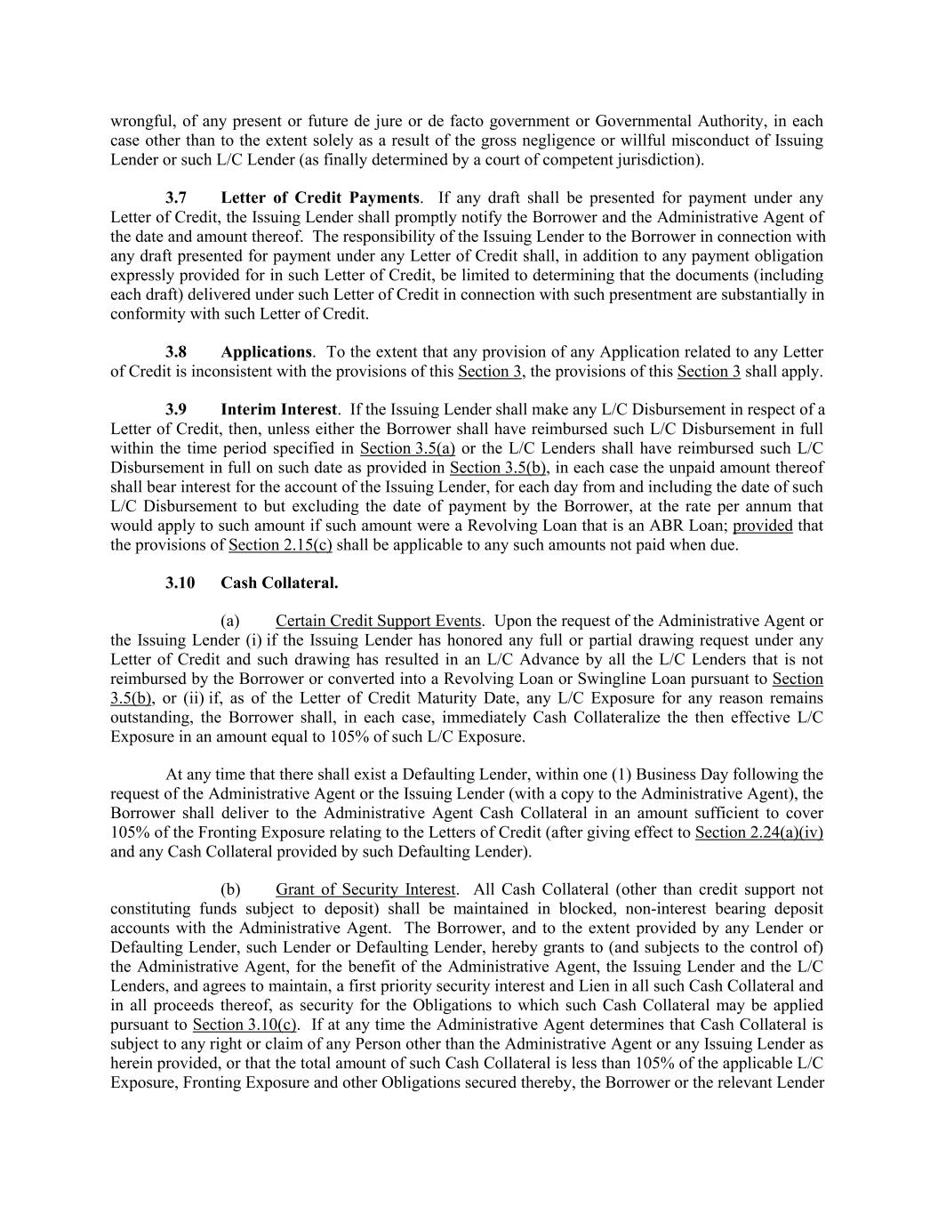 wrongful, of any present or future de jure or de facto government or Governmental Authority, in each case other than to the extent solely as a result of the gross negligence or willful misconduct of Issuing Lender or such L/C Lender (as finally determined by a court of competent jurisdiction). 3.7 Letter of Credit Payments. If any draft shall be presented for payment under any Letter of Credit, the Issuing Lender shall promptly notify the Borrower and the Administrative Agent of the date and amount thereof. The responsibility of the Issuing Lender to the Borrower in connection with any draft presented for payment under any Letter of Credit shall, in addition to any payment obligation expressly provided for in such Letter of Credit, be limited to determining that the documents (including each draft) delivered under such Letter of Credit in connection with such presentment are substantially in conformity with such Letter of Credit. 3.8 Applications. To the extent that any provision of any Application related to any Letter of Credit is inconsistent with the provisions of this Section 3, the provisions of this Section 3 shall apply. 3.9 Interim Interest. If the Issuing Lender shall make any L/C Disbursement in respect of a Letter of Credit, then, unless either the Borrower shall have reimbursed such L/C Disbursement in full within the time period specified in Section 3.5(a) or the L/C Lenders shall have reimbursed such L/C Disbursement in full on such date as provided in Section 3.5(b), in each case the unpaid amount thereof shall bear interest for the account of the Issuing Lender, for each day from and including the date of such L/C Disbursement to but excluding the date of payment by the Borrower, at the rate per annum that would apply to such amount if such amount were a Revolving Loan that is an ABR Loan; provided that the provisions of Section 2.15(c) shall be applicable to any such amounts not paid when due. 3.10 Cash Collateral. (a) Certain Credit Support Events. Upon the request of the Administrative Agent or the Issuing Lender (i) if the Issuing Lender has honored any full or partial drawing request under any Letter of Credit and such drawing has resulted in an L/C Advance by all the L/C Lenders that is not reimbursed by the Borrower or converted into a Revolving Loan or Swingline Loan pursuant to Section 3.5(b), or (ii) if, as of the Letter of Credit Maturity Date, any L/C Exposure for any reason remains outstanding, the Borrower shall, in each case, immediately Cash Collateralize the then effective L/C Exposure in an amount equal to 105% of such L/C Exposure. At any time that there shall exist a Defaulting Lender, within one (1) Business Day following the request of the Administrative Agent or the Issuing Lender (with a copy to the Administrative Agent), the Borrower shall deliver to the Administrative Agent Cash Collateral in an amount sufficient to cover 105% of the Fronting Exposure relating to the Letters of Credit (after giving effect to Section 2.24(a)(iv) and any Cash Collateral provided by such Defaulting Lender). (b) Grant of Security Interest. All Cash Collateral (other than credit support not constituting funds subject to deposit) shall be maintained in blocked, non-interest bearing deposit accounts with the Administrative Agent. The Borrower, and to the extent provided by any Lender or Defaulting Lender, such Lender or Defaulting Lender, hereby grants to (and subjects to the control of) the Administrative Agent, for the benefit of the Administrative Agent, the Issuing Lender and the L/C Lenders, and agrees to maintain, a first priority security interest and Lien in all such Cash Collateral and in all proceeds thereof, as security for the Obligations to which such Cash Collateral may be applied pursuant to Section 3.10(c). If at any time the Administrative Agent determines that Cash Collateral is subject to any right or claim of any Person other than the Administrative Agent or any Issuing Lender as herein provided, or that the total amount of such Cash Collateral is less than 105% of the applicable L/C Exposure, Fronting Exposure and other Obligations secured thereby, the Borrower or the relevant Lender