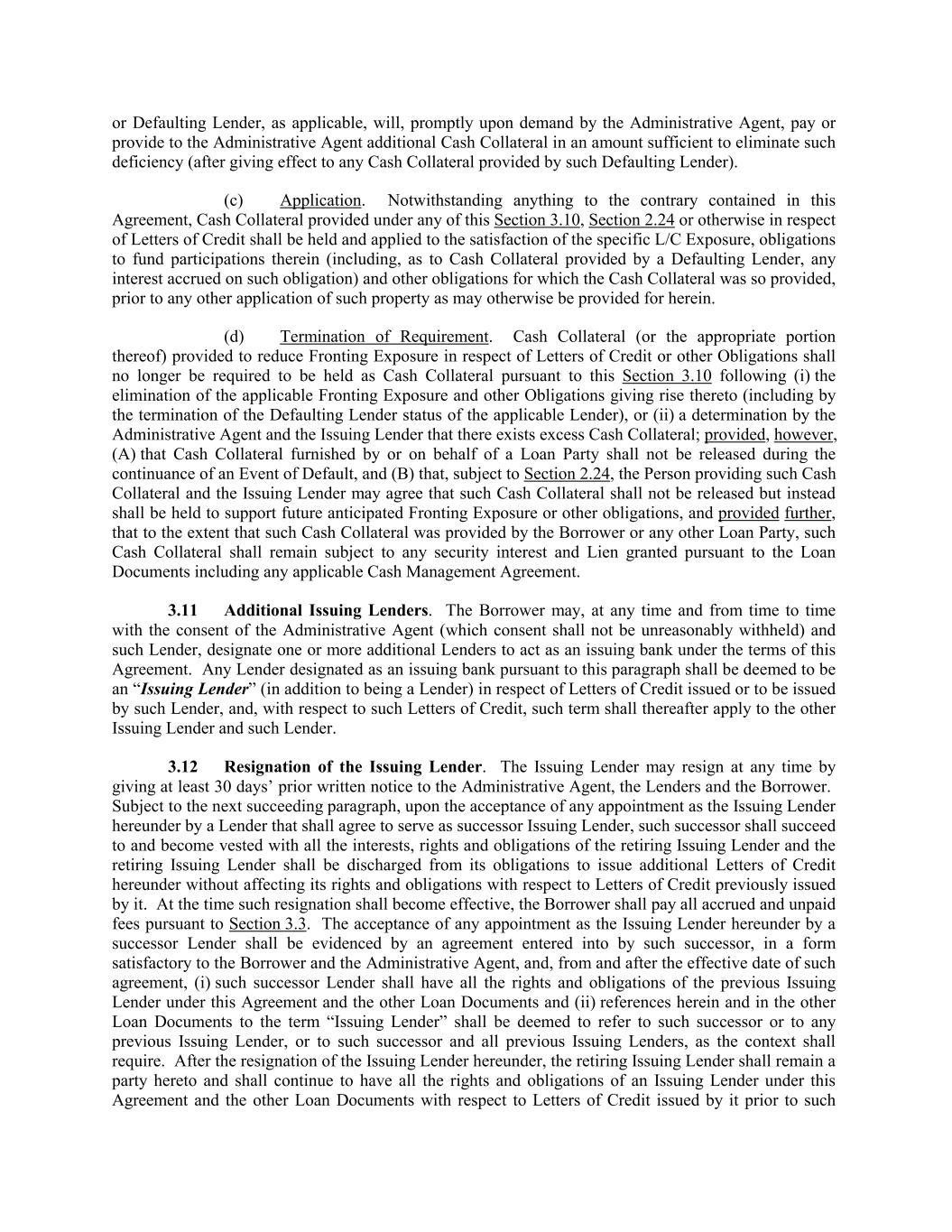 or Defaulting Lender, as applicable, will, promptly upon demand by the Administrative Agent, pay or provide to the Administrative Agent additional Cash Collateral in an amount sufficient to eliminate such deficiency (after giving effect to any Cash Collateral provided by such Defaulting Lender). (c) Application. Notwithstanding anything to the contrary contained in this Agreement, Cash Collateral provided under any of this Section 3.10, Section 2.24 or otherwise in respect of Letters of Credit shall be held and applied to the satisfaction of the specific L/C Exposure, obligations to fund participations therein (including, as to Cash Collateral provided by a Defaulting Lender, any interest accrued on such obligation) and other obligations for which the Cash Collateral was so provided, prior to any other application of such property as may otherwise be provided for herein. (d) Termination of Requirement. Cash Collateral (or the appropriate portion thereof) provided to reduce Fronting Exposure in respect of Letters of Credit or other Obligations shall no longer be required to be held as Cash Collateral pursuant to this Section 3.10 following (i) the elimination of the applicable Fronting Exposure and other Obligations giving rise thereto (including by the termination of the Defaulting Lender status of the applicable Lender), or (ii) a determination by the Administrative Agent and the Issuing Lender that there exists excess Cash Collateral; provided, however, (A) that Cash Collateral furnished by or on behalf of a Loan Party shall not be released during the continuance of an Event of Default, and (B) that, subject to Section 2.24, the Person providing such Cash Collateral and the Issuing Lender may agree that such Cash Collateral shall not be released but instead shall be held to support future anticipated Fronting Exposure or other obligations, and provided further, that to the extent that such Cash Collateral was provided by the Borrower or any other Loan Party, such Cash Collateral shall remain subject to any security interest and Lien granted pursuant to the Loan Documents including any applicable Cash Management Agreement. 3.11 Additional Issuing Lenders. The Borrower may, at any time and from time to time with the consent of the Administrative Agent (which consent shall not be unreasonably withheld) and such Lender, designate one or more additional Lenders to act as an issuing bank under the terms of this Agreement. Any Lender designated as an issuing bank pursuant to this paragraph shall be deemed to be an “Issuing Lender” (in addition to being a Lender) in respect of Letters of Credit issued or to be issued by such Lender, and, with respect to such Letters of Credit, such term shall thereafter apply to the other Issuing Lender and such Lender. 3.12 Resignation of the Issuing Lender. The Issuing Lender may resign at any time by giving at least 30 days’ prior written notice to the Administrative Agent, the Lenders and the Borrower. Subject to the next succeeding paragraph, upon the acceptance of any appointment as the Issuing Lender hereunder by a Lender that shall agree to serve as successor Issuing Lender, such successor shall succeed to and become vested with all the interests, rights and obligations of the retiring Issuing Lender and the retiring Issuing Lender shall be discharged from its obligations to issue additional Letters of Credit hereunder without affecting its rights and obligations with respect to Letters of Credit previously issued by it. At the time such resignation shall become effective, the Borrower shall pay all accrued and unpaid fees pursuant to Section 3.3. The acceptance of any appointment as the Issuing Lender hereunder by a successor Lender shall be evidenced by an agreement entered into by such successor, in a form satisfactory to the Borrower and the Administrative Agent, and, from and after the effective date of such agreement, (i) such successor Lender shall have all the rights and obligations of the previous Issuing Lender under this Agreement and the other Loan Documents and (ii) references herein and in the other Loan Documents to the term “Issuing Lender” shall be deemed to refer to such successor or to any previous Issuing Lender, or to such successor and all previous Issuing Lenders, as the context shall require. After the resignation of the Issuing Lender hereunder, the retiring Issuing Lender shall remain a party hereto and shall continue to have all the rights and obligations of an Issuing Lender under this Agreement and the other Loan Documents with respect to Letters of Credit issued by it prior to such