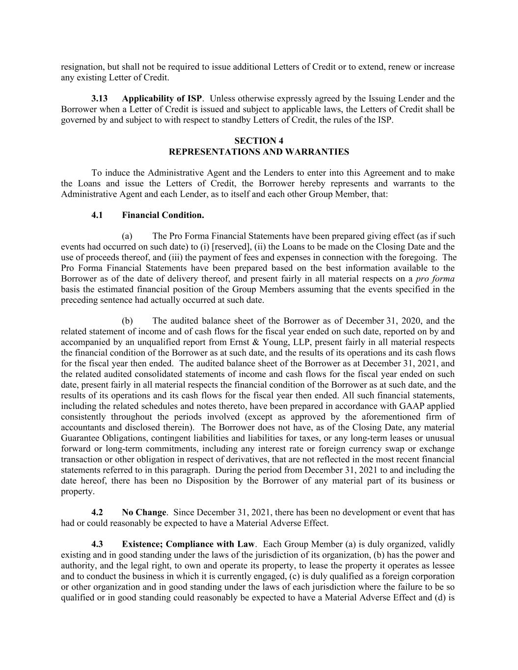 resignation, but shall not be required to issue additional Letters of Credit or to extend, renew or increase any existing Letter of Credit. 3.13 Applicability of ISP. Unless otherwise expressly agreed by the Issuing Lender and the Borrower when a Letter of Credit is issued and subject to applicable laws, the Letters of Credit shall be governed by and subject to with respect to standby Letters of Credit, the rules of the ISP. SECTION 4 REPRESENTATIONS AND WARRANTIES To induce the Administrative Agent and the Lenders to enter into this Agreement and to make the Loans and issue the Letters of Credit, the Borrower hereby represents and warrants to the Administrative Agent and each Lender, as to itself and each other Group Member, that: 4.1 Financial Condition. (a) The Pro Forma Financial Statements have been prepared giving effect (as if such events had occurred on such date) to (i) [reserved], (ii) the Loans to be made on the Closing Date and the use of proceeds thereof, and (iii) the payment of fees and expenses in connection with the foregoing. The Pro Forma Financial Statements have been prepared based on the best information available to the Borrower as of the date of delivery thereof, and present fairly in all material respects on a pro forma basis the estimated financial position of the Group Members assuming that the events specified in the preceding sentence had actually occurred at such date. (b) The audited balance sheet of the Borrower as of December 31, 2020, and the related statement of income and of cash flows for the fiscal year ended on such date, reported on by and accompanied by an unqualified report from Ernst & Young, LLP, present fairly in all material respects the financial condition of the Borrower as at such date, and the results of its operations and its cash flows for the fiscal year then ended. The audited balance sheet of the Borrower as at December 31, 2021, and the related audited consolidated statements of income and cash flows for the fiscal year ended on such date, present fairly in all material respects the financial condition of the Borrower as at such date, and the results of its operations and its cash flows for the fiscal year then ended. All such financial statements, including the related schedules and notes thereto, have been prepared in accordance with GAAP applied consistently throughout the periods involved (except as approved by the aforementioned firm of accountants and disclosed therein). The Borrower does not have, as of the Closing Date, any material Guarantee Obligations, contingent liabilities and liabilities for taxes, or any long-term leases or unusual forward or long-term commitments, including any interest rate or foreign currency swap or exchange transaction or other obligation in respect of derivatives, that are not reflected in the most recent financial statements referred to in this paragraph. During the period from December 31, 2021 to and including the date hereof, there has been no Disposition by the Borrower of any material part of its business or property. 4.2 No Change. Since December 31, 2021, there has been no development or event that has had or could reasonably be expected to have a Material Adverse Effect. 4.3 Existence; Compliance with Law. Each Group Member (a) is duly organized, validly existing and in good standing under the laws of the jurisdiction of its organization, (b) has the power and authority, and the legal right, to own and operate its property, to lease the property it operates as lessee and to conduct the business in which it is currently engaged, (c) is duly qualified as a foreign corporation or other organization and in good standing under the laws of each jurisdiction where the failure to be so qualified or in good standing could reasonably be expected to have a Material Adverse Effect and (d) is