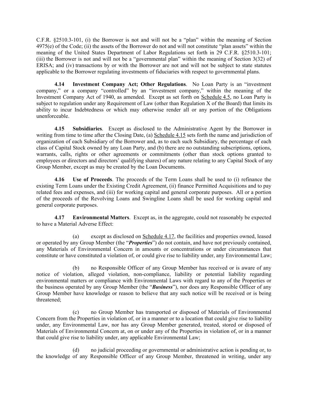 C.F.R. §2510.3-101, (i) the Borrower is not and will not be a “plan” within the meaning of Section 4975(e) of the Code; (ii) the assets of the Borrower do not and will not constitute “plan assets” within the meaning of the United States Department of Labor Regulations set forth in 29 C.F.R. §2510.3-101; (iii) the Borrower is not and will not be a “governmental plan” within the meaning of Section 3(32) of ERISA; and (iv) transactions by or with the Borrower are not and will not be subject to state statutes applicable to the Borrower regulating investments of fiduciaries with respect to governmental plans. 4.14 Investment Company Act; Other Regulations. No Loan Party is an “investment company,” or a company “controlled” by an “investment company,” within the meaning of the Investment Company Act of 1940, as amended. Except as set forth on Schedule 4.5, no Loan Party is subject to regulation under any Requirement of Law (other than Regulation X of the Board) that limits its ability to incur Indebtedness or which may otherwise render all or any portion of the Obligations unenforceable. 4.15 Subsidiaries. Except as disclosed to the Administrative Agent by the Borrower in writing from time to time after the Closing Date, (a) Schedule 4.15 sets forth the name and jurisdiction of organization of each Subsidiary of the Borrower and, as to each such Subsidiary, the percentage of each class of Capital Stock owned by any Loan Party, and (b) there are no outstanding subscriptions, options, warrants, calls, rights or other agreements or commitments (other than stock options granted to employees or directors and directors’ qualifying shares) of any nature relating to any Capital Stock of any Group Member, except as may be created by the Loan Documents. 4.16 Use of Proceeds. The proceeds of the Term Loans shall be used to (i) refinance the existing Term Loans under the Existing Credit Agreement, (ii) finance Permitted Acquisitions and to pay related fees and expenses, and (iii) for working capital and general corporate purposes. All or a portion of the proceeds of the Revolving Loans and Swingline Loans shall be used for working capital and general corporate purposes. 4.17 Environmental Matters. Except as, in the aggregate, could not reasonably be expected to have a Material Adverse Effect: (a) except as disclosed on Schedule 4.17, the facilities and properties owned, leased or operated by any Group Member (the “Properties”) do not contain, and have not previously contained, any Materials of Environmental Concern in amounts or concentrations or under circumstances that constitute or have constituted a violation of, or could give rise to liability under, any Environmental Law; (b) no Responsible Officer of any Group Member has received or is aware of any notice of violation, alleged violation, non-compliance, liability or potential liability regarding environmental matters or compliance with Environmental Laws with regard to any of the Properties or the business operated by any Group Member (the “Business”), nor does any Responsible Officer of any Group Member have knowledge or reason to believe that any such notice will be received or is being threatened; (c) no Group Member has transported or disposed of Materials of Environmental Concern from the Properties in violation of, or in a manner or to a location that could give rise to liability under, any Environmental Law, nor has any Group Member generated, treated, stored or disposed of Materials of Environmental Concern at, on or under any of the Properties in violation of, or in a manner that could give rise to liability under, any applicable Environmental Law; (d) no judicial proceeding or governmental or administrative action is pending or, to the knowledge of any Responsible Officer of any Group Member, threatened in writing, under any