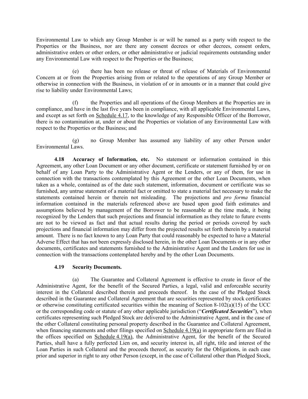 Environmental Law to which any Group Member is or will be named as a party with respect to the Properties or the Business, nor are there any consent decrees or other decrees, consent orders, administrative orders or other orders, or other administrative or judicial requirements outstanding under any Environmental Law with respect to the Properties or the Business; (e) there has been no release or threat of release of Materials of Environmental Concern at or from the Properties arising from or related to the operations of any Group Member or otherwise in connection with the Business, in violation of or in amounts or in a manner that could give rise to liability under Environmental Laws; (f) the Properties and all operations of the Group Members at the Properties are in compliance, and have in the last five years been in compliance, with all applicable Environmental Laws, and except as set forth on Schedule 4.17, to the knowledge of any Responsible Officer of the Borrower, there is no contamination at, under or about the Properties or violation of any Environmental Law with respect to the Properties or the Business; and (g) no Group Member has assumed any liability of any other Person under Environmental Laws. 4.18 Accuracy of Information, etc. No statement or information contained in this Agreement, any other Loan Document or any other document, certificate or statement furnished by or on behalf of any Loan Party to the Administrative Agent or the Lenders, or any of them, for use in connection with the transactions contemplated by this Agreement or the other Loan Documents, when taken as a whole, contained as of the date such statement, information, document or certificate was so furnished, any untrue statement of a material fact or omitted to state a material fact necessary to make the statements contained herein or therein not misleading. The projections and pro forma financial information contained in the materials referenced above are based upon good faith estimates and assumptions believed by management of the Borrower to be reasonable at the time made, it being recognized by the Lenders that such projections and financial information as they relate to future events are not to be viewed as fact and that actual results during the period or periods covered by such projections and financial information may differ from the projected results set forth therein by a material amount. There is no fact known to any Loan Party that could reasonably be expected to have a Material Adverse Effect that has not been expressly disclosed herein, in the other Loan Documents or in any other documents, certificates and statements furnished to the Administrative Agent and the Lenders for use in connection with the transactions contemplated hereby and by the other Loan Documents. 4.19 Security Documents. (a) The Guarantee and Collateral Agreement is effective to create in favor of the Administrative Agent, for the benefit of the Secured Parties, a legal, valid and enforceable security interest in the Collateral described therein and proceeds thereof. In the case of the Pledged Stock described in the Guarantee and Collateral Agreement that are securities represented by stock certificates or otherwise constituting certificated securities within the meaning of Section 8-102(a)(15) of the UCC or the corresponding code or statute of any other applicable jurisdiction (“Certificated Securities”), when certificates representing such Pledged Stock are delivered to the Administrative Agent, and in the case of the other Collateral constituting personal property described in the Guarantee and Collateral Agreement, when financing statements and other filings specified on Schedule 4.19(a) in appropriate form are filed in the offices specified on Schedule 4.19(a), the Administrative Agent, for the benefit of the Secured Parties, shall have a fully perfected Lien on, and security interest in, all right, title and interest of the Loan Parties in such Collateral and the proceeds thereof, as security for the Obligations, in each case prior and superior in right to any other Person (except, in the case of Collateral other than Pledged Stock,