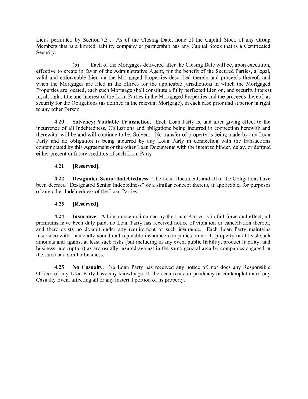 Liens permitted by Section 7.3). As of the Closing Date, none of the Capital Stock of any Group Members that is a limited liability company or partnership has any Capital Stock that is a Certificated Security. (b) Each of the Mortgages delivered after the Closing Date will be, upon execution, effective to create in favor of the Administrative Agent, for the benefit of the Secured Parties, a legal, valid and enforceable Lien on the Mortgaged Properties described therein and proceeds thereof, and when the Mortgages are filed in the offices for the applicable jurisdictions in which the Mortgaged Properties are located, each such Mortgage shall constitute a fully perfected Lien on, and security interest in, all right, title and interest of the Loan Parties in the Mortgaged Properties and the proceeds thereof, as security for the Obligations (as defined in the relevant Mortgage), in each case prior and superior in right to any other Person. 4.20 Solvency; Voidable Transaction. Each Loan Party is, and after giving effect to the incurrence of all Indebtedness, Obligations and obligations being incurred in connection herewith and therewith, will be and will continue to be, Solvent. No transfer of property is being made by any Loan Party and no obligation is being incurred by any Loan Party in connection with the transactions contemplated by this Agreement or the other Loan Documents with the intent to hinder, delay, or defraud either present or future creditors of such Loan Party 4.21 [Reserved]. 4.22 Designated Senior Indebtedness. The Loan Documents and all of the Obligations have been deemed “Designated Senior Indebtedness” or a similar concept thereto, if applicable, for purposes of any other Indebtedness of the Loan Parties. 4.23 [Reserved]. 4.24 Insurance. All insurance maintained by the Loan Parties is in full force and effect, all premiums have been duly paid, no Loan Party has received notice of violation or cancellation thereof, and there exists no default under any requirement of such insurance. Each Loan Party maintains insurance with financially sound and reputable insurance companies on all its property in at least such amounts and against at least such risks (but including in any event public liability, product liability, and business interruption) as are usually insured against in the same general area by companies engaged in the same or a similar business. 4.25 No Casualty. No Loan Party has received any notice of, nor does any Responsible Officer of any Loan Party have any knowledge of, the occurrence or pendency or contemplation of any Casualty Event affecting all or any material portion of its property.