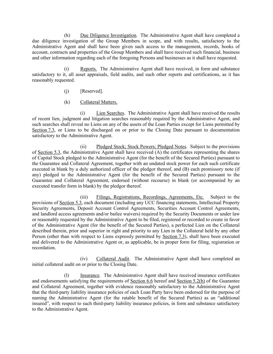 (h) Due Diligence Investigation. The Administrative Agent shall have completed a due diligence investigation of the Group Members in scope, and with results, satisfactory to the Administrative Agent and shall have been given such access to the management, records, books of account, contracts and properties of the Group Members and shall have received such financial, business and other information regarding each of the foregoing Persons and businesses as it shall have requested. (i) Reports. The Administrative Agent shall have received, in form and substance satisfactory to it, all asset appraisals, field audits, and such other reports and certifications, as it has reasonably requested. (j) [Reserved]. (k) Collateral Matters. (i) Lien Searches. The Administrative Agent shall have received the results of recent lien, judgment and litigation searches reasonably required by the Administrative Agent, and such searches shall reveal no Liens on any of the assets of the Loan Parties except for Liens permitted by Section 7.3, or Liens to be discharged on or prior to the Closing Date pursuant to documentation satisfactory to the Administrative Agent. (ii) Pledged Stock; Stock Powers; Pledged Notes. Subject to the provisions of Section 5.3, the Administrative Agent shall have received (A) the certificates representing the shares of Capital Stock pledged to the Administrative Agent (for the benefit of the Secured Parties) pursuant to the Guarantee and Collateral Agreement, together with an undated stock power for each such certificate executed in blank by a duly authorized officer of the pledgor thereof, and (B) each promissory note (if any) pledged to the Administrative Agent (for the benefit of the Secured Parties) pursuant to the Guarantee and Collateral Agreement, endorsed (without recourse) in blank (or accompanied by an executed transfer form in blank) by the pledgor thereof. (iii) Filings, Registrations, Recordings, Agreements, Etc. Subject to the provisions of Section 5.3, each document (including any UCC financing statements, Intellectual Property Security Agreements, Deposit Account Control Agreements, Securities Account Control Agreements, and landlord access agreements and/or bailee waivers) required by the Security Documents or under law or reasonably requested by the Administrative Agent to be filed, registered or recorded to create in favor of the Administrative Agent (for the benefit of the Secured Parties), a perfected Lien on the Collateral described therein, prior and superior in right and priority to any Lien in the Collateral held by any other Person (other than with respect to Liens expressly permitted by Section 7.3), shall have been executed and delivered to the Administrative Agent or, as applicable, be in proper form for filing, registration or recordation. (iv) Collateral Audit. The Administrative Agent shall have completed an initial collateral audit on or prior to the Closing Date. (l) Insurance. The Administrative Agent shall have received insurance certificates and endorsements satisfying the requirements of Section 6.6 hereof and Section 5.2(b) of the Guarantee and Collateral Agreement, together with evidence reasonably satisfactory to the Administrative Agent that the third-party liability insurance policies of each Loan Party have been endorsed for the purpose of naming the Administrative Agent (for the ratable benefit of the Secured Parties) as an “additional insured”, with respect to such third-party liability insurance policies, in form and substance satisfactory to the Administrative Agent.