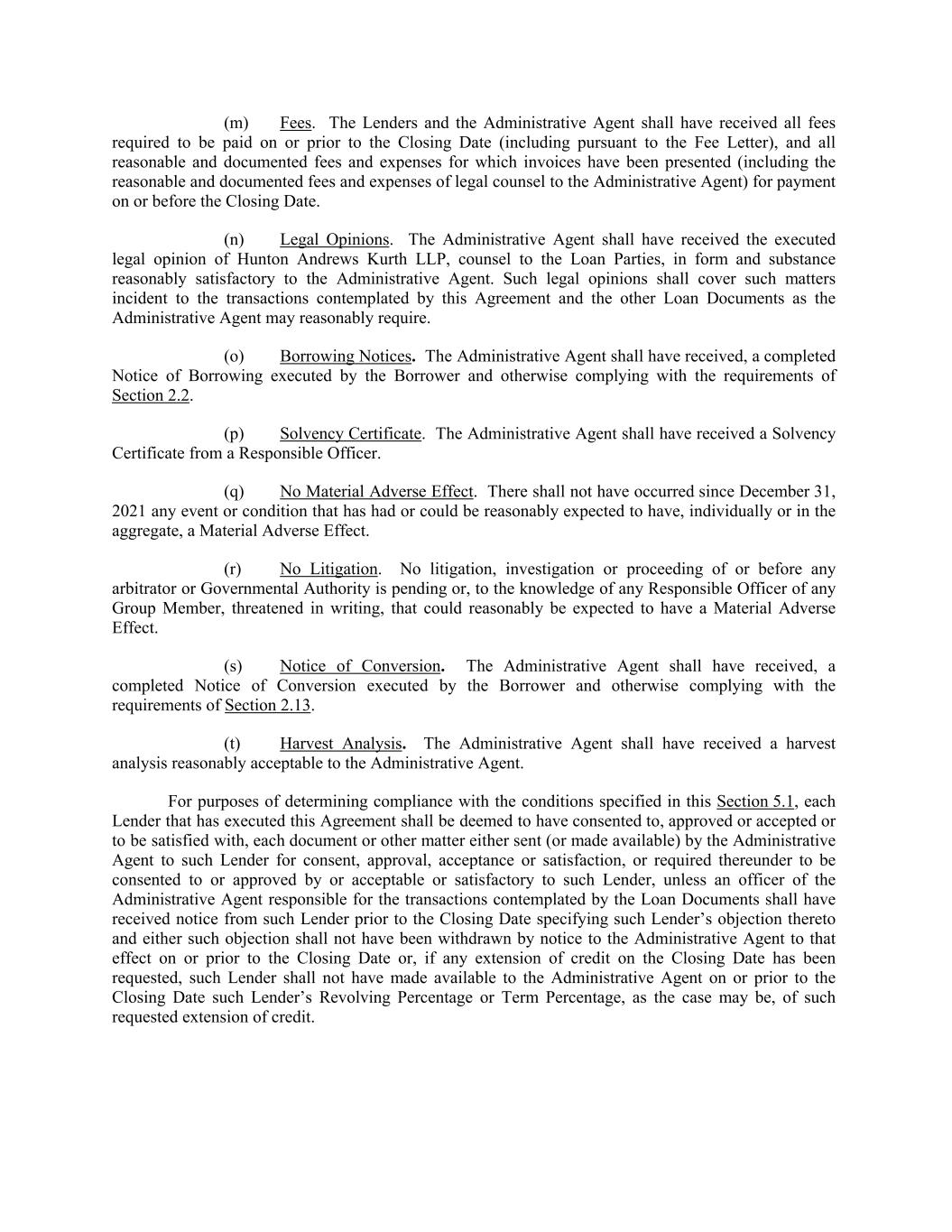 (m) Fees. The Lenders and the Administrative Agent shall have received all fees required to be paid on or prior to the Closing Date (including pursuant to the Fee Letter), and all reasonable and documented fees and expenses for which invoices have been presented (including the reasonable and documented fees and expenses of legal counsel to the Administrative Agent) for payment on or before the Closing Date. (n) Legal Opinions. The Administrative Agent shall have received the executed legal opinion of Hunton Andrews Kurth LLP, counsel to the Loan Parties, in form and substance reasonably satisfactory to the Administrative Agent. Such legal opinions shall cover such matters incident to the transactions contemplated by this Agreement and the other Loan Documents as the Administrative Agent may reasonably require. (o) Borrowing Notices. The Administrative Agent shall have received, a completed Notice of Borrowing executed by the Borrower and otherwise complying with the requirements of Section 2.2. (p) Solvency Certificate. The Administrative Agent shall have received a Solvency Certificate from a Responsible Officer. (q) No Material Adverse Effect. There shall not have occurred since December 31, 2021 any event or condition that has had or could be reasonably expected to have, individually or in the aggregate, a Material Adverse Effect. (r) No Litigation. No litigation, investigation or proceeding of or before any arbitrator or Governmental Authority is pending or, to the knowledge of any Responsible Officer of any Group Member, threatened in writing, that could reasonably be expected to have a Material Adverse Effect. (s) Notice of Conversion. The Administrative Agent shall have received, a completed Notice of Conversion executed by the Borrower and otherwise complying with the requirements of Section 2.13. (t) Harvest Analysis. The Administrative Agent shall have received a harvest analysis reasonably acceptable to the Administrative Agent. For purposes of determining compliance with the conditions specified in this Section 5.1, each Lender that has executed this Agreement shall be deemed to have consented to, approved or accepted or to be satisfied with, each document or other matter either sent (or made available) by the Administrative Agent to such Lender for consent, approval, acceptance or satisfaction, or required thereunder to be consented to or approved by or acceptable or satisfactory to such Lender, unless an officer of the Administrative Agent responsible for the transactions contemplated by the Loan Documents shall have received notice from such Lender prior to the Closing Date specifying such Lender’s objection thereto and either such objection shall not have been withdrawn by notice to the Administrative Agent to that effect on or prior to the Closing Date or, if any extension of credit on the Closing Date has been requested, such Lender shall not have made available to the Administrative Agent on or prior to the Closing Date such Lender’s Revolving Percentage or Term Percentage, as the case may be, of such requested extension of credit.