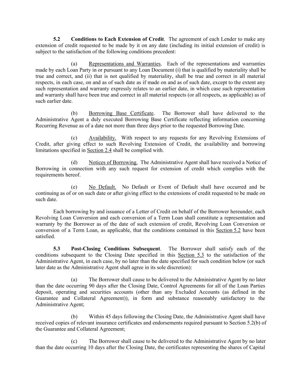 5.2 Conditions to Each Extension of Credit. The agreement of each Lender to make any extension of credit requested to be made by it on any date (including its initial extension of credit) is subject to the satisfaction of the following conditions precedent: (a) Representations and Warranties. Each of the representations and warranties made by each Loan Party in or pursuant to any Loan Document (i) that is qualified by materiality shall be true and correct, and (ii) that is not qualified by materiality, shall be true and correct in all material respects, in each case, on and as of such date as if made on and as of such date, except to the extent any such representation and warranty expressly relates to an earlier date, in which case such representation and warranty shall have been true and correct in all material respects (or all respects, as applicable) as of such earlier date. (b) Borrowing Base Certificate. The Borrower shall have delivered to the Administrative Agent a duly executed Borrowing Base Certificate reflecting information concerning Recurring Revenue as of a date not more than three days prior to the requested Borrowing Date. (c) Availability. With respect to any requests for any Revolving Extensions of Credit, after giving effect to such Revolving Extension of Credit, the availability and borrowing limitations specified in Section 2.4 shall be complied with. (d) Notices of Borrowing. The Administrative Agent shall have received a Notice of Borrowing in connection with any such request for extension of credit which complies with the requirements hereof. (e) No Default. No Default or Event of Default shall have occurred and be continuing as of or on such date or after giving effect to the extensions of credit requested to be made on such date. Each borrowing by and issuance of a Letter of Credit on behalf of the Borrower hereunder, each Revolving Loan Conversion and each conversion of a Term Loan shall constitute a representation and warranty by the Borrower as of the date of such extension of credit, Revolving Loan Conversion or conversion of a Term Loan, as applicable, that the conditions contained in this Section 5.2 have been satisfied. 5.3 Post-Closing Conditions Subsequent. The Borrower shall satisfy each of the conditions subsequent to the Closing Date specified in this Section 5.3 to the satisfaction of the Administrative Agent, in each case, by no later than the date specified for such condition below (or such later date as the Administrative Agent shall agree in its sole discretion): (a) The Borrower shall cause to be delivered to the Administrative Agent by no later than the date occurring 90 days after the Closing Date, Control Agreements for all of the Loan Parties deposit, operating and securities accounts (other than any Excluded Accounts (as defined in the Guarantee and Collateral Agreement)), in form and substance reasonably satisfactory to the Administrative Agent; (b) Within 45 days following the Closing Date, the Administrative Agent shall have received copies of relevant insurance certificates and endorsements required pursuant to Section 5.2(b) of the Guarantee and Collateral Agreement; (c) The Borrower shall cause to be delivered to the Administrative Agent by no later than the date occurring 10 days after the Closing Date, the certificates representing the shares of Capital