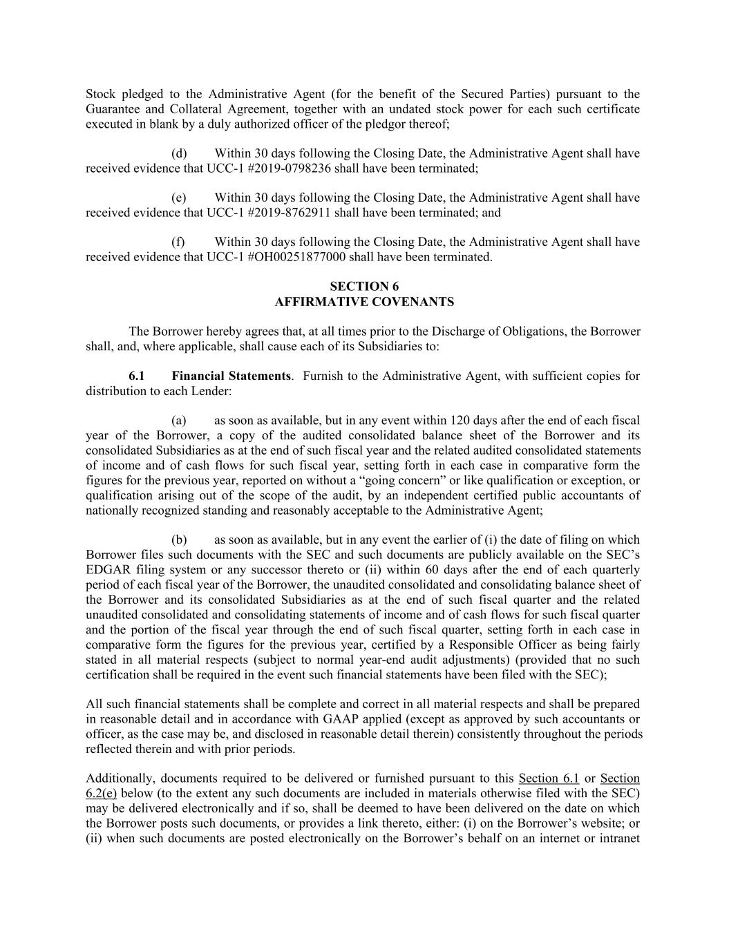 Stock pledged to the Administrative Agent (for the benefit of the Secured Parties) pursuant to the Guarantee and Collateral Agreement, together with an undated stock power for each such certificate executed in blank by a duly authorized officer of the pledgor thereof; (d) Within 30 days following the Closing Date, the Administrative Agent shall have received evidence that UCC-1 #2019-0798236 shall have been terminated; (e) Within 30 days following the Closing Date, the Administrative Agent shall have received evidence that UCC-1 #2019-8762911 shall have been terminated; and (f) Within 30 days following the Closing Date, the Administrative Agent shall have received evidence that UCC-1 #OH00251877000 shall have been terminated. SECTION 6 AFFIRMATIVE COVENANTS The Borrower hereby agrees that, at all times prior to the Discharge of Obligations, the Borrower shall, and, where applicable, shall cause each of its Subsidiaries to: 6.1 Financial Statements. Furnish to the Administrative Agent, with sufficient copies for distribution to each Lender: (a) as soon as available, but in any event within 120 days after the end of each fiscal year of the Borrower, a copy of the audited consolidated balance sheet of the Borrower and its consolidated Subsidiaries as at the end of such fiscal year and the related audited consolidated statements of income and of cash flows for such fiscal year, setting forth in each case in comparative form the figures for the previous year, reported on without a “going concern” or like qualification or exception, or qualification arising out of the scope of the audit, by an independent certified public accountants of nationally recognized standing and reasonably acceptable to the Administrative Agent; (b) as soon as available, but in any event the earlier of (i) the date of filing on which Borrower files such documents with the SEC and such documents are publicly available on the SEC’s EDGAR filing system or any successor thereto or (ii) within 60 days after the end of each quarterly period of each fiscal year of the Borrower, the unaudited consolidated and consolidating balance sheet of the Borrower and its consolidated Subsidiaries as at the end of such fiscal quarter and the related unaudited consolidated and consolidating statements of income and of cash flows for such fiscal quarter and the portion of the fiscal year through the end of such fiscal quarter, setting forth in each case in comparative form the figures for the previous year, certified by a Responsible Officer as being fairly stated in all material respects (subject to normal year-end audit adjustments) (provided that no such certification shall be required in the event such financial statements have been filed with the SEC); All such financial statements shall be complete and correct in all material respects and shall be prepared in reasonable detail and in accordance with GAAP applied (except as approved by such accountants or officer, as the case may be, and disclosed in reasonable detail therein) consistently throughout the periods reflected therein and with prior periods. Additionally, documents required to be delivered or furnished pursuant to this Section 6.1 or Section 6.2(e) below (to the extent any such documents are included in materials otherwise filed with the SEC) may be delivered electronically and if so, shall be deemed to have been delivered on the date on which the Borrower posts such documents, or provides a link thereto, either: (i) on the Borrower’s website; or (ii) when such documents are posted electronically on the Borrower’s behalf on an internet or intranet