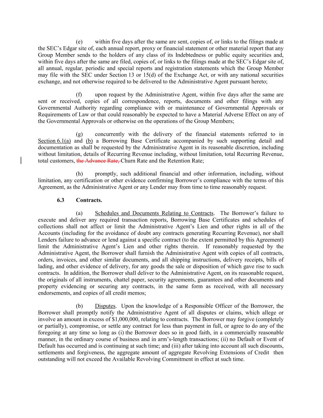 (e) within five days after the same are sent, copies of, or links to the filings made at the SEC’s Edgar site of, each annual report, proxy or financial statement or other material report that any Group Member sends to the holders of any class of its Indebtedness or public equity securities and, within five days after the same are filed, copies of, or links to the filings made at the SEC’s Edgar site of, all annual, regular, periodic and special reports and registration statements which the Group Member may file with the SEC under Section 13 or 15(d) of the Exchange Act, or with any national securities exchange, and not otherwise required to be delivered to the Administrative Agent pursuant hereto; (f) upon request by the Administrative Agent, within five days after the same are sent or received, copies of all correspondence, reports, documents and other filings with any Governmental Authority regarding compliance with or maintenance of Governmental Approvals or Requirements of Law or that could reasonably be expected to have a Material Adverse Effect on any of the Governmental Approvals or otherwise on the operations of the Group Members; (g) concurrently with the delivery of the financial statements referred to in Section 6.1(a) and (b) a Borrowing Base Certificate accompanied by such supporting detail and documentation as shall be requested by the Administrative Agent in its reasonable discretion, including without limitation, details of Recurring Revenue including, without limitation, total Recurring Revenue, total customers, the Advance Rate, Churn Rate and the Retention Rate; (h) promptly, such additional financial and other information, including, without limitation, any certification or other evidence confirming Borrower’s compliance with the terms of this Agreement, as the Administrative Agent or any Lender may from time to time reasonably request. 6.3 Contracts. (a) Schedules and Documents Relating to Contracts. The Borrower’s failure to execute and deliver any required transaction reports, Borrowing Base Certificates and schedules of collections shall not affect or limit the Administrative Agent’s Lien and other rights in all of the Accounts (including for the avoidance of doubt any contracts generating Recurring Revenue), nor shall Lenders failure to advance or lend against a specific contract (to the extent permitted by this Agreement) limit the Administrative Agent’s Lien and other rights therein. If reasonably requested by the Administrative Agent, the Borrower shall furnish the Administrative Agent with copies of all contracts, orders, invoices, and other similar documents, and all shipping instructions, delivery receipts, bills of lading, and other evidence of delivery, for any goods the sale or disposition of which gave rise to such contracts. In addition, the Borrower shall deliver to the Administrative Agent, on its reasonable request, the originals of all instruments, chattel paper, security agreements, guarantees and other documents and property evidencing or securing any contracts, in the same form as received, with all necessary endorsements, and copies of all credit memos; (b) Disputes. Upon the knowledge of a Responsible Officer of the Borrower, the Borrower shall promptly notify the Administrative Agent of all disputes or claims, which allege or involve an amount in excess of $1,000,000, relating to contracts. The Borrower may forgive (completely or partially), compromise, or settle any contract for less than payment in full, or agree to do any of the foregoing at any time so long as (i) the Borrower does so in good faith, in a commercially reasonable manner, in the ordinary course of business and in arm’s-length transactions; (ii) no Default or Event of Default has occurred and is continuing at such time; and (iii) after taking into account all such discounts, settlements and forgiveness, the aggregate amount of aggregate Revolving Extensions of Credit then outstanding will not exceed the Available Revolving Commitment in effect at such time.