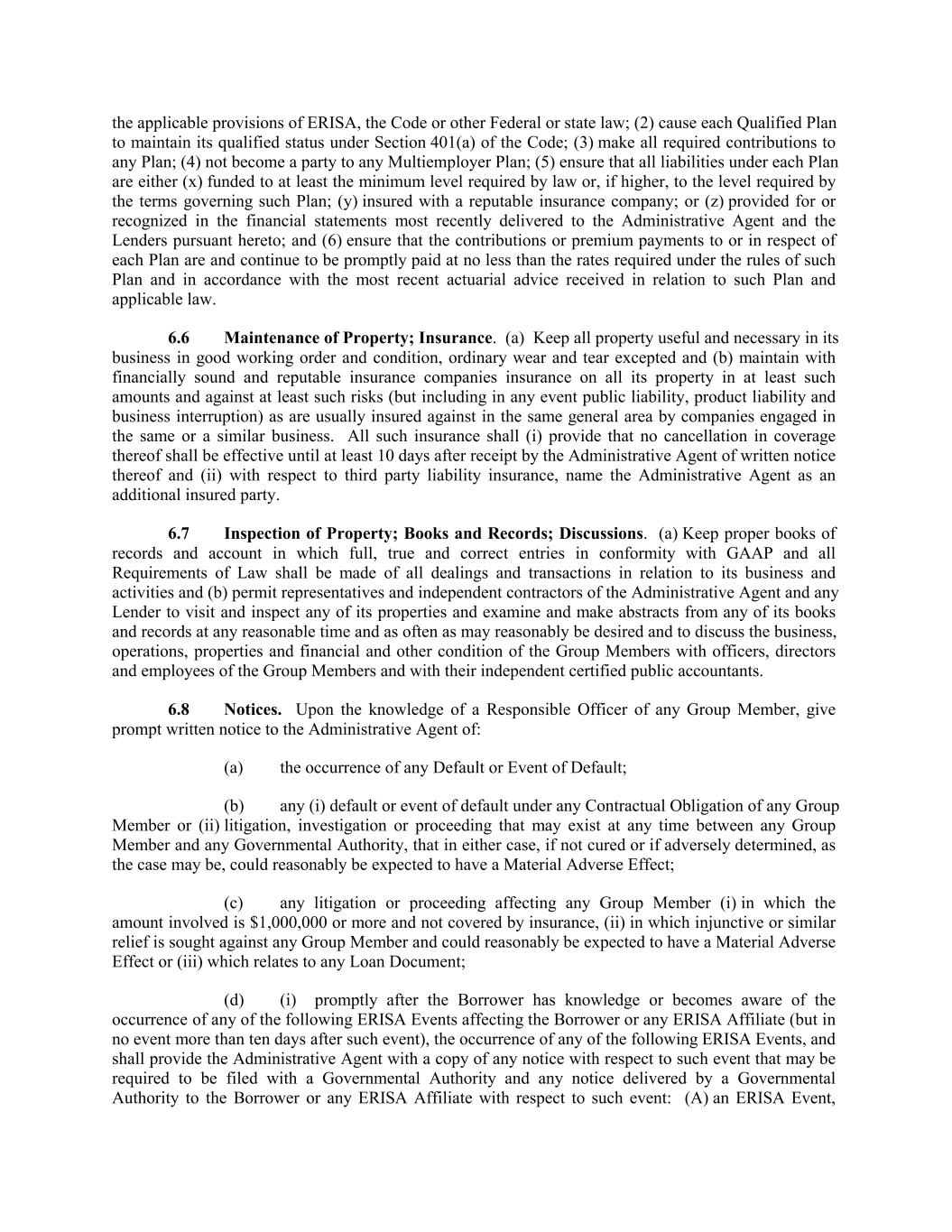 the applicable provisions of ERISA, the Code or other Federal or state law; (2) cause each Qualified Plan to maintain its qualified status under Section 401(a) of the Code; (3) make all required contributions to any Plan; (4) not become a party to any Multiemployer Plan; (5) ensure that all liabilities under each Plan are either (x) funded to at least the minimum level required by law or, if higher, to the level required by the terms governing such Plan; (y) insured with a reputable insurance company; or (z) provided for or recognized in the financial statements most recently delivered to the Administrative Agent and the Lenders pursuant hereto; and (6) ensure that the contributions or premium payments to or in respect of each Plan are and continue to be promptly paid at no less than the rates required under the rules of such Plan and in accordance with the most recent actuarial advice received in relation to such Plan and applicable law. 6.6 Maintenance of Property; Insurance. (a) Keep all property useful and necessary in its business in good working order and condition, ordinary wear and tear excepted and (b) maintain with financially sound and reputable insurance companies insurance on all its property in at least such amounts and against at least such risks (but including in any event public liability, product liability and business interruption) as are usually insured against in the same general area by companies engaged in the same or a similar business. All such insurance shall (i) provide that no cancellation in coverage thereof shall be effective until at least 10 days after receipt by the Administrative Agent of written notice thereof and (ii) with respect to third party liability insurance, name the Administrative Agent as an additional insured party. 6.7 Inspection of Property; Books and Records; Discussions. (a) Keep proper books of records and account in which full, true and correct entries in conformity with GAAP and all Requirements of Law shall be made of all dealings and transactions in relation to its business and activities and (b) permit representatives and independent contractors of the Administrative Agent and any Lender to visit and inspect any of its properties and examine and make abstracts from any of its books and records at any reasonable time and as often as may reasonably be desired and to discuss the business, operations, properties and financial and other condition of the Group Members with officers, directors and employees of the Group Members and with their independent certified public accountants. 6.8 Notices. Upon the knowledge of a Responsible Officer of any Group Member, give prompt written notice to the Administrative Agent of: (a) the occurrence of any Default or Event of Default; (b) any (i) default or event of default under any Contractual Obligation of any Group Member or (ii) litigation, investigation or proceeding that may exist at any time between any Group Member and any Governmental Authority, that in either case, if not cured or if adversely determined, as the case may be, could reasonably be expected to have a Material Adverse Effect; (c) any litigation or proceeding affecting any Group Member (i) in which the amount involved is $1,000,000 or more and not covered by insurance, (ii) in which injunctive or similar relief is sought against any Group Member and could reasonably be expected to have a Material Adverse Effect or (iii) which relates to any Loan Document; (d) (i) promptly after the Borrower has knowledge or becomes aware of the occurrence of any of the following ERISA Events affecting the Borrower or any ERISA Affiliate (but in no event more than ten days after such event), the occurrence of any of the following ERISA Events, and shall provide the Administrative Agent with a copy of any notice with respect to such event that may be required to be filed with a Governmental Authority and any notice delivered by a Governmental Authority to the Borrower or any ERISA Affiliate with respect to such event: (A) an ERISA Event,