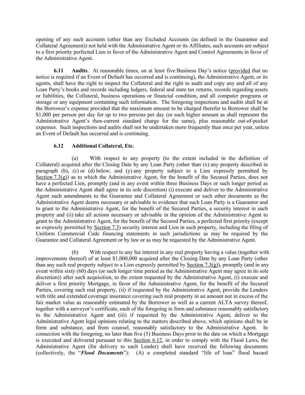 opening of any such accounts (other than any Excluded Accounts (as defined in the Guarantee and Collateral Agreement)) not held with the Administrative Agent or its Affiliates, such accounts are subject to a first priority perfected Lien in favor of the Administrative Agent and Control Agreements in favor of the Administrative Agent. 6.11 Audits. At reasonable times, on at least five Business Day’s notice (provided that no notice is required if an Event of Default has occurred and is continuing), the Administrative Agent, or its agents, shall have the right to inspect the Collateral and the right to audit and copy any and all of any Loan Party’s books and records including ledgers, federal and state tax returns, records regarding assets or liabilities, the Collateral, business operations or financial condition, and all computer programs or storage or any equipment containing such information. The foregoing inspections and audits shall be at the Borrower’s expense provided that the maximum amount to be charged therefor to Borrower shall be $1,000 per person per day for up to two persons per day (or such higher amount as shall represent the Administrative Agent’s then-current standard charge for the same), plus reasonable out-of-pocket expenses. Such inspections and audits shall not be undertaken more frequently than once per year, unless an Event of Default has occurred and is continuing. 6.12 Additional Collateral, Etc. (a) With respect to any property (to the extent included in the definition of Collateral) acquired after the Closing Date by any Loan Party (other than (x) any property described in paragraph (b), (c) or (d) below, and (y) any property subject to a Lien expressly permitted by Section 7.3(g)) as to which the Administrative Agent, for the benefit of the Secured Parties, does not have a perfected Lien, promptly (and in any event within three Business Days or such longer period as the Administrative Agent shall agree in its sole discretion) (i) execute and deliver to the Administrative Agent such amendments to the Guarantee and Collateral Agreement or such other documents as the Administrative Agent deems necessary or advisable to evidence that such Loan Party is a Guarantor and to grant to the Administrative Agent, for the benefit of the Secured Parties, a security interest in such property and (ii) take all actions necessary or advisable in the opinion of the Administrative Agent to grant to the Administrative Agent, for the benefit of the Secured Parties, a perfected first priority (except as expressly permitted by Section 7.3) security interest and Lien in such property, including the filing of Uniform Commercial Code financing statements in such jurisdictions as may be required by the Guarantee and Collateral Agreement or by law or as may be requested by the Administrative Agent. (b) With respect to any fee interest in any real property having a value (together with improvements thereof) of at least $1,000,000 acquired after the Closing Date by any Loan Party (other than any such real property subject to a Lien expressly permitted by Section 7.3(g)), promptly (and in any event within sixty (60) days (or such longer time period as the Administrative Agent may agree in its sole discretion)) after such acquisition, to the extent requested by the Administrative Agent, (i) execute and deliver a first priority Mortgage, in favor of the Administrative Agent, for the benefit of the Secured Parties, covering such real property, (ii) if requested by the Administrative Agent, provide the Lenders with title and extended coverage insurance covering such real property in an amount not in excess of the fair market value as reasonably estimated by the Borrower as well as a current ALTA survey thereof, together with a surveyor’s certificate, each of the foregoing in form and substance reasonably satisfactory to the Administrative Agent and (iii) if requested by the Administrative Agent, deliver to the Administrative Agent legal opinions relating to the matters described above, which opinions shall be in form and substance, and from counsel, reasonably satisfactory to the Administrative Agent. In connection with the foregoing, no later than five (5) Business Days prior to the date on which a Mortgage is executed and delivered pursuant to this Section 6.12, in order to comply with the Flood Laws, the Administrative Agent (for delivery to each Lender) shall have received the following documents (collectively, the “Flood Documents”): (A) a completed standard “life of loan” flood hazard
