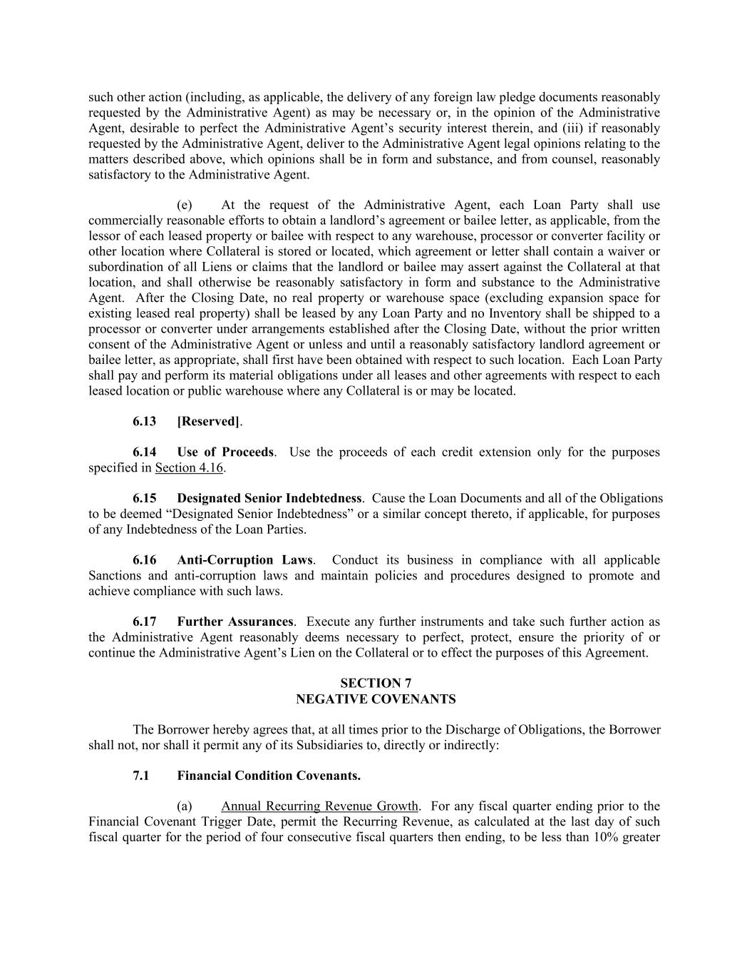 such other action (including, as applicable, the delivery of any foreign law pledge documents reasonably requested by the Administrative Agent) as may be necessary or, in the opinion of the Administrative Agent, desirable to perfect the Administrative Agent’s security interest therein, and (iii) if reasonably requested by the Administrative Agent, deliver to the Administrative Agent legal opinions relating to the matters described above, which opinions shall be in form and substance, and from counsel, reasonably satisfactory to the Administrative Agent. (e) At the request of the Administrative Agent, each Loan Party shall use commercially reasonable efforts to obtain a landlord’s agreement or bailee letter, as applicable, from the lessor of each leased property or bailee with respect to any warehouse, processor or converter facility or other location where Collateral is stored or located, which agreement or letter shall contain a waiver or subordination of all Liens or claims that the landlord or bailee may assert against the Collateral at that location, and shall otherwise be reasonably satisfactory in form and substance to the Administrative Agent. After the Closing Date, no real property or warehouse space (excluding expansion space for existing leased real property) shall be leased by any Loan Party and no Inventory shall be shipped to a processor or converter under arrangements established after the Closing Date, without the prior written consent of the Administrative Agent or unless and until a reasonably satisfactory landlord agreement or bailee letter, as appropriate, shall first have been obtained with respect to such location. Each Loan Party shall pay and perform its material obligations under all leases and other agreements with respect to each leased location or public warehouse where any Collateral is or may be located. 6.13 [Reserved]. 6.14 Use of Proceeds. Use the proceeds of each credit extension only for the purposes specified in Section 4.16. 6.15 Designated Senior Indebtedness. Cause the Loan Documents and all of the Obligations to be deemed “Designated Senior Indebtedness” or a similar concept thereto, if applicable, for purposes of any Indebtedness of the Loan Parties. 6.16 Anti-Corruption Laws. Conduct its business in compliance with all applicable Sanctions and anti-corruption laws and maintain policies and procedures designed to promote and achieve compliance with such laws. 6.17 Further Assurances. Execute any further instruments and take such further action as the Administrative Agent reasonably deems necessary to perfect, protect, ensure the priority of or continue the Administrative Agent’s Lien on the Collateral or to effect the purposes of this Agreement. SECTION 7 NEGATIVE COVENANTS The Borrower hereby agrees that, at all times prior to the Discharge of Obligations, the Borrower shall not, nor shall it permit any of its Subsidiaries to, directly or indirectly: 7.1 Financial Condition Covenants. (a) Annual Recurring Revenue Growth. For any fiscal quarter ending prior to the Financial Covenant Trigger Date, permit the Recurring Revenue, as calculated at the last day of such fiscal quarter for the period of four consecutive fiscal quarters then ending, to be less than 10% greater