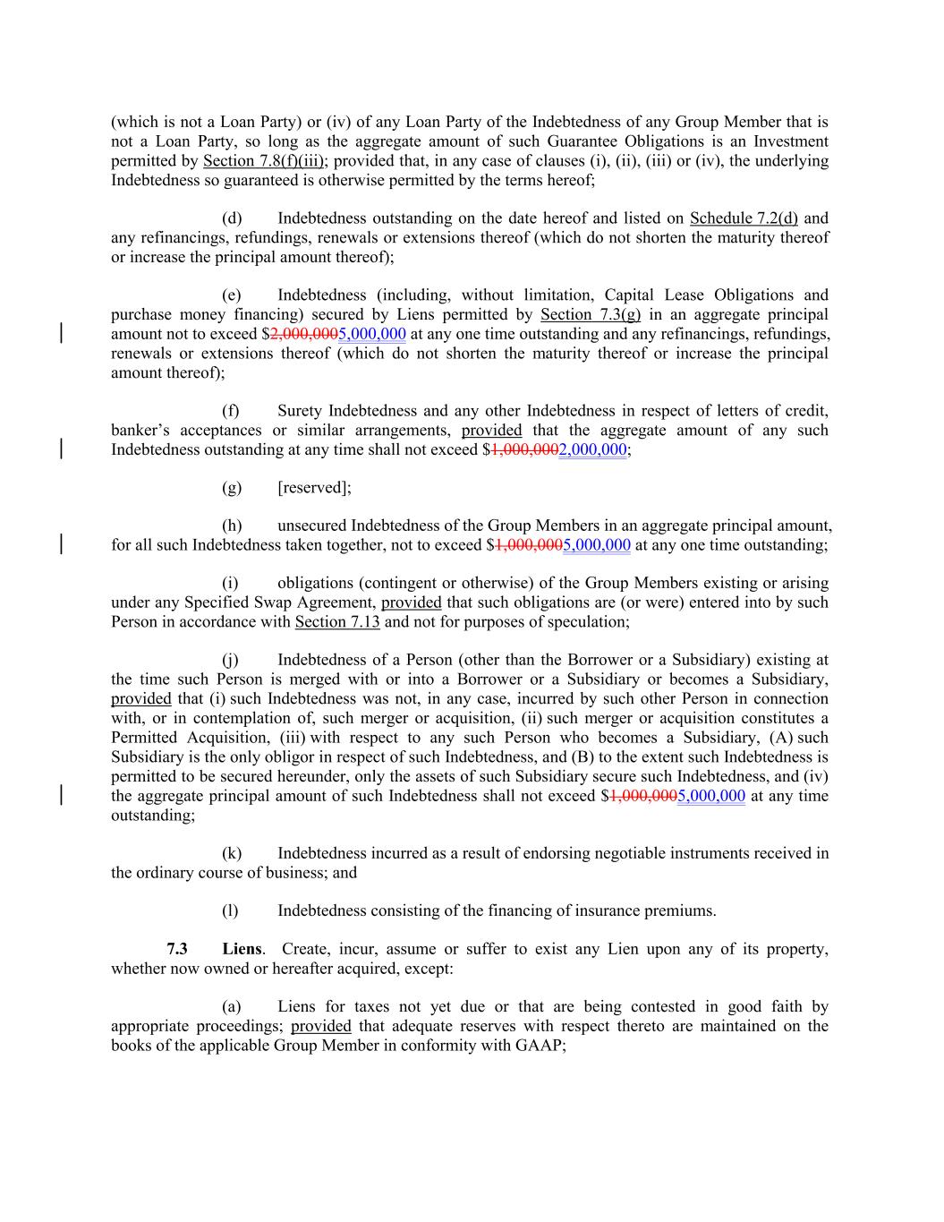 (which is not a Loan Party) or (iv) of any Loan Party of the Indebtedness of any Group Member that is not a Loan Party, so long as the aggregate amount of such Guarantee Obligations is an Investment permitted by Section 7.8(f)(iii); provided that, in any case of clauses (i), (ii), (iii) or (iv), the underlying Indebtedness so guaranteed is otherwise permitted by the terms hereof; (d) Indebtedness outstanding on the date hereof and listed on Schedule 7.2(d) and any refinancings, refundings, renewals or extensions thereof (which do not shorten the maturity thereof or increase the principal amount thereof); (e) Indebtedness (including, without limitation, Capital Lease Obligations and purchase money financing) secured by Liens permitted by Section 7.3(g) in an aggregate principal amount not to exceed $2,000,0005,000,000 at any one time outstanding and any refinancings, refundings, renewals or extensions thereof (which do not shorten the maturity thereof or increase the principal amount thereof); (f) Surety Indebtedness and any other Indebtedness in respect of letters of credit, banker’s acceptances or similar arrangements, provided that the aggregate amount of any such Indebtedness outstanding at any time shall not exceed $1,000,0002,000,000; (g) [reserved]; (h) unsecured Indebtedness of the Group Members in an aggregate principal amount, for all such Indebtedness taken together, not to exceed $1,000,0005,000,000 at any one time outstanding; (i) obligations (contingent or otherwise) of the Group Members existing or arising under any Specified Swap Agreement, provided that such obligations are (or were) entered into by such Person in accordance with Section 7.13 and not for purposes of speculation; (j) Indebtedness of a Person (other than the Borrower or a Subsidiary) existing at the time such Person is merged with or into a Borrower or a Subsidiary or becomes a Subsidiary, provided that (i) such Indebtedness was not, in any case, incurred by such other Person in connection with, or in contemplation of, such merger or acquisition, (ii) such merger or acquisition constitutes a Permitted Acquisition, (iii) with respect to any such Person who becomes a Subsidiary, (A) such Subsidiary is the only obligor in respect of such Indebtedness, and (B) to the extent such Indebtedness is permitted to be secured hereunder, only the assets of such Subsidiary secure such Indebtedness, and (iv) the aggregate principal amount of such Indebtedness shall not exceed $1,000,0005,000,000 at any time outstanding; (k) Indebtedness incurred as a result of endorsing negotiable instruments received in the ordinary course of business; and (l) Indebtedness consisting of the financing of insurance premiums. 7.3 Liens. Create, incur, assume or suffer to exist any Lien upon any of its property, whether now owned or hereafter acquired, except: (a) Liens for taxes not yet due or that are being contested in good faith by appropriate proceedings; provided that adequate reserves with respect thereto are maintained on the books of the applicable Group Member in conformity with GAAP;