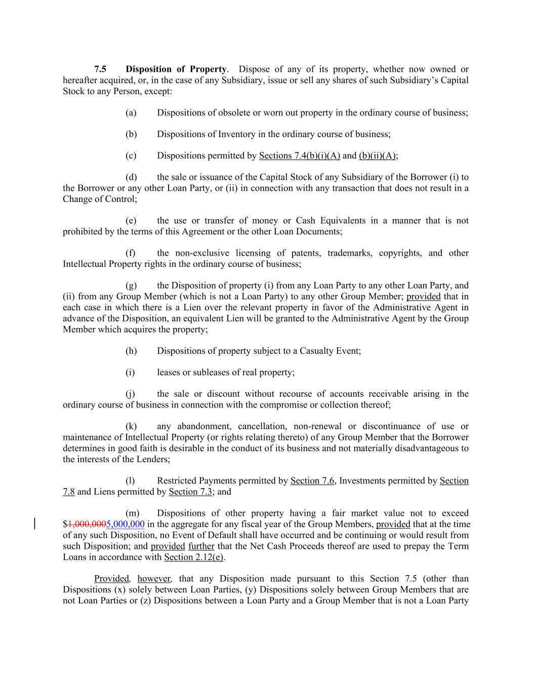7.5 Disposition of Property. Dispose of any of its property, whether now owned or hereafter acquired, or, in the case of any Subsidiary, issue or sell any shares of such Subsidiary’s Capital Stock to any Person, except: (a) Dispositions of obsolete or worn out property in the ordinary course of business; (b) Dispositions of Inventory in the ordinary course of business; (c) Dispositions permitted by Sections 7.4(b)(i)(A) and (b)(ii)(A); (d) the sale or issuance of the Capital Stock of any Subsidiary of the Borrower (i) to the Borrower or any other Loan Party, or (ii) in connection with any transaction that does not result in a Change of Control; (e) the use or transfer of money or Cash Equivalents in a manner that is not prohibited by the terms of this Agreement or the other Loan Documents; (f) the non-exclusive licensing of patents, trademarks, copyrights, and other Intellectual Property rights in the ordinary course of business; (g) the Disposition of property (i) from any Loan Party to any other Loan Party, and (ii) from any Group Member (which is not a Loan Party) to any other Group Member; provided that in each case in which there is a Lien over the relevant property in favor of the Administrative Agent in advance of the Disposition, an equivalent Lien will be granted to the Administrative Agent by the Group Member which acquires the property; (h) Dispositions of property subject to a Casualty Event; (i) leases or subleases of real property; (j) the sale or discount without recourse of accounts receivable arising in the ordinary course of business in connection with the compromise or collection thereof; (k) any abandonment, cancellation, non-renewal or discontinuance of use or maintenance of Intellectual Property (or rights relating thereto) of any Group Member that the Borrower determines in good faith is desirable in the conduct of its business and not materially disadvantageous to the interests of the Lenders; (l) Restricted Payments permitted by Section 7.6, Investments permitted by Section 7.8 and Liens permitted by Section 7.3; and (m) Dispositions of other property having a fair market value not to exceed $1,000,0005,000,000 in the aggregate for any fiscal year of the Group Members, provided that at the time of any such Disposition, no Event of Default shall have occurred and be continuing or would result from such Disposition; and provided further that the Net Cash Proceeds thereof are used to prepay the Term Loans in accordance with Section 2.12(e). Provided, however, that any Disposition made pursuant to this Section 7.5 (other than Dispositions (x) solely between Loan Parties, (y) Dispositions solely between Group Members that are not Loan Parties or (z) Dispositions between a Loan Party and a Group Member that is not a Loan Party