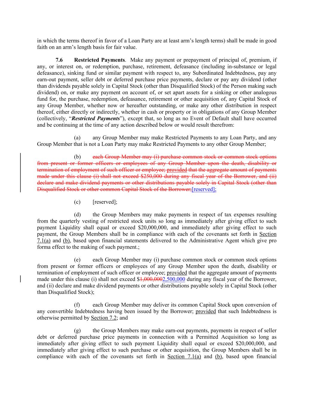 in which the terms thereof in favor of a Loan Party are at least arm’s length terms) shall be made in good faith on an arm’s length basis for fair value. 7.6 Restricted Payments. Make any payment or prepayment of principal of, premium, if any, or interest on, or redemption, purchase, retirement, defeasance (including in-substance or legal defeasance), sinking fund or similar payment with respect to, any Subordinated Indebtedness, pay any earn-out payment, seller debt or deferred purchase price payments, declare or pay any dividend (other than dividends payable solely in Capital Stock (other than Disqualified Stock) of the Person making such dividend) on, or make any payment on account of, or set apart assets for a sinking or other analogous fund for, the purchase, redemption, defeasance, retirement or other acquisition of, any Capital Stock of any Group Member, whether now or hereafter outstanding, or make any other distribution in respect thereof, either directly or indirectly, whether in cash or property or in obligations of any Group Member (collectively, “Restricted Payments”), except that, so long as no Event of Default shall have occurred and be continuing at the time of any action described below or would result therefrom: (a) any Group Member may make Restricted Payments to any Loan Party, and any Group Member that is not a Loan Party may make Restricted Payments to any other Group Member; (b) each Group Member may (i) purchase common stock or common stock options from present or former officers or employees of any Group Member upon the death, disability or termination of employment of such officer or employee; provided that the aggregate amount of payments made under this clause (i) shall not exceed $250,000 during any fiscal year of the Borrower, and (ii) declare and make dividend payments or other distributions payable solely in Capital Stock (other than Disqualified Stock or other common Capital Stock of the Borrower;[reserved]; (c) [reserved]; (d) the Group Members may make payments in respect of tax expenses resulting from the quarterly vesting of restricted stock units so long as immediately after giving effect to such payment Liquidity shall equal or exceed $20,000,000, and immediately after giving effect to such payment, the Group Members shall be in compliance with each of the covenants set forth in Section 7.1(a) and (b), based upon financial statements delivered to the Administrative Agent which give pro forma effect to the making of such payment.; (e) each Group Member may (i) purchase common stock or common stock options from present or former officers or employees of any Group Member upon the death, disability or termination of employment of such officer or employee; provided that the aggregate amount of payments made under this clause (i) shall not exceed $1,000,0002,500,000 during any fiscal year of the Borrower, and (ii) declare and make dividend payments or other distributions payable solely in Capital Stock (other than Disqualified Stock); (f) each Group Member may deliver its common Capital Stock upon conversion of any convertible Indebtedness having been issued by the Borrower; provided that such Indebtedness is otherwise permitted by Section 7.2; and (g) the Group Members may make earn-out payments, payments in respect of seller debt or deferred purchase price payments in connection with a Permitted Acquisition so long as immediately after giving effect to such payment Liquidity shall equal or exceed $20,000,000, and immediately after giving effect to such purchase or other acquisition, the Group Members shall be in compliance with each of the covenants set forth in Section 7.1(a) and (b), based upon financial