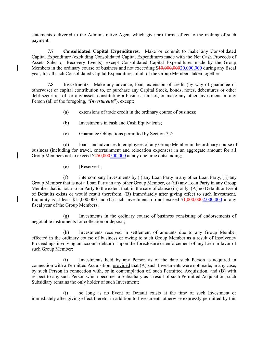 statements delivered to the Administrative Agent which give pro forma effect to the making of such payment. 7.7 Consolidated Capital Expenditures. Make or commit to make any Consolidated Capital Expenditure (excluding Consolidated Capital Expenditures made with the Net Cash Proceeds of Assets Sales or Recovery Events), except Consolidated Capital Expenditures made by the Group Members in the ordinary course of business and not exceeding $10,000,00020,000,000 during any fiscal year, for all such Consolidated Capital Expenditures of all of the Group Members taken together. 7.8 Investments. Make any advance, loan, extension of credit (by way of guarantee or otherwise) or capital contribution to, or purchase any Capital Stock, bonds, notes, debentures or other debt securities of, or any assets constituting a business unit of, or make any other investment in, any Person (all of the foregoing, “Investments”), except: (a) extensions of trade credit in the ordinary course of business; (b) Investments in cash and Cash Equivalents; (c) Guarantee Obligations permitted by Section 7.2; (d) loans and advances to employees of any Group Member in the ordinary course of business (including for travel, entertainment and relocation expenses) in an aggregate amount for all Group Members not to exceed $250,000500,000 at any one time outstanding; (e) [Reserved]; (f) intercompany Investments by (i) any Loan Party in any other Loan Party, (ii) any Group Member that is not a Loan Party in any other Group Member, or (iii) any Loan Party in any Group Member that is not a Loan Party to the extent that, in the case of clause (iii) only, (A) no Default or Event of Defaults exists or would result therefrom, (B) immediately after giving effect to such Investment, Liquidity is at least $15,000,000 and (C) such Investments do not exceed $1,000,0002,000,000 in any fiscal year of the Group Members; (g) Investments in the ordinary course of business consisting of endorsements of negotiable instruments for collection or deposit; (h) Investments received in settlement of amounts due to any Group Member effected in the ordinary course of business or owing to such Group Member as a result of Insolvency Proceedings involving an account debtor or upon the foreclosure or enforcement of any Lien in favor of such Group Member; (i) Investments held by any Person as of the date such Person is acquired in connection with a Permitted Acquisition, provided that (A) such Investments were not made, in any case, by such Person in connection with, or in contemplation of, such Permitted Acquisition, and (B) with respect to any such Person which becomes a Subsidiary as a result of such Permitted Acquisition, such Subsidiary remains the only holder of such Investment; (j) so long as no Event of Default exists at the time of such Investment or immediately after giving effect thereto, in addition to Investments otherwise expressly permitted by this
