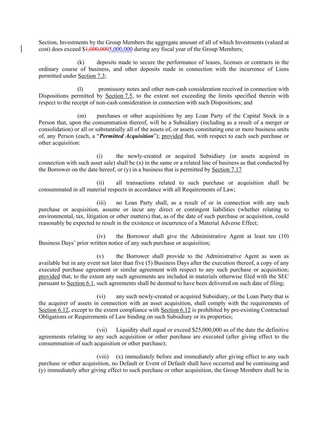 Section, Investments by the Group Members the aggregate amount of all of which Investments (valued at cost) does exceed $1,000,0005,000,000 during any fiscal year of the Group Members; (k) deposits made to secure the performance of leases, licenses or contracts in the ordinary course of business, and other deposits made in connection with the incurrence of Liens permitted under Section 7.3; (l) promissory notes and other non-cash consideration received in connection with Dispositions permitted by Section 7.5, to the extent not exceeding the limits specified therein with respect to the receipt of non-cash consideration in connection with such Dispositions; and (m) purchases or other acquisitions by any Loan Party of the Capital Stock in a Person that, upon the consummation thereof, will be a Subsidiary (including as a result of a merger or consolidation) or all or substantially all of the assets of, or assets constituting one or more business units of, any Person (each, a “Permitted Acquisition”); provided that, with respect to each such purchase or other acquisition: (i) the newly-created or acquired Subsidiary (or assets acquired in connection with such asset sale) shall be (x) in the same or a related line of business as that conducted by the Borrower on the date hereof, or (y) in a business that is permitted by Section 7.17 (ii) all transactions related to such purchase or acquisition shall be consummated in all material respects in accordance with all Requirements of Law; (iii) no Loan Party shall, as a result of or in connection with any such purchase or acquisition, assume or incur any direct or contingent liabilities (whether relating to environmental, tax, litigation or other matters) that, as of the date of such purchase or acquisition, could reasonably be expected to result in the existence or incurrence of a Material Adverse Effect; (iv) the Borrower shall give the Administrative Agent at least ten (10) Business Days’ prior written notice of any such purchase or acquisition; (v) the Borrower shall provide to the Administrative Agent as soon as available but in any event not later than five (5) Business Days after the execution thereof, a copy of any executed purchase agreement or similar agreement with respect to any such purchase or acquisition; provided that, to the extent any such agreements are included in materials otherwise filed with the SEC pursuant to Section 6.1, such agreements shall be deemed to have been delivered on such date of filing; (vi) any such newly-created or acquired Subsidiary, or the Loan Party that is the acquirer of assets in connection with an asset acquisition, shall comply with the requirements of Section 6.12, except to the extent compliance with Section 6.12 is prohibited by pre-existing Contractual Obligations or Requirements of Law binding on such Subsidiary or its properties; (vii) Liquidity shall equal or exceed $25,000,000 as of the date the definitive agreements relating to any such acquisition or other purchase are executed (after giving effect to the consummation of such acquisition or other purchase); (viii) (x) immediately before and immediately after giving effect to any such purchase or other acquisition, no Default or Event of Default shall have occurred and be continuing and (y) immediately after giving effect to such purchase or other acquisition, the Group Members shall be in