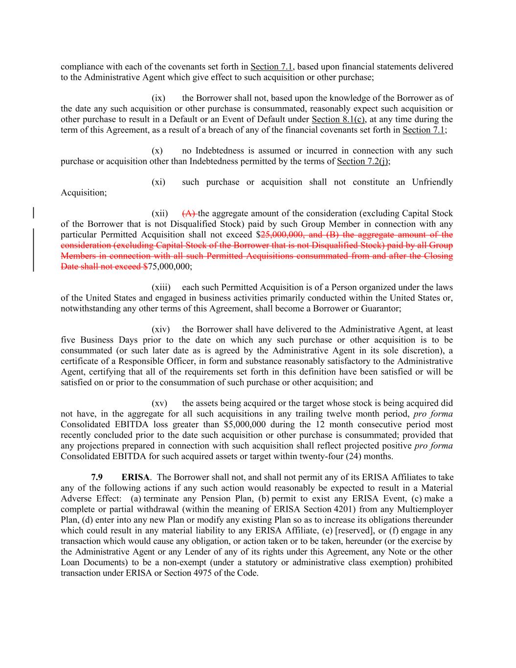 compliance with each of the covenants set forth in Section 7.1, based upon financial statements delivered to the Administrative Agent which give effect to such acquisition or other purchase; (ix) the Borrower shall not, based upon the knowledge of the Borrower as of the date any such acquisition or other purchase is consummated, reasonably expect such acquisition or other purchase to result in a Default or an Event of Default under Section 8.1(c), at any time during the term of this Agreement, as a result of a breach of any of the financial covenants set forth in Section 7.1; (x) no Indebtedness is assumed or incurred in connection with any such purchase or acquisition other than Indebtedness permitted by the terms of Section 7.2(j); (xi) such purchase or acquisition shall not constitute an Unfriendly Acquisition; (xii) (A) the aggregate amount of the consideration (excluding Capital Stock of the Borrower that is not Disqualified Stock) paid by such Group Member in connection with any particular Permitted Acquisition shall not exceed $25,000,000, and (B) the aggregate amount of the consideration (excluding Capital Stock of the Borrower that is not Disqualified Stock) paid by all Group Members in connection with all such Permitted Acquisitions consummated from and after the Closing Date shall not exceed $75,000,000; (xiii) each such Permitted Acquisition is of a Person organized under the laws of the United States and engaged in business activities primarily conducted within the United States or, notwithstanding any other terms of this Agreement, shall become a Borrower or Guarantor; (xiv) the Borrower shall have delivered to the Administrative Agent, at least five Business Days prior to the date on which any such purchase or other acquisition is to be consummated (or such later date as is agreed by the Administrative Agent in its sole discretion), a certificate of a Responsible Officer, in form and substance reasonably satisfactory to the Administrative Agent, certifying that all of the requirements set forth in this definition have been satisfied or will be satisfied on or prior to the consummation of such purchase or other acquisition; and (xv) the assets being acquired or the target whose stock is being acquired did not have, in the aggregate for all such acquisitions in any trailing twelve month period, pro forma Consolidated EBITDA loss greater than $5,000,000 during the 12 month consecutive period most recently concluded prior to the date such acquisition or other purchase is consummated; provided that any projections prepared in connection with such acquisition shall reflect projected positive pro forma Consolidated EBITDA for such acquired assets or target within twenty-four (24) months. 7.9 ERISA. The Borrower shall not, and shall not permit any of its ERISA Affiliates to take any of the following actions if any such action would reasonably be expected to result in a Material Adverse Effect: (a) terminate any Pension Plan, (b) permit to exist any ERISA Event, (c) make a complete or partial withdrawal (within the meaning of ERISA Section 4201) from any Multiemployer Plan, (d) enter into any new Plan or modify any existing Plan so as to increase its obligations thereunder which could result in any material liability to any ERISA Affiliate, (e) [reserved], or (f) engage in any transaction which would cause any obligation, or action taken or to be taken, hereunder (or the exercise by the Administrative Agent or any Lender of any of its rights under this Agreement, any Note or the other Loan Documents) to be a non-exempt (under a statutory or administrative class exemption) prohibited transaction under ERISA or Section 4975 of the Code.