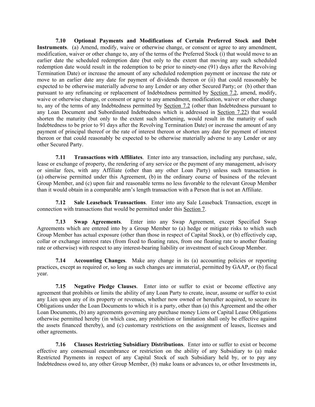 7.10 Optional Payments and Modifications of Certain Preferred Stock and Debt Instruments. (a) Amend, modify, waive or otherwise change, or consent or agree to any amendment, modification, waiver or other change to, any of the terms of the Preferred Stock (i) that would move to an earlier date the scheduled redemption date (but only to the extent that moving any such scheduled redemption date would result in the redemption to be prior to ninety-one (91) days after the Revolving Termination Date) or increase the amount of any scheduled redemption payment or increase the rate or move to an earlier date any date for payment of dividends thereon or (ii) that could reasonably be expected to be otherwise materially adverse to any Lender or any other Secured Party; or (b) other than pursuant to any refinancing or replacement of Indebtedness permitted by Section 7.2, amend, modify, waive or otherwise change, or consent or agree to any amendment, modification, waiver or other change to, any of the terms of any Indebtedness permitted by Section 7.2 (other than Indebtedness pursuant to any Loan Document and Subordinated Indebtedness which is addressed in Section 7.22) that would shorten the maturity (but only to the extent such shortening, would result in the maturity of such Indebtedness to be prior to 91 days after the Revolving Termination Date) or increase the amount of any payment of principal thereof or the rate of interest thereon or shorten any date for payment of interest thereon or that could reasonably be expected to be otherwise materially adverse to any Lender or any other Secured Party. 7.11 Transactions with Affiliates. Enter into any transaction, including any purchase, sale, lease or exchange of property, the rendering of any service or the payment of any management, advisory or similar fees, with any Affiliate (other than any other Loan Party) unless such transaction is (a) otherwise permitted under this Agreement, (b) in the ordinary course of business of the relevant Group Member, and (c) upon fair and reasonable terms no less favorable to the relevant Group Member than it would obtain in a comparable arm’s length transaction with a Person that is not an Affiliate. 7.12 Sale Leaseback Transactions. Enter into any Sale Leaseback Transaction, except in connection with transactions that would be permitted under this Section 7. 7.13 Swap Agreements. Enter into any Swap Agreement, except Specified Swap Agreements which are entered into by a Group Member to (a) hedge or mitigate risks to which such Group Member has actual exposure (other than those in respect of Capital Stock), or (b) effectively cap, collar or exchange interest rates (from fixed to floating rates, from one floating rate to another floating rate or otherwise) with respect to any interest-bearing liability or investment of such Group Member. 7.14 Accounting Changes. Make any change in its (a) accounting policies or reporting practices, except as required or, so long as such changes are immaterial, permitted by GAAP, or (b) fiscal year. 7.15 Negative Pledge Clauses. Enter into or suffer to exist or become effective any agreement that prohibits or limits the ability of any Loan Party to create, incur, assume or suffer to exist any Lien upon any of its property or revenues, whether now owned or hereafter acquired, to secure its Obligations under the Loan Documents to which it is a party, other than (a) this Agreement and the other Loan Documents, (b) any agreements governing any purchase money Liens or Capital Lease Obligations otherwise permitted hereby (in which case, any prohibition or limitation shall only be effective against the assets financed thereby), and (c) customary restrictions on the assignment of leases, licenses and other agreements. 7.16 Clauses Restricting Subsidiary Distributions. Enter into or suffer to exist or become effective any consensual encumbrance or restriction on the ability of any Subsidiary to (a) make Restricted Payments in respect of any Capital Stock of such Subsidiary held by, or to pay any Indebtedness owed to, any other Group Member, (b) make loans or advances to, or other Investments in,