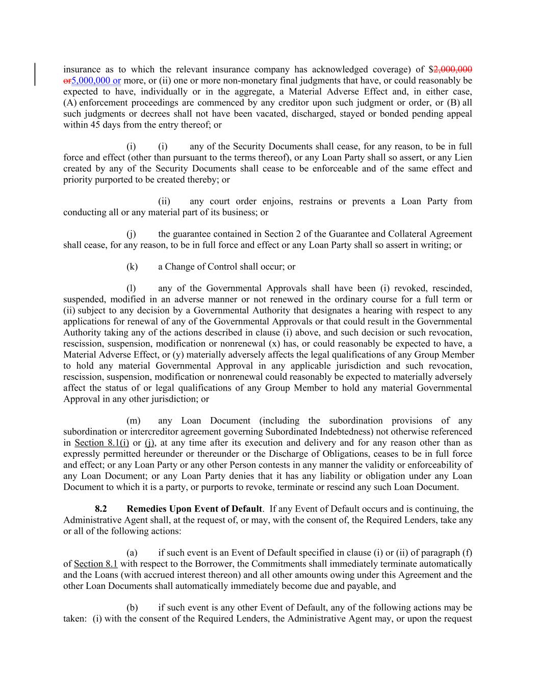 insurance as to which the relevant insurance company has acknowledged coverage) of $2,000,000 or5,000,000 or more, or (ii) one or more non-monetary final judgments that have, or could reasonably be expected to have, individually or in the aggregate, a Material Adverse Effect and, in either case, (A) enforcement proceedings are commenced by any creditor upon such judgment or order, or (B) all such judgments or decrees shall not have been vacated, discharged, stayed or bonded pending appeal within 45 days from the entry thereof; or (i) (i) any of the Security Documents shall cease, for any reason, to be in full force and effect (other than pursuant to the terms thereof), or any Loan Party shall so assert, or any Lien created by any of the Security Documents shall cease to be enforceable and of the same effect and priority purported to be created thereby; or (ii) any court order enjoins, restrains or prevents a Loan Party from conducting all or any material part of its business; or (j) the guarantee contained in Section 2 of the Guarantee and Collateral Agreement shall cease, for any reason, to be in full force and effect or any Loan Party shall so assert in writing; or (k) a Change of Control shall occur; or (l) any of the Governmental Approvals shall have been (i) revoked, rescinded, suspended, modified in an adverse manner or not renewed in the ordinary course for a full term or (ii) subject to any decision by a Governmental Authority that designates a hearing with respect to any applications for renewal of any of the Governmental Approvals or that could result in the Governmental Authority taking any of the actions described in clause (i) above, and such decision or such revocation, rescission, suspension, modification or nonrenewal (x) has, or could reasonably be expected to have, a Material Adverse Effect, or (y) materially adversely affects the legal qualifications of any Group Member to hold any material Governmental Approval in any applicable jurisdiction and such revocation, rescission, suspension, modification or nonrenewal could reasonably be expected to materially adversely affect the status of or legal qualifications of any Group Member to hold any material Governmental Approval in any other jurisdiction; or (m) any Loan Document (including the subordination provisions of any subordination or intercreditor agreement governing Subordinated Indebtedness) not otherwise referenced in Section 8.1(i) or (j), at any time after its execution and delivery and for any reason other than as expressly permitted hereunder or thereunder or the Discharge of Obligations, ceases to be in full force and effect; or any Loan Party or any other Person contests in any manner the validity or enforceability of any Loan Document; or any Loan Party denies that it has any liability or obligation under any Loan Document to which it is a party, or purports to revoke, terminate or rescind any such Loan Document. 8.2 Remedies Upon Event of Default. If any Event of Default occurs and is continuing, the Administrative Agent shall, at the request of, or may, with the consent of, the Required Lenders, take any or all of the following actions: (a) if such event is an Event of Default specified in clause (i) or (ii) of paragraph (f) of Section 8.1 with respect to the Borrower, the Commitments shall immediately terminate automatically and the Loans (with accrued interest thereon) and all other amounts owing under this Agreement and the other Loan Documents shall automatically immediately become due and payable, and (b) if such event is any other Event of Default, any of the following actions may be taken: (i) with the consent of the Required Lenders, the Administrative Agent may, or upon the request