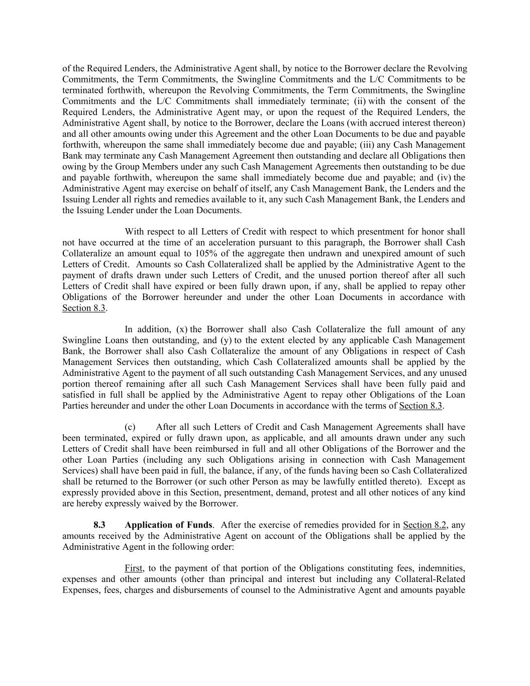 of the Required Lenders, the Administrative Agent shall, by notice to the Borrower declare the Revolving Commitments, the Term Commitments, the Swingline Commitments and the L/C Commitments to be terminated forthwith, whereupon the Revolving Commitments, the Term Commitments, the Swingline Commitments and the L/C Commitments shall immediately terminate; (ii) with the consent of the Required Lenders, the Administrative Agent may, or upon the request of the Required Lenders, the Administrative Agent shall, by notice to the Borrower, declare the Loans (with accrued interest thereon) and all other amounts owing under this Agreement and the other Loan Documents to be due and payable forthwith, whereupon the same shall immediately become due and payable; (iii) any Cash Management Bank may terminate any Cash Management Agreement then outstanding and declare all Obligations then owing by the Group Members under any such Cash Management Agreements then outstanding to be due and payable forthwith, whereupon the same shall immediately become due and payable; and (iv) the Administrative Agent may exercise on behalf of itself, any Cash Management Bank, the Lenders and the Issuing Lender all rights and remedies available to it, any such Cash Management Bank, the Lenders and the Issuing Lender under the Loan Documents. With respect to all Letters of Credit with respect to which presentment for honor shall not have occurred at the time of an acceleration pursuant to this paragraph, the Borrower shall Cash Collateralize an amount equal to 105% of the aggregate then undrawn and unexpired amount of such Letters of Credit. Amounts so Cash Collateralized shall be applied by the Administrative Agent to the payment of drafts drawn under such Letters of Credit, and the unused portion thereof after all such Letters of Credit shall have expired or been fully drawn upon, if any, shall be applied to repay other Obligations of the Borrower hereunder and under the other Loan Documents in accordance with Section 8.3. In addition, (x) the Borrower shall also Cash Collateralize the full amount of any Swingline Loans then outstanding, and (y) to the extent elected by any applicable Cash Management Bank, the Borrower shall also Cash Collateralize the amount of any Obligations in respect of Cash Management Services then outstanding, which Cash Collateralized amounts shall be applied by the Administrative Agent to the payment of all such outstanding Cash Management Services, and any unused portion thereof remaining after all such Cash Management Services shall have been fully paid and satisfied in full shall be applied by the Administrative Agent to repay other Obligations of the Loan Parties hereunder and under the other Loan Documents in accordance with the terms of Section 8.3. (c) After all such Letters of Credit and Cash Management Agreements shall have been terminated, expired or fully drawn upon, as applicable, and all amounts drawn under any such Letters of Credit shall have been reimbursed in full and all other Obligations of the Borrower and the other Loan Parties (including any such Obligations arising in connection with Cash Management Services) shall have been paid in full, the balance, if any, of the funds having been so Cash Collateralized shall be returned to the Borrower (or such other Person as may be lawfully entitled thereto). Except as expressly provided above in this Section, presentment, demand, protest and all other notices of any kind are hereby expressly waived by the Borrower. 8.3 Application of Funds. After the exercise of remedies provided for in Section 8.2, any amounts received by the Administrative Agent on account of the Obligations shall be applied by the Administrative Agent in the following order: First, to the payment of that portion of the Obligations constituting fees, indemnities, expenses and other amounts (other than principal and interest but including any Collateral-Related Expenses, fees, charges and disbursements of counsel to the Administrative Agent and amounts payable
