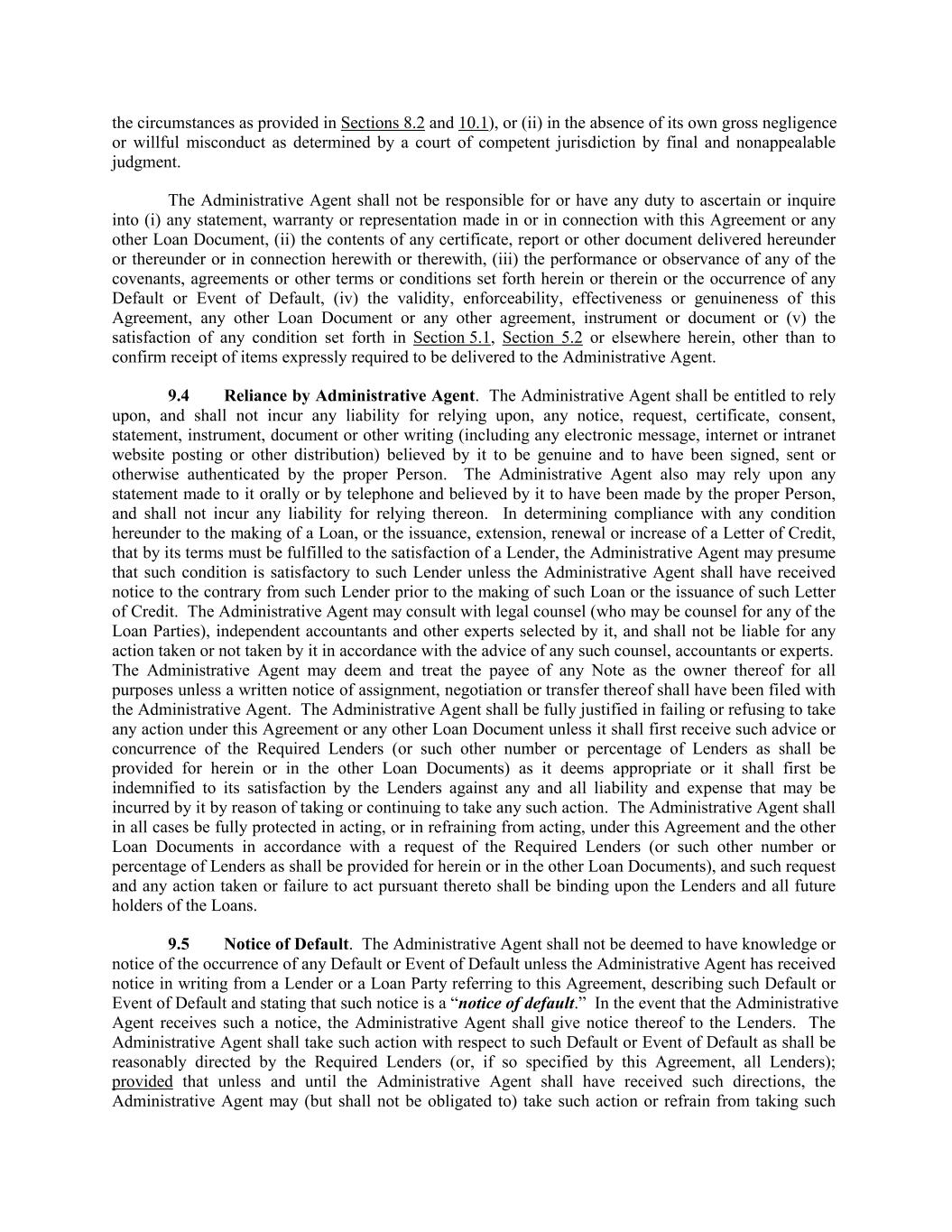 the circumstances as provided in Sections 8.2 and 10.1), or (ii) in the absence of its own gross negligence or willful misconduct as determined by a court of competent jurisdiction by final and nonappealable judgment. The Administrative Agent shall not be responsible for or have any duty to ascertain or inquire into (i) any statement, warranty or representation made in or in connection with this Agreement or any other Loan Document, (ii) the contents of any certificate, report or other document delivered hereunder or thereunder or in connection herewith or therewith, (iii) the performance or observance of any of the covenants, agreements or other terms or conditions set forth herein or therein or the occurrence of any Default or Event of Default, (iv) the validity, enforceability, effectiveness or genuineness of this Agreement, any other Loan Document or any other agreement, instrument or document or (v) the satisfaction of any condition set forth in Section 5.1, Section 5.2 or elsewhere herein, other than to confirm receipt of items expressly required to be delivered to the Administrative Agent. 9.4 Reliance by Administrative Agent. The Administrative Agent shall be entitled to rely upon, and shall not incur any liability for relying upon, any notice, request, certificate, consent, statement, instrument, document or other writing (including any electronic message, internet or intranet website posting or other distribution) believed by it to be genuine and to have been signed, sent or otherwise authenticated by the proper Person. The Administrative Agent also may rely upon any statement made to it orally or by telephone and believed by it to have been made by the proper Person, and shall not incur any liability for relying thereon. In determining compliance with any condition hereunder to the making of a Loan, or the issuance, extension, renewal or increase of a Letter of Credit, that by its terms must be fulfilled to the satisfaction of a Lender, the Administrative Agent may presume that such condition is satisfactory to such Lender unless the Administrative Agent shall have received notice to the contrary from such Lender prior to the making of such Loan or the issuance of such Letter of Credit. The Administrative Agent may consult with legal counsel (who may be counsel for any of the Loan Parties), independent accountants and other experts selected by it, and shall not be liable for any action taken or not taken by it in accordance with the advice of any such counsel, accountants or experts. The Administrative Agent may deem and treat the payee of any Note as the owner thereof for all purposes unless a written notice of assignment, negotiation or transfer thereof shall have been filed with the Administrative Agent. The Administrative Agent shall be fully justified in failing or refusing to take any action under this Agreement or any other Loan Document unless it shall first receive such advice or concurrence of the Required Lenders (or such other number or percentage of Lenders as shall be provided for herein or in the other Loan Documents) as it deems appropriate or it shall first be indemnified to its satisfaction by the Lenders against any and all liability and expense that may be incurred by it by reason of taking or continuing to take any such action. The Administrative Agent shall in all cases be fully protected in acting, or in refraining from acting, under this Agreement and the other Loan Documents in accordance with a request of the Required Lenders (or such other number or percentage of Lenders as shall be provided for herein or in the other Loan Documents), and such request and any action taken or failure to act pursuant thereto shall be binding upon the Lenders and all future holders of the Loans. 9.5 Notice of Default. The Administrative Agent shall not be deemed to have knowledge or notice of the occurrence of any Default or Event of Default unless the Administrative Agent has received notice in writing from a Lender or a Loan Party referring to this Agreement, describing such Default or Event of Default and stating that such notice is a “notice of default.” In the event that the Administrative Agent receives such a notice, the Administrative Agent shall give notice thereof to the Lenders. The Administrative Agent shall take such action with respect to such Default or Event of Default as shall be reasonably directed by the Required Lenders (or, if so specified by this Agreement, all Lenders); provided that unless and until the Administrative Agent shall have received such directions, the Administrative Agent may (but shall not be obligated to) take such action or refrain from taking such