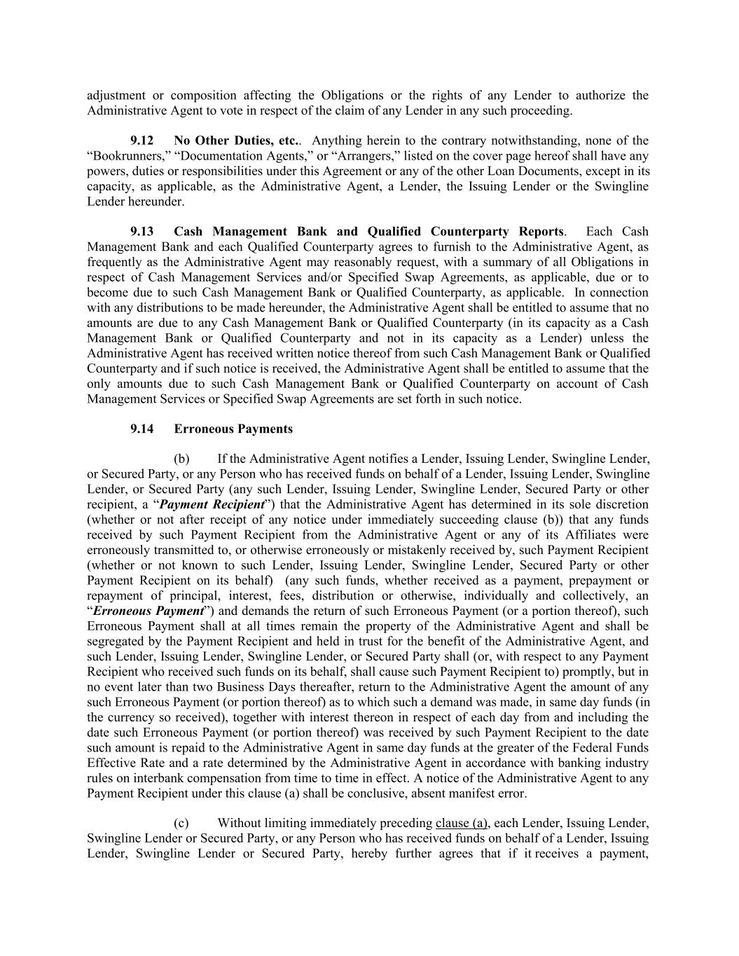 adjustment or composition affecting the Obligations or the rights of any Lender to authorize the Administrative Agent to vote in respect of the claim of any Lender in any such proceeding. 9.12 No Other Duties, etc.. Anything herein to the contrary notwithstanding, none of the “Bookrunners,” “Documentation Agents,” or “Arrangers,” listed on the cover page hereof shall have any powers, duties or responsibilities under this Agreement or any of the other Loan Documents, except in its capacity, as applicable, as the Administrative Agent, a Lender, the Issuing Lender or the Swingline Lender hereunder. 9.13 Cash Management Bank and Qualified Counterparty Reports. Each Cash Management Bank and each Qualified Counterparty agrees to furnish to the Administrative Agent, as frequently as the Administrative Agent may reasonably request, with a summary of all Obligations in respect of Cash Management Services and/or Specified Swap Agreements, as applicable, due or to become due to such Cash Management Bank or Qualified Counterparty, as applicable. In connection with any distributions to be made hereunder, the Administrative Agent shall be entitled to assume that no amounts are due to any Cash Management Bank or Qualified Counterparty (in its capacity as a Cash Management Bank or Qualified Counterparty and not in its capacity as a Lender) unless the Administrative Agent has received written notice thereof from such Cash Management Bank or Qualified Counterparty and if such notice is received, the Administrative Agent shall be entitled to assume that the only amounts due to such Cash Management Bank or Qualified Counterparty on account of Cash Management Services or Specified Swap Agreements are set forth in such notice. 9.14 Erroneous Payments (b) If the Administrative Agent notifies a Lender, Issuing Lender, Swingline Lender, or Secured Party, or any Person who has received funds on behalf of a Lender, Issuing Lender, Swingline Lender, or Secured Party (any such Lender, Issuing Lender, Swingline Lender, Secured Party or other recipient, a “Payment Recipient”) that the Administrative Agent has determined in its sole discretion (whether or not after receipt of any notice under immediately succeeding clause (b)) that any funds received by such Payment Recipient from the Administrative Agent or any of its Affiliates were erroneously transmitted to, or otherwise erroneously or mistakenly received by, such Payment Recipient (whether or not known to such Lender, Issuing Lender, Swingline Lender, Secured Party or other Payment Recipient on its behalf) (any such funds, whether received as a payment, prepayment or repayment of principal, interest, fees, distribution or otherwise, individually and collectively, an “Erroneous Payment”) and demands the return of such Erroneous Payment (or a portion thereof), such Erroneous Payment shall at all times remain the property of the Administrative Agent and shall be segregated by the Payment Recipient and held in trust for the benefit of the Administrative Agent, and such Lender, Issuing Lender, Swingline Lender, or Secured Party shall (or, with respect to any Payment Recipient who received such funds on its behalf, shall cause such Payment Recipient to) promptly, but in no event later than two Business Days thereafter, return to the Administrative Agent the amount of any such Erroneous Payment (or portion thereof) as to which such a demand was made, in same day funds (in the currency so received), together with interest thereon in respect of each day from and including the date such Erroneous Payment (or portion thereof) was received by such Payment Recipient to the date such amount is repaid to the Administrative Agent in same day funds at the greater of the Federal Funds Effective Rate and a rate determined by the Administrative Agent in accordance with banking industry rules on interbank compensation from time to time in effect. A notice of the Administrative Agent to any Payment Recipient under this clause (a) shall be conclusive, absent manifest error. (c) Without limiting immediately preceding clause (a), each Lender, Issuing Lender, Swingline Lender or Secured Party, or any Person who has received funds on behalf of a Lender, Issuing Lender, Swingline Lender or Secured Party, hereby further agrees that if it receives a payment,