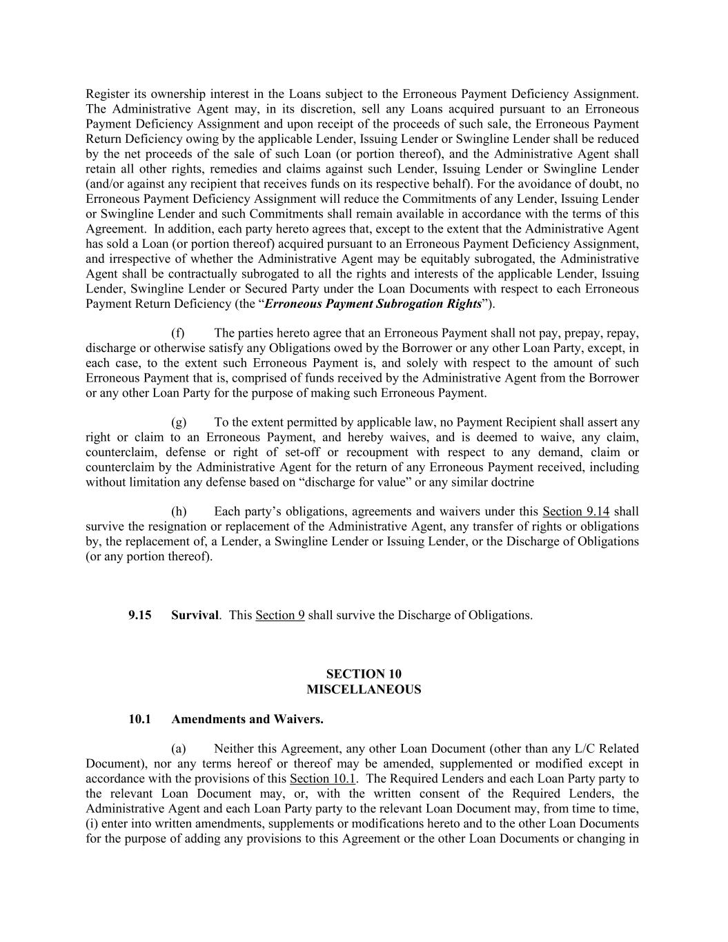 Register its ownership interest in the Loans subject to the Erroneous Payment Deficiency Assignment. The Administrative Agent may, in its discretion, sell any Loans acquired pursuant to an Erroneous Payment Deficiency Assignment and upon receipt of the proceeds of such sale, the Erroneous Payment Return Deficiency owing by the applicable Lender, Issuing Lender or Swingline Lender shall be reduced by the net proceeds of the sale of such Loan (or portion thereof), and the Administrative Agent shall retain all other rights, remedies and claims against such Lender, Issuing Lender or Swingline Lender (and/or against any recipient that receives funds on its respective behalf). For the avoidance of doubt, no Erroneous Payment Deficiency Assignment will reduce the Commitments of any Lender, Issuing Lender or Swingline Lender and such Commitments shall remain available in accordance with the terms of this Agreement. In addition, each party hereto agrees that, except to the extent that the Administrative Agent has sold a Loan (or portion thereof) acquired pursuant to an Erroneous Payment Deficiency Assignment, and irrespective of whether the Administrative Agent may be equitably subrogated, the Administrative Agent shall be contractually subrogated to all the rights and interests of the applicable Lender, Issuing Lender, Swingline Lender or Secured Party under the Loan Documents with respect to each Erroneous Payment Return Deficiency (the “Erroneous Payment Subrogation Rights”). (f) The parties hereto agree that an Erroneous Payment shall not pay, prepay, repay, discharge or otherwise satisfy any Obligations owed by the Borrower or any other Loan Party, except, in each case, to the extent such Erroneous Payment is, and solely with respect to the amount of such Erroneous Payment that is, comprised of funds received by the Administrative Agent from the Borrower or any other Loan Party for the purpose of making such Erroneous Payment. (g) To the extent permitted by applicable law, no Payment Recipient shall assert any right or claim to an Erroneous Payment, and hereby waives, and is deemed to waive, any claim, counterclaim, defense or right of set-off or recoupment with respect to any demand, claim or counterclaim by the Administrative Agent for the return of any Erroneous Payment received, including without limitation any defense based on “discharge for value” or any similar doctrine (h) Each party’s obligations, agreements and waivers under this Section 9.14 shall survive the resignation or replacement of the Administrative Agent, any transfer of rights or obligations by, the replacement of, a Lender, a Swingline Lender or Issuing Lender, or the Discharge of Obligations (or any portion thereof). 9.15 Survival. This Section 9 shall survive the Discharge of Obligations. SECTION 10 MISCELLANEOUS 10.1 Amendments and Waivers. (a) Neither this Agreement, any other Loan Document (other than any L/C Related Document), nor any terms hereof or thereof may be amended, supplemented or modified except in accordance with the provisions of this Section 10.1. The Required Lenders and each Loan Party party to the relevant Loan Document may, or, with the written consent of the Required Lenders, the Administrative Agent and each Loan Party party to the relevant Loan Document may, from time to time, (i) enter into written amendments, supplements or modifications hereto and to the other Loan Documents for the purpose of adding any provisions to this Agreement or the other Loan Documents or changing in