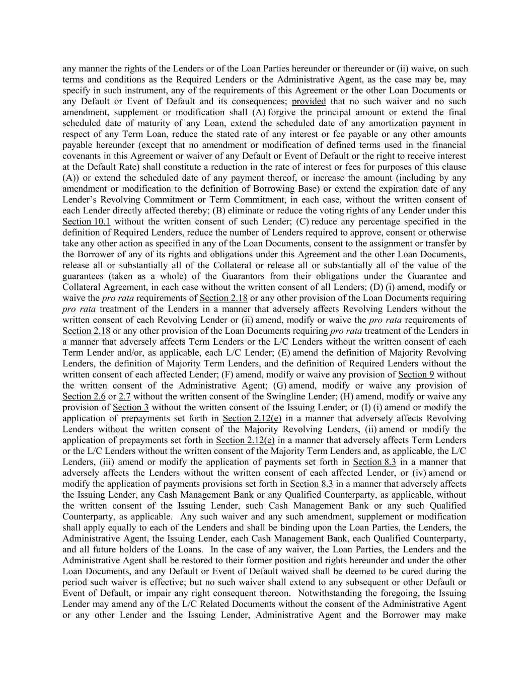 any manner the rights of the Lenders or of the Loan Parties hereunder or thereunder or (ii) waive, on such terms and conditions as the Required Lenders or the Administrative Agent, as the case may be, may specify in such instrument, any of the requirements of this Agreement or the other Loan Documents or any Default or Event of Default and its consequences; provided that no such waiver and no such amendment, supplement or modification shall (A) forgive the principal amount or extend the final scheduled date of maturity of any Loan, extend the scheduled date of any amortization payment in respect of any Term Loan, reduce the stated rate of any interest or fee payable or any other amounts payable hereunder (except that no amendment or modification of defined terms used in the financial covenants in this Agreement or waiver of any Default or Event of Default or the right to receive interest at the Default Rate) shall constitute a reduction in the rate of interest or fees for purposes of this clause (A)) or extend the scheduled date of any payment thereof, or increase the amount (including by any amendment or modification to the definition of Borrowing Base) or extend the expiration date of any Lender’s Revolving Commitment or Term Commitment, in each case, without the written consent of each Lender directly affected thereby; (B) eliminate or reduce the voting rights of any Lender under this Section 10.1 without the written consent of such Lender; (C) reduce any percentage specified in the definition of Required Lenders, reduce the number of Lenders required to approve, consent or otherwise take any other action as specified in any of the Loan Documents, consent to the assignment or transfer by the Borrower of any of its rights and obligations under this Agreement and the other Loan Documents, release all or substantially all of the Collateral or release all or substantially all of the value of the guarantees (taken as a whole) of the Guarantors from their obligations under the Guarantee and Collateral Agreement, in each case without the written consent of all Lenders; (D) (i) amend, modify or waive the pro rata requirements of Section 2.18 or any other provision of the Loan Documents requiring pro rata treatment of the Lenders in a manner that adversely affects Revolving Lenders without the written consent of each Revolving Lender or (ii) amend, modify or waive the pro rata requirements of Section 2.18 or any other provision of the Loan Documents requiring pro rata treatment of the Lenders in a manner that adversely affects Term Lenders or the L/C Lenders without the written consent of each Term Lender and/or, as applicable, each L/C Lender; (E) amend the definition of Majority Revolving Lenders, the definition of Majority Term Lenders, and the definition of Required Lenders without the written consent of each affected Lender; (F) amend, modify or waive any provision of Section 9 without the written consent of the Administrative Agent; (G) amend, modify or waive any provision of Section 2.6 or 2.7 without the written consent of the Swingline Lender; (H) amend, modify or waive any provision of Section 3 without the written consent of the Issuing Lender; or (I) (i) amend or modify the application of prepayments set forth in Section 2.12(e) in a manner that adversely affects Revolving Lenders without the written consent of the Majority Revolving Lenders, (ii) amend or modify the application of prepayments set forth in Section 2.12(e) in a manner that adversely affects Term Lenders or the L/C Lenders without the written consent of the Majority Term Lenders and, as applicable, the L/C Lenders, (iii) amend or modify the application of payments set forth in Section 8.3 in a manner that adversely affects the Lenders without the written consent of each affected Lender, or (iv) amend or modify the application of payments provisions set forth in Section 8.3 in a manner that adversely affects the Issuing Lender, any Cash Management Bank or any Qualified Counterparty, as applicable, without the written consent of the Issuing Lender, such Cash Management Bank or any such Qualified Counterparty, as applicable. Any such waiver and any such amendment, supplement or modification shall apply equally to each of the Lenders and shall be binding upon the Loan Parties, the Lenders, the Administrative Agent, the Issuing Lender, each Cash Management Bank, each Qualified Counterparty, and all future holders of the Loans. In the case of any waiver, the Loan Parties, the Lenders and the Administrative Agent shall be restored to their former position and rights hereunder and under the other Loan Documents, and any Default or Event of Default waived shall be deemed to be cured during the period such waiver is effective; but no such waiver shall extend to any subsequent or other Default or Event of Default, or impair any right consequent thereon. Notwithstanding the foregoing, the Issuing Lender may amend any of the L/C Related Documents without the consent of the Administrative Agent or any other Lender and the Issuing Lender, Administrative Agent and the Borrower may make