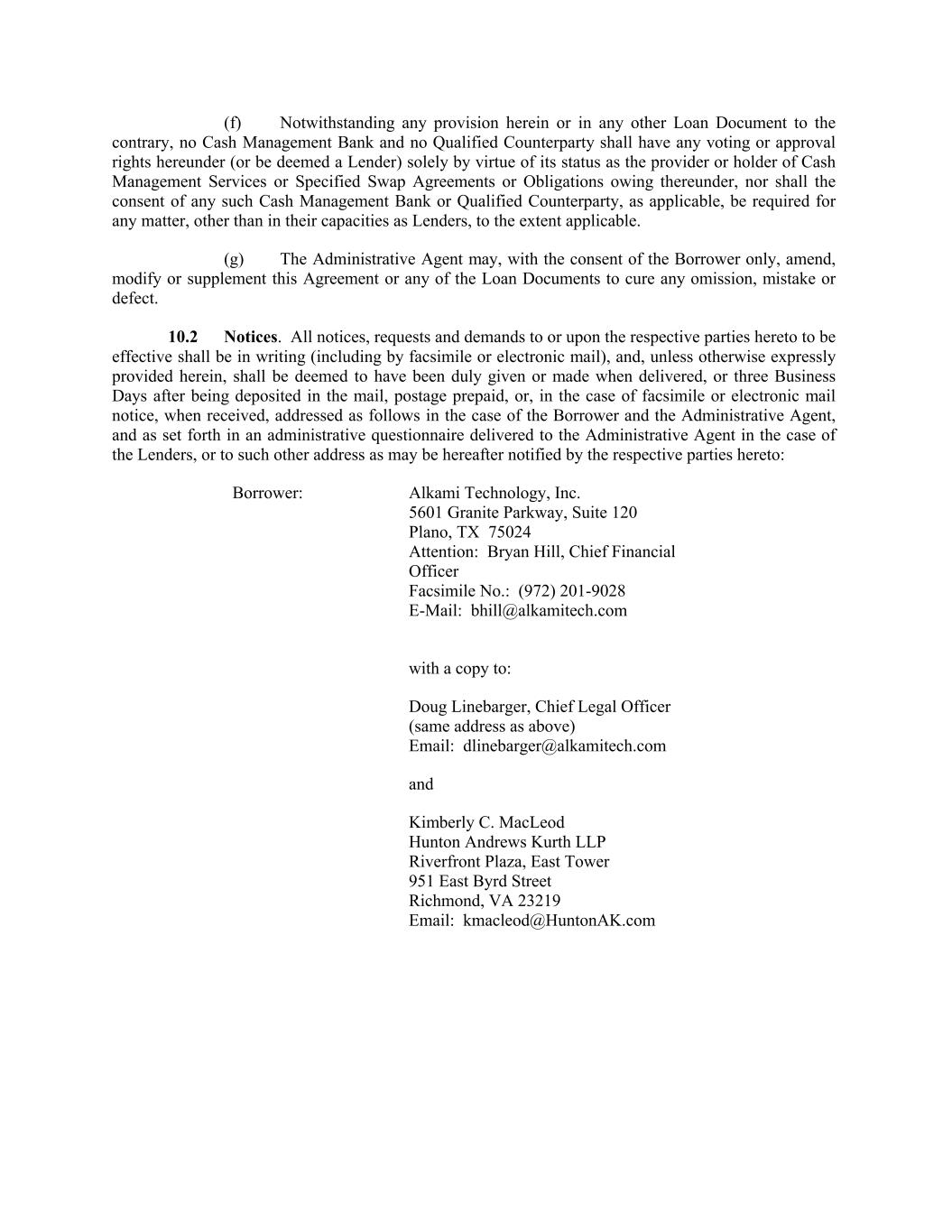 Alkami Technology, Inc. 5601 Granite Parkway, Suite 120 Plano, TX 75024 Attention: Bryan Hill, Chief Financial Officer Facsimile No.: (972) 201-9028 E-Mail: bhill@alkamitech.com (f) Notwithstanding any provision herein or in any other Loan Document to the contrary, no Cash Management Bank and no Qualified Counterparty shall have any voting or approval rights hereunder (or be deemed a Lender) solely by virtue of its status as the provider or holder of Cash Management Services or Specified Swap Agreements or Obligations owing thereunder, nor shall the consent of any such Cash Management Bank or Qualified Counterparty, as applicable, be required for any matter, other than in their capacities as Lenders, to the extent applicable. (g) The Administrative Agent may, with the consent of the Borrower only, amend, modify or supplement this Agreement or any of the Loan Documents to cure any omission, mistake or defect. 10.2 Notices. All notices, requests and demands to or upon the respective parties hereto to be effective shall be in writing (including by facsimile or electronic mail), and, unless otherwise expressly provided herein, shall be deemed to have been duly given or made when delivered, or three Business Days after being deposited in the mail, postage prepaid, or, in the case of facsimile or electronic mail notice, when received, addressed as follows in the case of the Borrower and the Administrative Agent, and as set forth in an administrative questionnaire delivered to the Administrative Agent in the case of the Lenders, or to such other address as may be hereafter notified by the respective parties hereto: with a copy to: Doug Linebarger, Chief Legal Officer (same address as above) Email: dlinebarger@alkamitech.com and Kimberly C. MacLeod Hunton Andrews Kurth LLP Riverfront Plaza, East Tower 951 East Byrd Street Richmond, VA 23219 Email: kmacleod@HuntonAK.com Borrower: