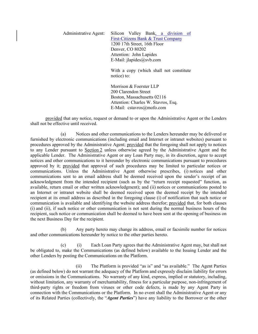 Administrative Agent: Silicon Valley Bank, a division of First-Citizens Bank & Trust Company 1200 17th Street, 16th Floor Denver, CO 80202 Attention: John Lapides E-Mail: jlapides@svb.com With a copy (which shall not constitute notice) to: Morrison & Foerster LLP 200 Clarendon Street Boston, Massachusetts 02116 Attention: Charles W. Stavros, Esq. E-Mail: cstavros@mofo.com provided that any notice, request or demand to or upon the Administrative Agent or the Lenders shall not be effective until received. (a) Notices and other communications to the Lenders hereunder may be delivered or furnished by electronic communications (including email and Internet or intranet websites) pursuant to procedures approved by the Administrative Agent; provided that the foregoing shall not apply to notices to any Lender pursuant to Section 2 unless otherwise agreed by the Administrative Agent and the applicable Lender. The Administrative Agent or any Loan Party may, in its discretion, agree to accept notices and other communications to it hereunder by electronic communications pursuant to procedures approved by it; provided that approval of such procedures may be limited to particular notices or communications. Unless the Administrative Agent otherwise prescribes, (i) notices and other communications sent to an email address shall be deemed received upon the sender’s receipt of an acknowledgment from the intended recipient (such as by the “return receipt requested” function, as available, return email or other written acknowledgment); and (ii) notices or communications posted to an Internet or intranet website shall be deemed received upon the deemed receipt by the intended recipient at its email address as described in the foregoing clause (i) of notification that such notice or communication is available and identifying the website address therefor; provided that, for both clauses (i) and (ii), if such notice or other communication is not sent during the normal business hours of the recipient, such notice or communication shall be deemed to have been sent at the opening of business on the next Business Day for the recipient. (b) Any party hereto may change its address, email or facsimile number for notices and other communications hereunder by notice to the other parties hereto. (c) (i) Each Loan Party agrees that the Administrative Agent may, but shall not be obligated to, make the Communications (as defined below) available to the Issuing Lender and the other Lenders by posting the Communications on the Platform. (ii) The Platform is provided “as is” and “as available.” The Agent Parties (as defined below) do not warrant the adequacy of the Platform and expressly disclaim liability for errors or omissions in the Communications. No warranty of any kind, express, implied or statutory, including, without limitation, any warranty of merchantability, fitness for a particular purpose, non-infringement of third-party rights or freedom from viruses or other code defects, is made by any Agent Party in connection with the Communications or the Platform. In no event shall the Administrative Agent or any of its Related Parties (collectively, the “Agent Parties”) have any liability to the Borrower or the other