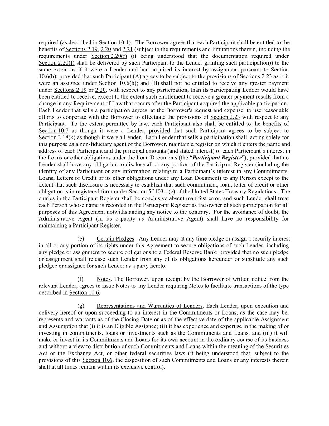 required (as described in Section 10.1). The Borrower agrees that each Participant shall be entitled to the benefits of Sections 2.19, 2.20 and 2.21 (subject to the requirements and limitations therein, including the requirements under Section 2.20(f) (it being understood that the documentation required under Section 2.20(f) shall be delivered by such Participant to the Lender granting such participation)) to the same extent as if it were a Lender and had acquired its interest by assignment pursuant to Section 10.6(b); provided that such Participant (A) agrees to be subject to the provisions of Sections 2.23 as if it were an assignee under Section 10.6(b); and (B) shall not be entitled to receive any greater payment under Sections 2.19 or 2.20, with respect to any participation, than its participating Lender would have been entitled to receive, except to the extent such entitlement to receive a greater payment results from a change in any Requirement of Law that occurs after the Participant acquired the applicable participation. Each Lender that sells a participation agrees, at the Borrower's request and expense, to use reasonable efforts to cooperate with the Borrower to effectuate the provisions of Section 2.23 with respect to any Participant. To the extent permitted by law, each Participant also shall be entitled to the benefits of Section 10.7 as though it were a Lender; provided that such Participant agrees to be subject to Section 2.18(k) as though it were a Lender. Each Lender that sells a participation shall, acting solely for this purpose as a non-fiduciary agent of the Borrower, maintain a register on which it enters the name and address of each Participant and the principal amounts (and stated interest) of each Participant’s interest in the Loans or other obligations under the Loan Documents (the “Participant Register”); provided that no Lender shall have any obligation to disclose all or any portion of the Participant Register (including the identity of any Participant or any information relating to a Participant’s interest in any Commitments, Loans, Letters of Credit or its other obligations under any Loan Document) to any Person except to the extent that such disclosure is necessary to establish that such commitment, loan, letter of credit or other obligation is in registered form under Section 5f.103-1(c) of the United States Treasury Regulations. The entries in the Participant Register shall be conclusive absent manifest error, and such Lender shall treat each Person whose name is recorded in the Participant Register as the owner of such participation for all purposes of this Agreement notwithstanding any notice to the contrary. For the avoidance of doubt, the Administrative Agent (in its capacity as Administrative Agent) shall have no responsibility for maintaining a Participant Register. (e) Certain Pledges. Any Lender may at any time pledge or assign a security interest in all or any portion of its rights under this Agreement to secure obligations of such Lender, including any pledge or assignment to secure obligations to a Federal Reserve Bank; provided that no such pledge or assignment shall release such Lender from any of its obligations hereunder or substitute any such pledgee or assignee for such Lender as a party hereto. (f) Notes. The Borrower, upon receipt by the Borrower of written notice from the relevant Lender, agrees to issue Notes to any Lender requiring Notes to facilitate transactions of the type described in Section 10.6. (g) Representations and Warranties of Lenders. Each Lender, upon execution and delivery hereof or upon succeeding to an interest in the Commitments or Loans, as the case may be, represents and warrants as of the Closing Date or as of the effective date of the applicable Assignment and Assumption that (i) it is an Eligible Assignee; (ii) it has experience and expertise in the making of or investing in commitments, loans or investments such as the Commitments and Loans; and (iii) it will make or invest in its Commitments and Loans for its own account in the ordinary course of its business and without a view to distribution of such Commitments and Loans within the meaning of the Securities Act or the Exchange Act, or other federal securities laws (it being understood that, subject to the provisions of this Section 10.6, the disposition of such Commitments and Loans or any interests therein shall at all times remain within its exclusive control).