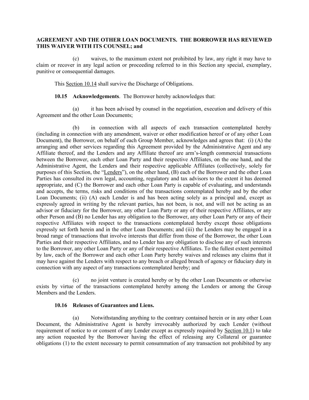 AGREEMENT AND THE OTHER LOAN DOCUMENTS. THE BORROWER HAS REVIEWED THIS WAIVER WITH ITS COUNSEL; and (c) waives, to the maximum extent not prohibited by law, any right it may have to claim or recover in any legal action or proceeding referred to in this Section any special, exemplary, punitive or consequential damages. This Section 10.14 shall survive the Discharge of Obligations. 10.15 Acknowledgements. The Borrower hereby acknowledges that: (a) it has been advised by counsel in the negotiation, execution and delivery of this Agreement and the other Loan Documents; (b) in connection with all aspects of each transaction contemplated hereby (including in connection with any amendment, waiver or other modification hereof or of any other Loan Document), the Borrower, on behalf of each Group Member, acknowledges and agrees that: (i) (A) the arranging and other services regarding this Agreement provided by the Administrative Agent and any Affiliate thereof, and the Lenders and any Affiliate thereof are arm’s-length commercial transactions between the Borrower, each other Loan Party and their respective Affiliates, on the one hand, and the Administrative Agent, the Lenders and their respective applicable Affiliates (collectively, solely for purposes of this Section, the “Lenders”), on the other hand, (B) each of the Borrower and the other Loan Parties has consulted its own legal, accounting, regulatory and tax advisors to the extent it has deemed appropriate, and (C) the Borrower and each other Loan Party is capable of evaluating, and understands and accepts, the terms, risks and conditions of the transactions contemplated hereby and by the other Loan Documents; (ii) (A) each Lender is and has been acting solely as a principal and, except as expressly agreed in writing by the relevant parties, has not been, is not, and will not be acting as an advisor or fiduciary for the Borrower, any other Loan Party or any of their respective Affiliates, or any other Person and (B) no Lender has any obligation to the Borrower, any other Loan Party or any of their respective Affiliates with respect to the transactions contemplated hereby except those obligations expressly set forth herein and in the other Loan Documents; and (iii) the Lenders may be engaged in a broad range of transactions that involve interests that differ from those of the Borrower, the other Loan Parties and their respective Affiliates, and no Lender has any obligation to disclose any of such interests to the Borrower, any other Loan Party or any of their respective Affiliates. To the fullest extent permitted by law, each of the Borrower and each other Loan Party hereby waives and releases any claims that it may have against the Lenders with respect to any breach or alleged breach of agency or fiduciary duty in connection with any aspect of any transactions contemplated hereby; and (c) no joint venture is created hereby or by the other Loan Documents or otherwise exists by virtue of the transactions contemplated hereby among the Lenders or among the Group Members and the Lenders. 10.16 Releases of Guarantees and Liens. (a) Notwithstanding anything to the contrary contained herein or in any other Loan Document, the Administrative Agent is hereby irrevocably authorized by each Lender (without requirement of notice to or consent of any Lender except as expressly required by Section 10.1) to take any action requested by the Borrower having the effect of releasing any Collateral or guarantee obligations (1) to the extent necessary to permit consummation of any transaction not prohibited by any