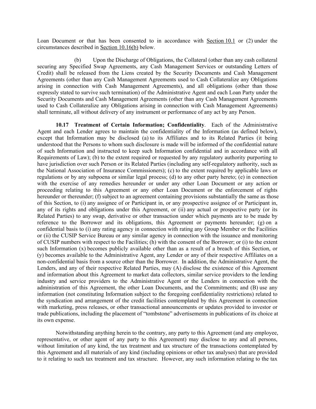 Loan Document or that has been consented to in accordance with Section 10.1 or (2) under the circumstances described in Section 10.16(b) below. (b) Upon the Discharge of Obligations, the Collateral (other than any cash collateral securing any Specified Swap Agreements, any Cash Management Services or outstanding Letters of Credit) shall be released from the Liens created by the Security Documents and Cash Management Agreements (other than any Cash Management Agreements used to Cash Collateralize any Obligations arising in connection with Cash Management Agreements), and all obligations (other than those expressly stated to survive such termination) of the Administrative Agent and each Loan Party under the Security Documents and Cash Management Agreements (other than any Cash Management Agreements used to Cash Collateralize any Obligations arising in connection with Cash Management Agreements) shall terminate, all without delivery of any instrument or performance of any act by any Person. 10.17 Treatment of Certain Information; Confidentiality. Each of the Administrative Agent and each Lender agrees to maintain the confidentiality of the Information (as defined below), except that Information may be disclosed (a) to its Affiliates and to its Related Parties (it being understood that the Persons to whom such disclosure is made will be informed of the confidential nature of such Information and instructed to keep such Information confidential and in accordance with all Requirements of Law); (b) to the extent required or requested by any regulatory authority purporting to have jurisdiction over such Person or its Related Parties (including any self-regulatory authority, such as the National Association of Insurance Commissioners); (c) to the extent required by applicable laws or regulations or by any subpoena or similar legal process; (d) to any other party hereto; (e) in connection with the exercise of any remedies hereunder or under any other Loan Document or any action or proceeding relating to this Agreement or any other Loan Document or the enforcement of rights hereunder or thereunder; (f) subject to an agreement containing provisions substantially the same as those of this Section, to (i) any assignee of or Participant in, or any prospective assignee of or Participant in, any of its rights and obligations under this Agreement, or (ii) any actual or prospective party (or its Related Parties) to any swap, derivative or other transaction under which payments are to be made by reference to the Borrower and its obligations, this Agreement or payments hereunder; (g) on a confidential basis to (i) any rating agency in connection with rating any Group Member or the Facilities or (ii) the CUSIP Service Bureau or any similar agency in connection with the issuance and monitoring of CUSIP numbers with respect to the Facilities; (h) with the consent of the Borrower; or (i) to the extent such Information (x) becomes publicly available other than as a result of a breach of this Section, or (y) becomes available to the Administrative Agent, any Lender or any of their respective Affiliates on a non-confidential basis from a source other than the Borrower. In addition, the Administrative Agent, the Lenders, and any of their respective Related Parties, may (A) disclose the existence of this Agreement and information about this Agreement to market data collectors, similar service providers to the lending industry and service providers to the Administrative Agent or the Lenders in connection with the administration of this Agreement, the other Loan Documents, and the Commitments; and (B) use any information (not constituting Information subject to the foregoing confidentiality restrictions) related to the syndication and arrangement of the credit facilities contemplated by this Agreement in connection with marketing, press releases, or other transactional announcements or updates provided to investor or trade publications, including the placement of “tombstone” advertisements in publications of its choice at its own expense. Notwithstanding anything herein to the contrary, any party to this Agreement (and any employee, representative, or other agent of any party to this Agreement) may disclose to any and all persons, without limitation of any kind, the tax treatment and tax structure of the transactions contemplated by this Agreement and all materials of any kind (including opinions or other tax analyses) that are provided to it relating to such tax treatment and tax structure. However, any such information relating to the tax
