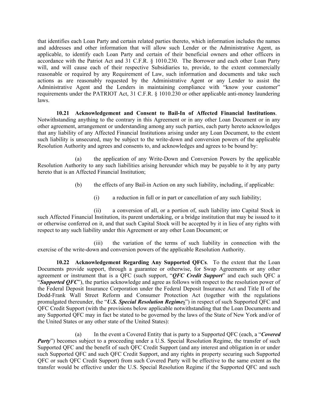 that identifies each Loan Party and certain related parties thereto, which information includes the names and addresses and other information that will allow such Lender or the Administrative Agent, as applicable, to identify each Loan Party and certain of their beneficial owners and other officers in accordance with the Patriot Act and 31 C.F.R. § 1010.230. The Borrower and each other Loan Party will, and will cause each of their respective Subsidiaries to, provide, to the extent commercially reasonable or required by any Requirement of Law, such information and documents and take such actions as are reasonably requested by the Administrative Agent or any Lender to assist the Administrative Agent and the Lenders in maintaining compliance with “know your customer” requirements under the PATRIOT Act, 31 C.F.R. § 1010.230 or other applicable anti-money laundering laws. 10.21 Acknowledgement and Consent to Bail-In of Affected Financial Institutions. Notwithstanding anything to the contrary in this Agreement or in any other Loan Document or in any other agreement, arrangement or understanding among any such parties, each party hereto acknowledges that any liability of any Affected Financial Institutions arising under any Loan Document, to the extent such liability is unsecured, may be subject to the write-down and conversion powers of the applicable Resolution Authority and agrees and consents to, and acknowledges and agrees to be bound by: (a) the application of any Write-Down and Conversion Powers by the applicable Resolution Authority to any such liabilities arising hereunder which may be payable to it by any party hereto that is an Affected Financial Institution; (b) the effects of any Bail-in Action on any such liability, including, if applicable: (i) a reduction in full or in part or cancellation of any such liability; (ii) a conversion of all, or a portion of, such liability into Capital Stock in such Affected Financial Institution, its parent undertaking, or a bridge institution that may be issued to it or otherwise conferred on it, and that such Capital Stock will be accepted by it in lieu of any rights with respect to any such liability under this Agreement or any other Loan Document; or (iii) the variation of the terms of such liability in connection with the exercise of the write-down and conversion powers of the applicable Resolution Authority. 10.22 Acknowledgement Regarding Any Supported QFCs. To the extent that the Loan Documents provide support, through a guarantee or otherwise, for Swap Agreements or any other agreement or instrument that is a QFC (such support, “QFC Credit Support” and each such QFC a “Supported QFC”), the parties acknowledge and agree as follows with respect to the resolution power of the Federal Deposit Insurance Corporation under the Federal Deposit Insurance Act and Title II of the Dodd-Frank Wall Street Reform and Consumer Protection Act (together with the regulations promulgated thereunder, the “U.S. Special Resolution Regimes”) in respect of such Supported QFC and QFC Credit Support (with the provisions below applicable notwithstanding that the Loan Documents and any Supported QFC may in fact be stated to be governed by the laws of the State of New York and/or of the United States or any other state of the United States): (a) In the event a Covered Entity that is party to a Supported QFC (each, a “Covered Party”) becomes subject to a proceeding under a U.S. Special Resolution Regime, the transfer of such Supported QFC and the benefit of such QFC Credit Support (and any interest and obligation in or under such Supported QFC and such QFC Credit Support, and any rights in property securing such Supported QFC or such QFC Credit Support) from such Covered Party will be effective to the same extent as the transfer would be effective under the U.S. Special Resolution Regime if the Supported QFC and such