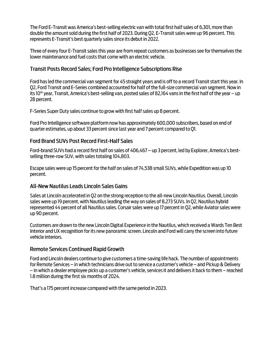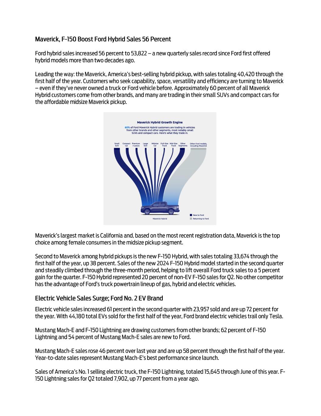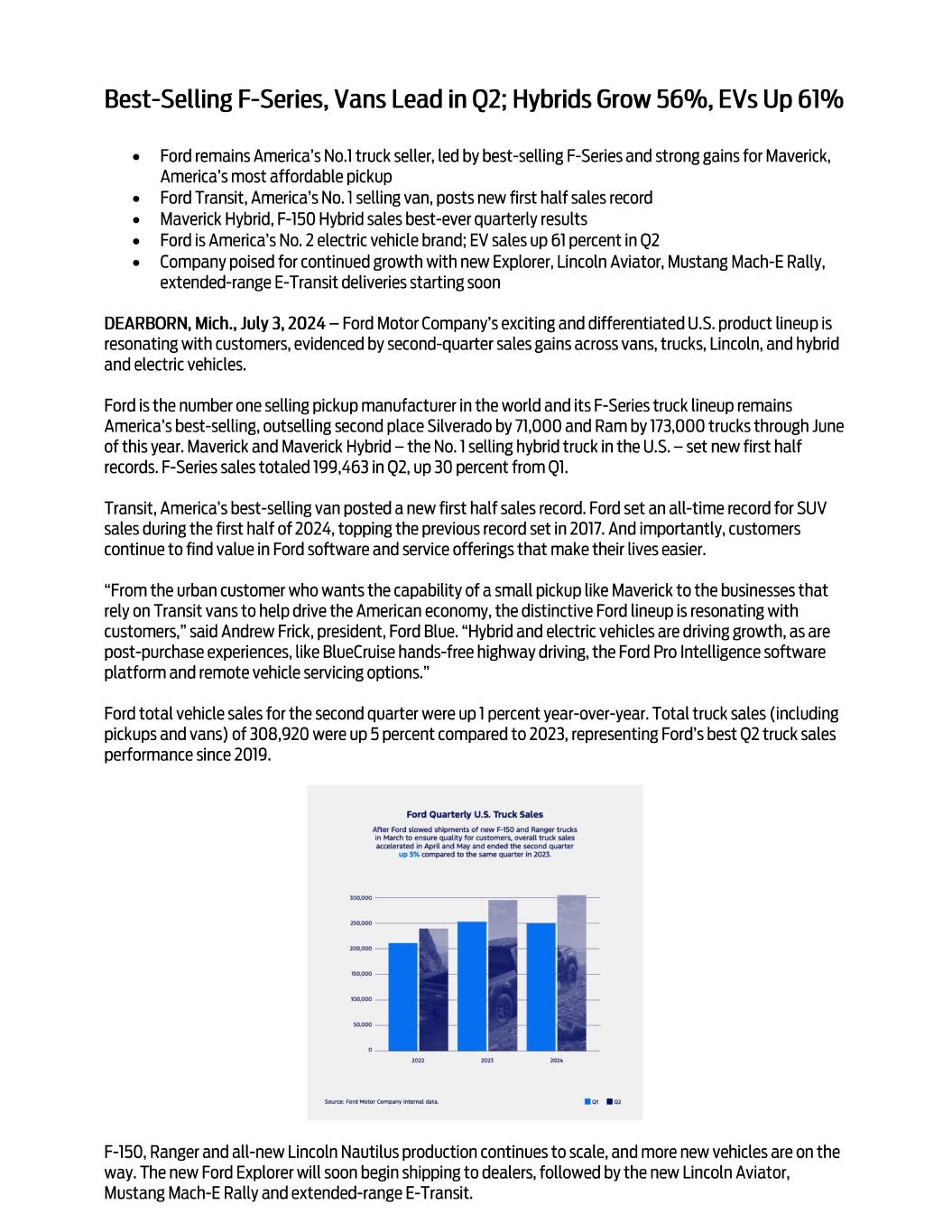 For news releases, related materials and high-resolution photos and video, visit www.media.ford.com. 6 • Ford may face increased price competition or a reduction in demand for its products resulting from industry excess capacity, currency fluctuations, competitive actions, or other factors, particularly for electric vehicles; • Inflationary pressure and fluctuations in commodity and energy prices, foreign currency exchange rates, interest rates, and market value of Ford or Ford Credit’s investments, including marketable securities, can have a significant effect on results; • Ford and Ford Credit’s access to debt, securitization, or derivative markets around the world at competitive rates or in sufficient amounts could be affected by credit rating downgrades, market volatility, market disruption, regulatory requirements, or other factors; • The impact of government incentives on Ford’s business could be significant, and Ford’s receipt of government incentives could be subject to reduction, termination, or clawback; • Ford Credit could experience higher-than-expected credit losses, lower-than-anticipated residual values, or higher-than-expected return volumes for leased vehicles; • Economic and demographic experience for pension and OPEB plans (e.g., discount rates or investment returns) could be worse than Ford has assumed; • Pension and other postretirement liabilities could adversely affect Ford’s liquidity and financial condition; • Ford and Ford Credit could experience unusual or significant litigation, governmental investigations, or adverse publicity arising out of alleged defects in products, services, perceived environmental impacts, or otherwise; • Ford may need to substantially modify its product plans and facilities to comply with safety, emissions, fuel economy, autonomous driving technology, environmental, and other regulations; • Ford and Ford Credit could be affected by the continued development of more stringent privacy, data use, data protection, and artificial intelligence laws and regulations as well as consumers’ heightened expectations to safeguard their personal information; and • Ford Credit could be subject to new or increased credit regulations, consumer protection regulations, or other regulations. We cannot be certain that any expectation, forecast, or assumption made in preparing forward-looking statements will prove accurate, or that any projection will be realized. It is to be expected that there may be differences between projected and actual results. Our forward-looking statements speak only as of the date of their initial issuance, and we do not undertake any obligation to update or revise publicly any forward-looking statement, whether as a result of new information, future events, or otherwise. For additional discussion, see “Item 1A. Risk Factors” in our Annual Report on Form 10-K for the year ended December 31, 2023, as updated by our subsequent Quarterly Reports on Form 10-Q and Current Reports on Form 8-K.