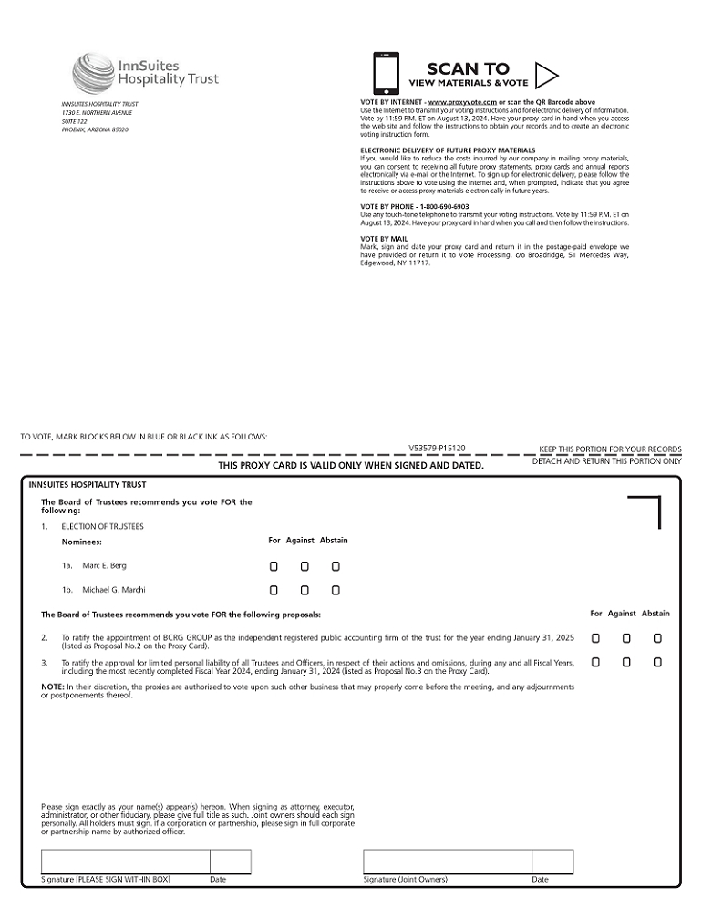 The accompanying proxy is solicited by the Board of Trustees of InnSuites Hospitality Trust (“IHT” or “the Trust”) for use at the Fiscal 2024 Annual Meeting of Shareholders (the “Annual Meeting”) to be held on Wednesday August 14, 2024, and any adjournments or postponements thereof. In addition to the solicitation of proxies by mail, our Trustees, officers, and regular employees may also solicit the return of proxies by regular or electronic mail, telephone or personal contact, for which they will not receive additional compensation. We will pay all costs of soliciting proxies and will reimburse brokers or other persons holding our Shares of Beneficial Interest (“Shares”) in their names or in the names of their nominees for their reasonable expenses in forwarding proxy materials to the beneficial owners of such Shares.