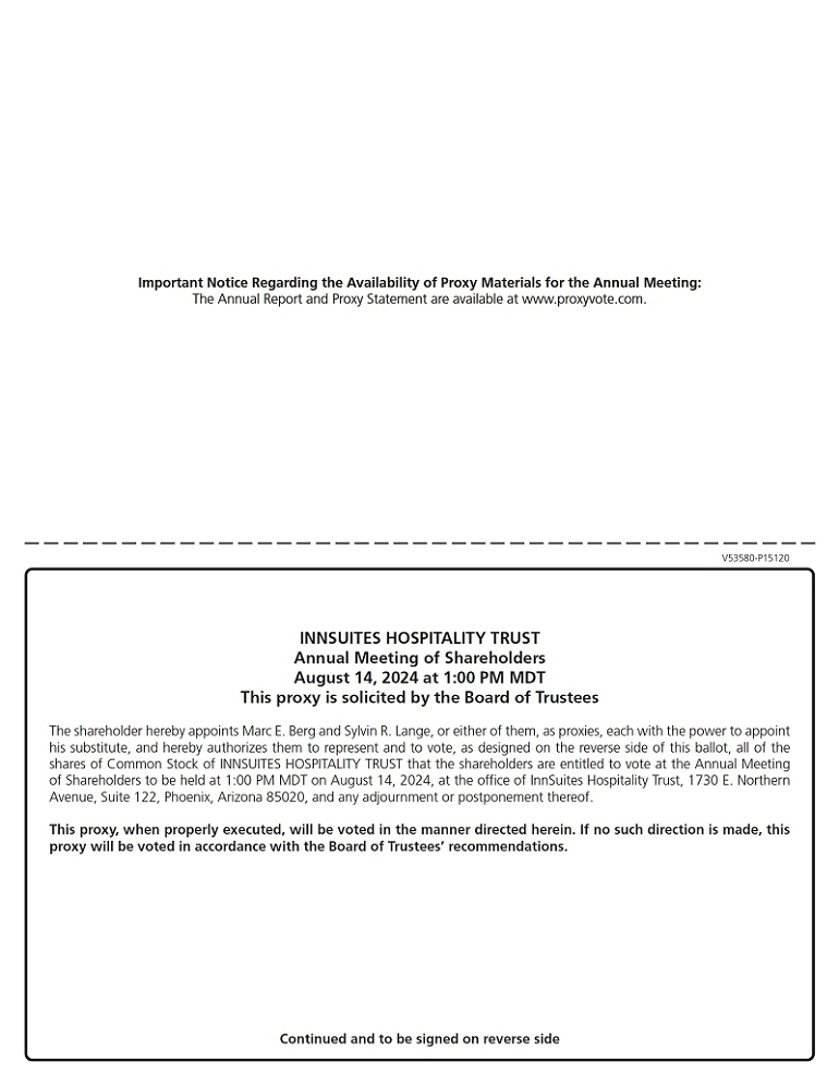 Notice is hereby given that the Fiscal 2024 Annual Meeting of Shareholders of InnSuites Hospitality Trust (the “Trust”) will be held at the InnSuites Hospitality Trust corporate offices located at 1730 E. Northern Avenue, Suite 122, Phoenix, Arizona 85020 (phone: 602-944-1500) on Wednesday August 14, 2024, at 1:00 P.M., local time, for the purpose of considering and acting upon the following matters: