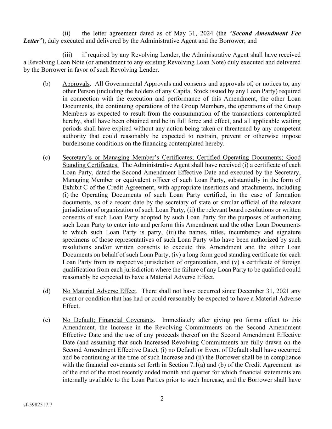 2 sf-5982517.7 (ii) the letter agreement dated as of May 31, 2024 (the “Second Amendment Fee Letter”), duly executed and delivered by the Administrative Agent and the Borrower; and (iii) if required by any Revolving Lender, the Administrative Agent shall have received a Revolving Loan Note (or amendment to any existing Revolving Loan Note) duly executed and delivered by the Borrower in favor of such Revolving Lender. (b) Approvals. All Governmental Approvals and consents and approvals of, or notices to, any other Person (including the holders of any Capital Stock issued by any Loan Party) required in connection with the execution and performance of this Amendment, the other Loan Documents, the continuing operations of the Group Members, the operations of the Group Members as expected to result from the consummation of the transactions contemplated hereby, shall have been obtained and be in full force and effect, and all applicable waiting periods shall have expired without any action being taken or threatened by any competent authority that could reasonably be expected to restrain, prevent or otherwise impose burdensome conditions on the financing contemplated hereby. (c) Secretary’s or Managing Member’s Certificates; Certified Operating Documents; Good Standing Certificates. The Administrative Agent shall have received (i) a certificate of each Loan Party, dated the Second Amendment Effective Date and executed by the Secretary, Managing Member or equivalent officer of such Loan Party, substantially in the form of Exhibit C of the Credit Agreement, with appropriate insertions and attachments, including (i) the Operating Documents of such Loan Party certified, in the case of formation documents, as of a recent date by the secretary of state or similar official of the relevant jurisdiction of organization of such Loan Party, (ii) the relevant board resolutions or written consents of such Loan Party adopted by such Loan Party for the purposes of authorizing such Loan Party to enter into and perform this Amendment and the other Loan Documents to which such Loan Party is party, (iii) the names, titles, incumbency and signature specimens of those representatives of such Loan Party who have been authorized by such resolutions and/or written consents to execute this Amendment and the other Loan Documents on behalf of such Loan Party, (iv) a long form good standing certificate for each Loan Party from its respective jurisdiction of organization, and (v) a certificate of foreign qualification from each jurisdiction where the failure of any Loan Party to be qualified could reasonably be expected to have a Material Adverse Effect. (d) No Material Adverse Effect. There shall not have occurred since December 31, 2021 any event or condition that has had or could reasonably be expected to have a Material Adverse Effect. (e) No Default; Financial Covenants. Immediately after giving pro forma effect to this Amendment, the Increase in the Revolving Commitments on the Second Amendment Effective Date and the use of any proceeds thereof on the Second Amendment Effective Date (and assuming that such Increased Revolving Commitments are fully drawn on the Second Amendment Effective Date), (i) no Default or Event of Default shall have occurred and be continuing at the time of such Increase and (ii) the Borrower shall be in compliance with the financial covenants set forth in Section 7.1(a) and (b) of the Credit Agreement as of the end of the most recently ended month and quarter for which financial statements are internally available to the Loan Parties prior to such Increase, and the Borrower shall have