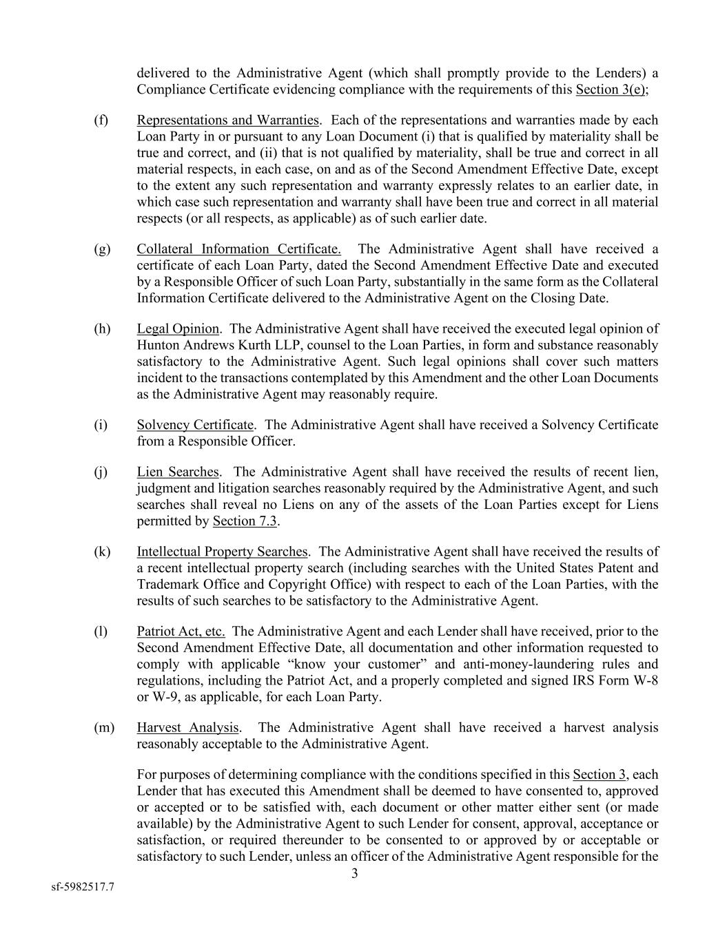 3 sf-5982517.7 delivered to the Administrative Agent (which shall promptly provide to the Lenders) a Compliance Certificate evidencing compliance with the requirements of this Section 3(e); (f) Representations and Warranties. Each of the representations and warranties made by each Loan Party in or pursuant to any Loan Document (i) that is qualified by materiality shall be true and correct, and (ii) that is not qualified by materiality, shall be true and correct in all material respects, in each case, on and as of the Second Amendment Effective Date, except to the extent any such representation and warranty expressly relates to an earlier date, in which case such representation and warranty shall have been true and correct in all material respects (or all respects, as applicable) as of such earlier date. (g) Collateral Information Certificate. The Administrative Agent shall have received a certificate of each Loan Party, dated the Second Amendment Effective Date and executed by a Responsible Officer of such Loan Party, substantially in the same form as the Collateral Information Certificate delivered to the Administrative Agent on the Closing Date. (h) Legal Opinion. The Administrative Agent shall have received the executed legal opinion of Hunton Andrews Kurth LLP, counsel to the Loan Parties, in form and substance reasonably satisfactory to the Administrative Agent. Such legal opinions shall cover such matters incident to the transactions contemplated by this Amendment and the other Loan Documents as the Administrative Agent may reasonably require. (i) Solvency Certificate. The Administrative Agent shall have received a Solvency Certificate from a Responsible Officer. (j) Lien Searches. The Administrative Agent shall have received the results of recent lien, judgment and litigation searches reasonably required by the Administrative Agent, and such searches shall reveal no Liens on any of the assets of the Loan Parties except for Liens permitted by Section 7.3. (k) Intellectual Property Searches. The Administrative Agent shall have received the results of a recent intellectual property search (including searches with the United States Patent and Trademark Office and Copyright Office) with respect to each of the Loan Parties, with the results of such searches to be satisfactory to the Administrative Agent. (l) Patriot Act, etc. The Administrative Agent and each Lender shall have received, prior to the Second Amendment Effective Date, all documentation and other information requested to comply with applicable “know your customer” and anti-money-laundering rules and regulations, including the Patriot Act, and a properly completed and signed IRS Form W-8 or W-9, as applicable, for each Loan Party. (m) Harvest Analysis. The Administrative Agent shall have received a harvest analysis reasonably acceptable to the Administrative Agent. For purposes of determining compliance with the conditions specified in this Section 3, each Lender that has executed this Amendment shall be deemed to have consented to, approved or accepted or to be satisfied with, each document or other matter either sent (or made available) by the Administrative Agent to such Lender for consent, approval, acceptance or satisfaction, or required thereunder to be consented to or approved by or acceptable or satisfactory to such Lender, unless an officer of the Administrative Agent responsible for the