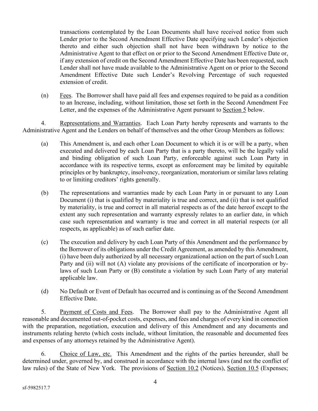 4 sf-5982517.7 transactions contemplated by the Loan Documents shall have received notice from such Lender prior to the Second Amendment Effective Date specifying such Lender’s objection thereto and either such objection shall not have been withdrawn by notice to the Administrative Agent to that effect on or prior to the Second Amendment Effective Date or, if any extension of credit on the Second Amendment Effective Date has been requested, such Lender shall not have made available to the Administrative Agent on or prior to the Second Amendment Effective Date such Lender’s Revolving Percentage of such requested extension of credit. (n) Fees. The Borrower shall have paid all fees and expenses required to be paid as a condition to an Increase, including, without limitation, those set forth in the Second Amendment Fee Letter, and the expenses of the Administrative Agent pursuant to Section 5 below. 4. Representations and Warranties. Each Loan Party hereby represents and warrants to the Administrative Agent and the Lenders on behalf of themselves and the other Group Members as follows: (a) This Amendment is, and each other Loan Document to which it is or will be a party, when executed and delivered by each Loan Party that is a party thereto, will be the legally valid and binding obligation of such Loan Party, enforceable against such Loan Party in accordance with its respective terms, except as enforcement may be limited by equitable principles or by bankruptcy, insolvency, reorganization, moratorium or similar laws relating to or limiting creditors’ rights generally. (b) The representations and warranties made by each Loan Party in or pursuant to any Loan Document (i) that is qualified by materiality is true and correct, and (ii) that is not qualified by materiality, is true and correct in all material respects as of the date hereof except to the extent any such representation and warranty expressly relates to an earlier date, in which case such representation and warranty is true and correct in all material respects (or all respects, as applicable) as of such earlier date. (c) The execution and delivery by each Loan Party of this Amendment and the performance by the Borrower of its obligations under the Credit Agreement, as amended by this Amendment, (i) have been duly authorized by all necessary organizational action on the part of such Loan Party and (ii) will not (A) violate any provisions of the certificate of incorporation or by- laws of such Loan Party or (B) constitute a violation by such Loan Party of any material applicable law. (d) No Default or Event of Default has occurred and is continuing as of the Second Amendment Effective Date. 5. Payment of Costs and Fees. The Borrower shall pay to the Administrative Agent all reasonable and documented out-of-pocket costs, expenses, and fees and charges of every kind in connection with the preparation, negotiation, execution and delivery of this Amendment and any documents and instruments relating hereto (which costs include, without limitation, the reasonable and documented fees and expenses of any attorneys retained by the Administrative Agent). 6. Choice of Law, etc. This Amendment and the rights of the parties hereunder, shall be determined under, governed by, and construed in accordance with the internal laws (and not the conflict of law rules) of the State of New York. The provisions of Section 10.2 (Notices), Section 10.5 (Expenses;