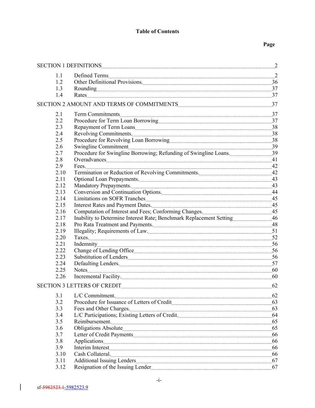 Table of Contents Page -i- sf-5982523.1-5982523.9 SECTION 1 DEFINITIONS 2 1.1 Defined Terms 2 1.2 Other Definitional Provisions. 36 1.3 Rounding 37 1.4 Rates 37 SECTION 2 AMOUNT AND TERMS OF COMMITMENTS 37 2.1 Term Commitments 37 2.2 Procedure for Term Loan Borrowing 37 2.3 Repayment of Term Loans 38 2.4 Revolving Commitments. 38 2.5 Procedure for Revolving Loan Borrowing 38 2.6 Swingline Commitment 39 2.7 Procedure for Swingline Borrowing; Refunding of Swingline Loans. 39 2.8 Overadvances 41 2.9 Fees. 42 2.10 Termination or Reduction of Revolving Commitments. 42 2.11 Optional Loan Prepayments. 43 2.12 Mandatory Prepayments. 43 2.13 Conversion and Continuation Options. 44 2.14 Limitations on SOFR Tranches 45 2.15 Interest Rates and Payment Dates. 45 2.16 Computation of Interest and Fees; Conforming Changes. 45 2.17 Inability to Determine Interest Rate; Benchmark Replacement Setting 46 2.18 Pro Rata Treatment and Payments. 48 2.19 Illegality; Requirements of Law. 51 2.20 Taxes. 52 2.21 Indemnity 56 2.22 Change of Lending Office 56 2.23 Substitution of Lenders 56 2.24 Defaulting Lenders. 57 2.25 Notes 60 2.26 Incremental Facility. 60 SECTION 3 LETTERS OF CREDIT 62 3.1 L/C Commitment. 62 3.2 Procedure for Issuance of Letters of Credit 63 3.3 Fees and Other Charges. 63 3.4 L/C Participations; Existing Letters of Credit. 64 3.5 Reimbursement. 65 3.6 Obligations Absolute 65 3.7 Letter of Credit Payments 66 3.8 Applications 66 3.9 Interim Interest 66 3.10 Cash Collateral. 66 3.11 Additional Issuing Lenders 67 3.12 Resignation of the Issuing Lender 67
