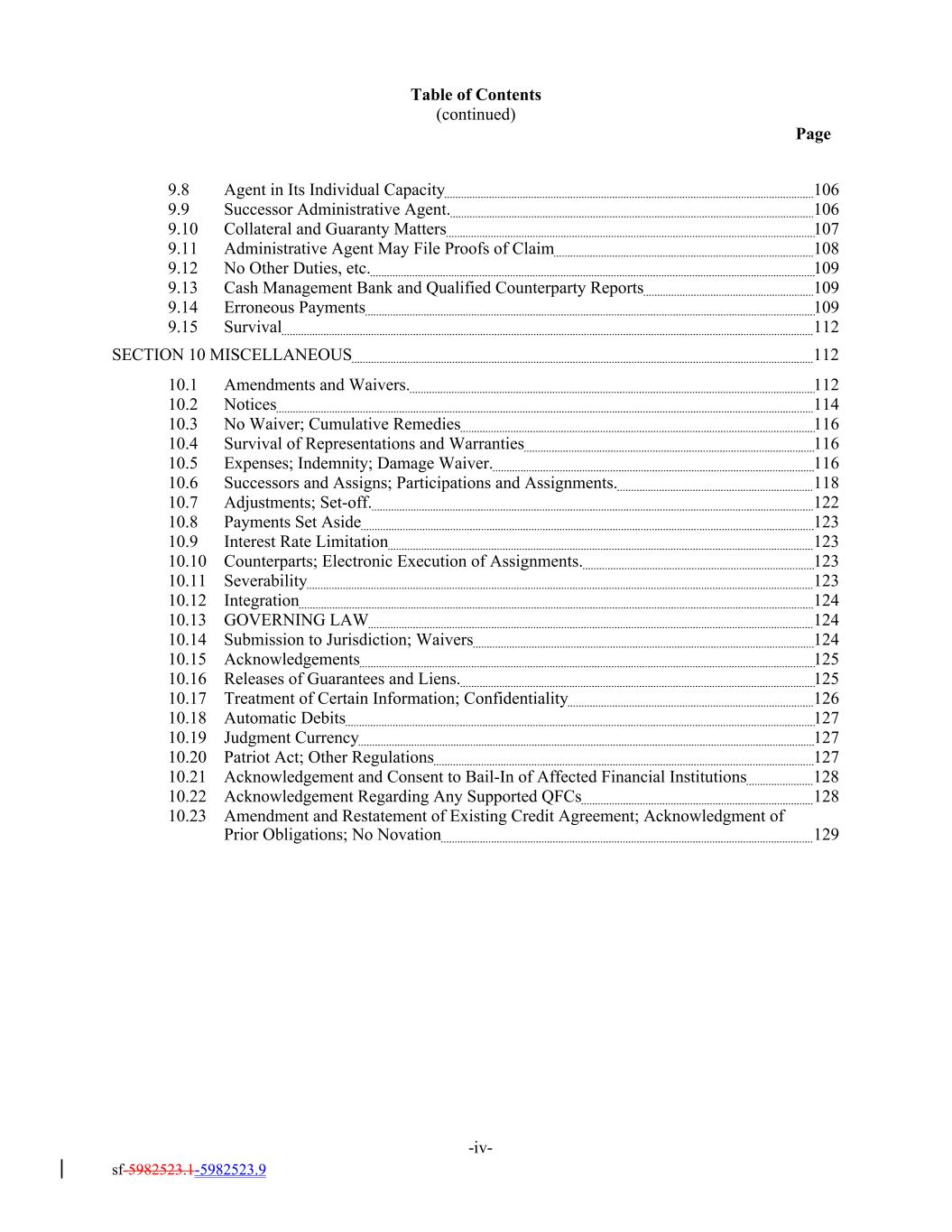 Table of Contents (continued) Page -iv- sf-5982523.1-5982523.9 9.8 Agent in Its Individual Capacity 106 9.9 Successor Administrative Agent. 106 9.10 Collateral and Guaranty Matters 107 9.11 Administrative Agent May File Proofs of Claim 108 9.12 No Other Duties, etc. 109 9.13 Cash Management Bank and Qualified Counterparty Reports 109 9.14 Erroneous Payments 109 9.15 Survival 112 SECTION 10 MISCELLANEOUS 112 10.1 Amendments and Waivers. 112 10.2 Notices 114 10.3 No Waiver; Cumulative Remedies 116 10.4 Survival of Representations and Warranties 116 10.5 Expenses; Indemnity; Damage Waiver. 116 10.6 Successors and Assigns; Participations and Assignments. 118 10.7 Adjustments; Set-off. 122 10.8 Payments Set Aside 123 10.9 Interest Rate Limitation 123 10.10 Counterparts; Electronic Execution of Assignments. 123 10.11 Severability 123 10.12 Integration 124 10.13 GOVERNING LAW 124 10.14 Submission to Jurisdiction; Waivers 124 10.15 Acknowledgements 125 10.16 Releases of Guarantees and Liens. 125 10.17 Treatment of Certain Information; Confidentiality 126 10.18 Automatic Debits 127 10.19 Judgment Currency 127 10.20 Patriot Act; Other Regulations 127 10.21 Acknowledgement and Consent to Bail-In of Affected Financial Institutions 128 10.22 Acknowledgement Regarding Any Supported QFCs 128 10.23 Amendment and Restatement of Existing Credit Agreement; Acknowledgment of Prior Obligations; No Novation 129