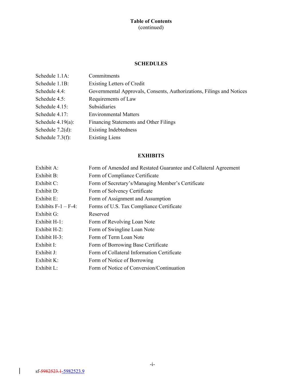 Table of Contents (continued) -i- sf-5982523.1-5982523.9 SCHEDULES Schedule 1.1A: Commitments Schedule 1.1B: Existing Letters of Credit Schedule 4.4: Governmental Approvals, Consents, Authorizations, Filings and Notices Schedule 4.5: Requirements of Law Schedule 4.15: Subsidiaries Schedule 4.17: Environmental Matters Schedule 4.19(a): Financing Statements and Other Filings Schedule 7.2(d): Existing Indebtedness Schedule 7.3(f): Existing Liens EXHIBITS Exhibit A: Form of Amended and Restated Guarantee and Collateral Agreement Exhibit B: Form of Compliance Certificate Exhibit C: Form of Secretary’s/Managing Member’s Certificate Exhibit D: Form of Solvency Certificate Exhibit E: Form of Assignment and Assumption Exhibits F-1 – F-4: Forms of U.S. Tax Compliance Certificate Exhibit G: Reserved Exhibit H-1: Form of Revolving Loan Note Exhibit H-2: Form of Swingline Loan Note Exhibit H-3: Form of Term Loan Note Exhibit I: Form of Borrowing Base Certificate Exhibit J: Form of Collateral Information Certificate Exhibit K: Form of Notice of Borrowing Exhibit L: Form of Notice of Conversion/Continuation