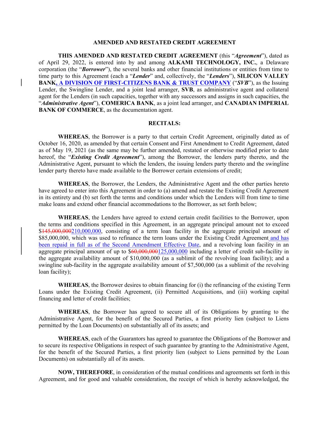 Conformed through FirstSecond Amendment Execution Version sf-5982523.1-5982523.9 SENIOR SECURED CREDIT FACILITIES AMENDED AND RESTATED CREDIT AGREEMENT dated as of April 29, 2022, among ALKAMI TECHNOLOGY, INC., as the Borrower, THE SEVERAL LENDERS FROM TIME TO TIME PARTY HERETO, SILICON VALLEY BANK, A DIVISION OF FIRST-CITIZENS BANK & TRUST COMPANY, as Administrative Agent, Issuing Lender, Swingline Lender, and Joint Lead Arranger COMERICA BANK, as Joint Lead Arranger and CANADIAN IMPERIAL BANK OF COMMERCE, as Documentation Agent
