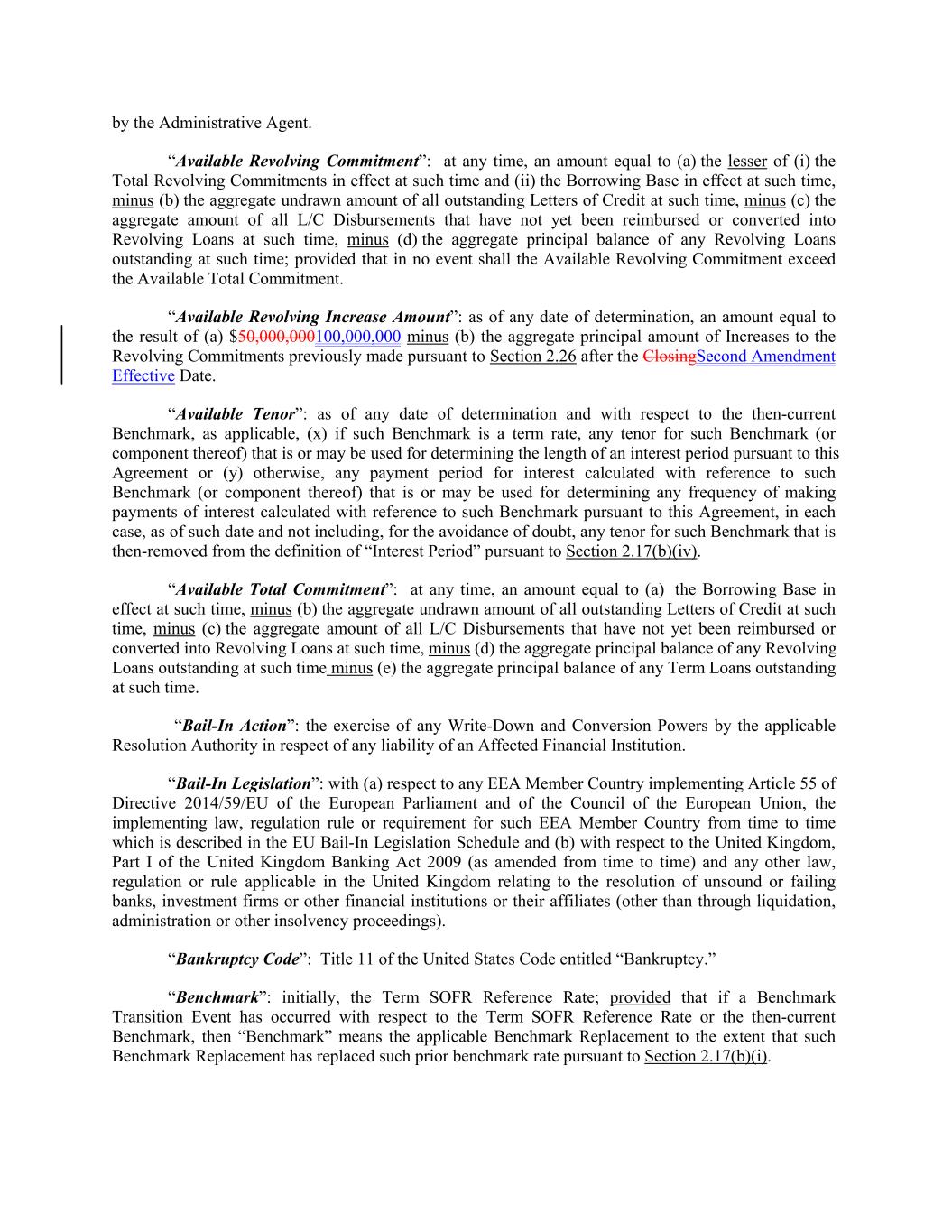 by the Administrative Agent. “Available Revolving Commitment”: at any time, an amount equal to (a) the lesser of (i) the Total Revolving Commitments in effect at such time and (ii) the Borrowing Base in effect at such time, minus (b) the aggregate undrawn amount of all outstanding Letters of Credit at such time, minus (c) the aggregate amount of all L/C Disbursements that have not yet been reimbursed or converted into Revolving Loans at such time, minus (d) the aggregate principal balance of any Revolving Loans outstanding at such time; provided that in no event shall the Available Revolving Commitment exceed the Available Total Commitment. “Available Revolving Increase Amount”: as of any date of determination, an amount equal to the result of (a) $50,000,000100,000,000 minus (b) the aggregate principal amount of Increases to the Revolving Commitments previously made pursuant to Section 2.26 after the ClosingSecond Amendment Effective Date. “Available Tenor”: as of any date of determination and with respect to the then-current Benchmark, as applicable, (x) if such Benchmark is a term rate, any tenor for such Benchmark (or component thereof) that is or may be used for determining the length of an interest period pursuant to this Agreement or (y) otherwise, any payment period for interest calculated with reference to such Benchmark (or component thereof) that is or may be used for determining any frequency of making payments of interest calculated with reference to such Benchmark pursuant to this Agreement, in each case, as of such date and not including, for the avoidance of doubt, any tenor for such Benchmark that is then-removed from the definition of “Interest Period” pursuant to Section 2.17(b)(iv). “Available Total Commitment”: at any time, an amount equal to (a) the Borrowing Base in effect at such time, minus (b) the aggregate undrawn amount of all outstanding Letters of Credit at such time, minus (c) the aggregate amount of all L/C Disbursements that have not yet been reimbursed or converted into Revolving Loans at such time, minus (d) the aggregate principal balance of any Revolving Loans outstanding at such time minus (e) the aggregate principal balance of any Term Loans outstanding at such time. “Bail-In Action”: the exercise of any Write-Down and Conversion Powers by the applicable Resolution Authority in respect of any liability of an Affected Financial Institution. “Bail-In Legislation”: with (a) respect to any EEA Member Country implementing Article 55 of Directive 2014/59/EU of the European Parliament and of the Council of the European Union, the implementing law, regulation rule or requirement for such EEA Member Country from time to time which is described in the EU Bail-In Legislation Schedule and (b) with respect to the United Kingdom, Part I of the United Kingdom Banking Act 2009 (as amended from time to time) and any other law, regulation or rule applicable in the United Kingdom relating to the resolution of unsound or failing banks, investment firms or other financial institutions or their affiliates (other than through liquidation, administration or other insolvency proceedings). “Bankruptcy Code”: Title 11 of the United States Code entitled “Bankruptcy.” “Benchmark”: initially, the Term SOFR Reference Rate; provided that if a Benchmark Transition Event has occurred with respect to the Term SOFR Reference Rate or the then-current Benchmark, then “Benchmark” means the applicable Benchmark Replacement to the extent that such Benchmark Replacement has replaced such prior benchmark rate pursuant to Section 2.17(b)(i).