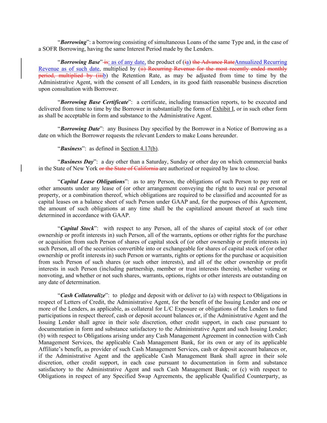“Borrowing”: a borrowing consisting of simultaneous Loans of the same Type and, in the case of a SOFR Borrowing, having the same Interest Period made by the Lenders. “Borrowing Base” is: as of any date, the product of (ia) the Advance RateAnnualized Recurring Revenue as of such date, multiplied by (ii) Recurring Revenue for the most recently ended monthly period, multiplied by (iiib) the Retention Rate, as may be adjusted from time to time by the Administrative Agent, with the consent of all Lenders, in its good faith reasonable business discretion upon consultation with Borrower. “Borrowing Base Certificate”: a certificate, including transaction reports, to be executed and delivered from time to time by the Borrower in substantially the form of Exhibit I, or in such other form as shall be acceptable in form and substance to the Administrative Agent. “Borrowing Date”: any Business Day specified by the Borrower in a Notice of Borrowing as a date on which the Borrower requests the relevant Lenders to make Loans hereunder. “Business”: as defined in Section 4.17(b). “Business Day”: a day other than a Saturday, Sunday or other day on which commercial banks in the State of New York or the State of California are authorized or required by law to close. “Capital Lease Obligations”: as to any Person, the obligations of such Person to pay rent or other amounts under any lease of (or other arrangement conveying the right to use) real or personal property, or a combination thereof, which obligations are required to be classified and accounted for as capital leases on a balance sheet of such Person under GAAP and, for the purposes of this Agreement, the amount of such obligations at any time shall be the capitalized amount thereof at such time determined in accordance with GAAP. “Capital Stock”: with respect to any Person, all of the shares of capital stock of (or other ownership or profit interests in) such Person, all of the warrants, options or other rights for the purchase or acquisition from such Person of shares of capital stock of (or other ownership or profit interests in) such Person, all of the securities convertible into or exchangeable for shares of capital stock of (or other ownership or profit interests in) such Person or warrants, rights or options for the purchase or acquisition from such Person of such shares (or such other interests), and all of the other ownership or profit interests in such Person (including partnership, member or trust interests therein), whether voting or nonvoting, and whether or not such shares, warrants, options, rights or other interests are outstanding on any date of determination. “Cash Collateralize”: to pledge and deposit with or deliver to (a) with respect to Obligations in respect of Letters of Credit, the Administrative Agent, for the benefit of the Issuing Lender and one or more of the Lenders, as applicable, as collateral for L/C Exposure or obligations of the Lenders to fund participations in respect thereof, cash or deposit account balances or, if the Administrative Agent and the Issuing Lender shall agree in their sole discretion, other credit support, in each case pursuant to documentation in form and substance satisfactory to the Administrative Agent and such Issuing Lender; (b) with respect to Obligations arising under any Cash Management Agreement in connection with Cash Management Services, the applicable Cash Management Bank, for its own or any of its applicable Affiliate’s benefit, as provider of such Cash Management Services, cash or deposit account balances or, if the Administrative Agent and the applicable Cash Management Bank shall agree in their sole discretion, other credit support, in each case pursuant to documentation in form and substance satisfactory to the Administrative Agent and such Cash Management Bank; or (c) with respect to Obligations in respect of any Specified Swap Agreements, the applicable Qualified Counterparty, as